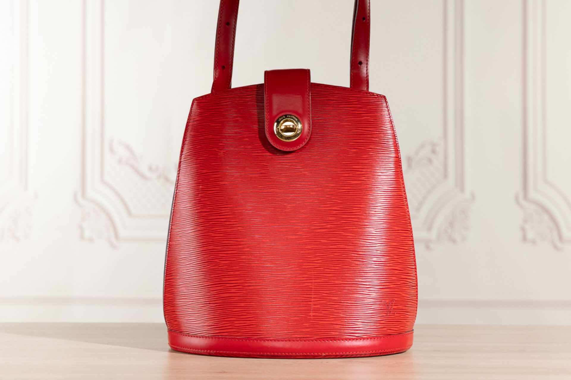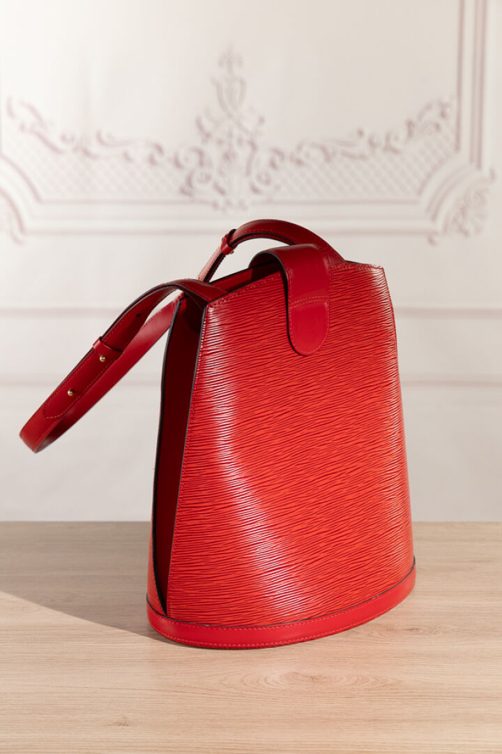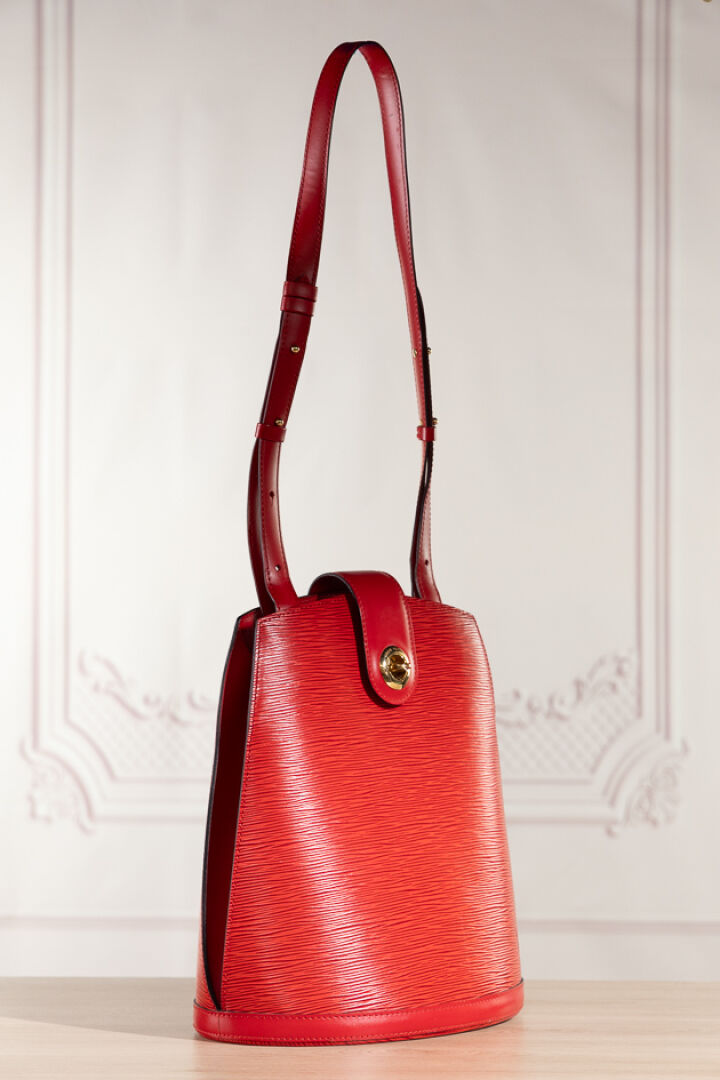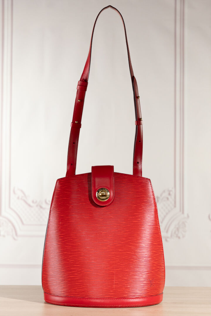LOUIS VUITTON - Sac "Cluny" en cuir épi rouge, fermoir pivotant en métal doré sur patte, anse bandoulière réglable, doublure en suédine rouge. Tampon Made in France, numéroté SP0936 Haut. : 30 - Long. : 26 cm Très légère griffure, bon état général