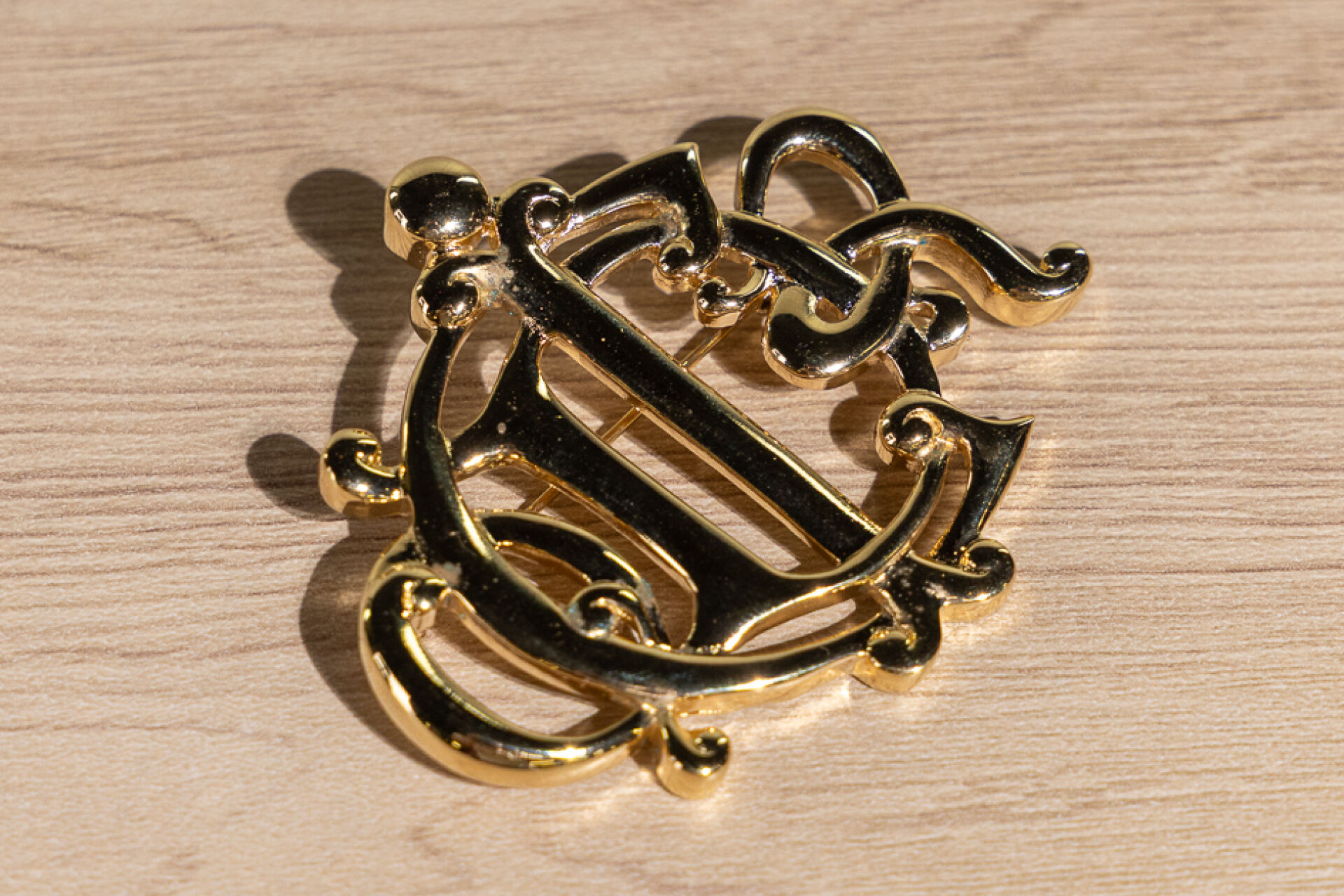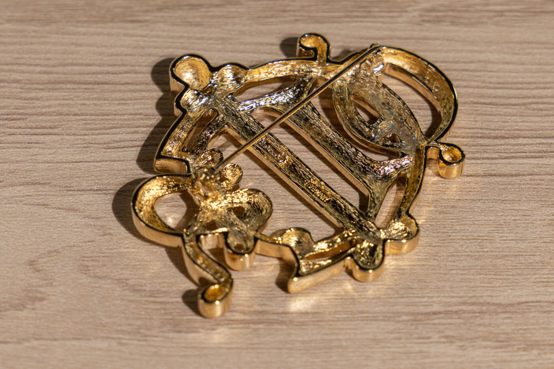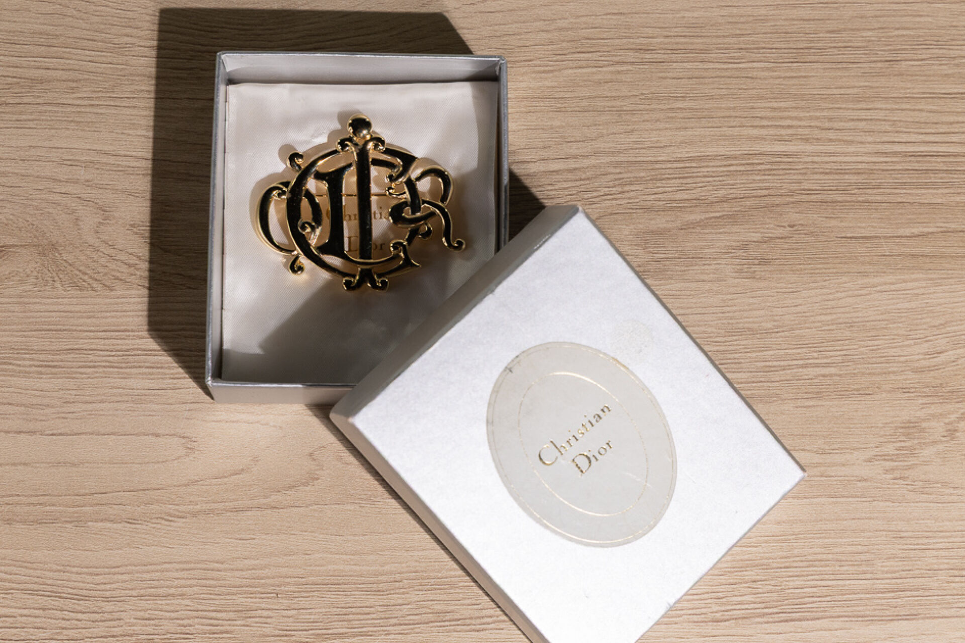 CHRISTIAN DIOR - Broche en métal doré siglée DIOR, lettres entremêlées. Haut. : 5,5 cm