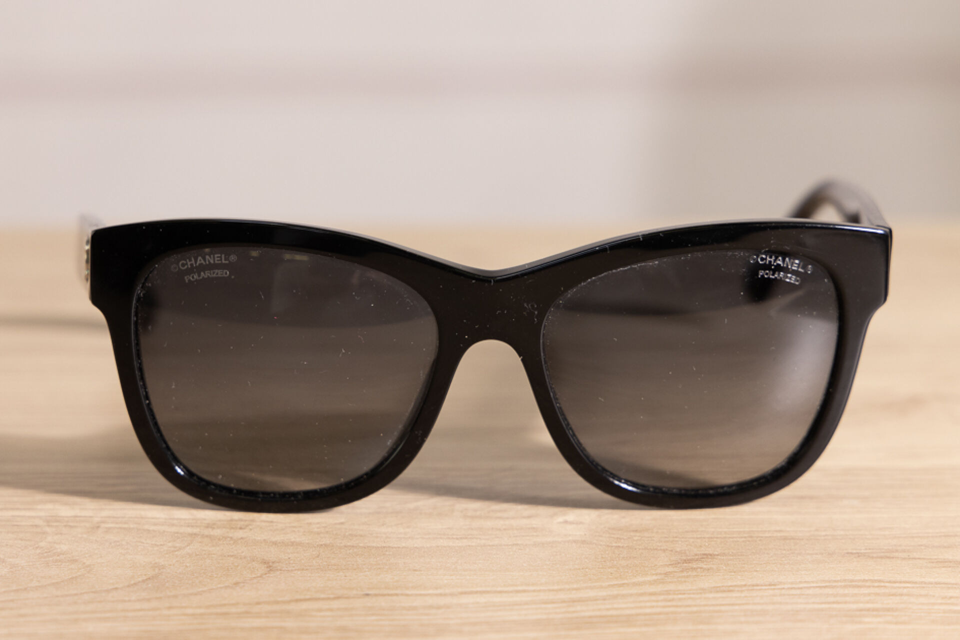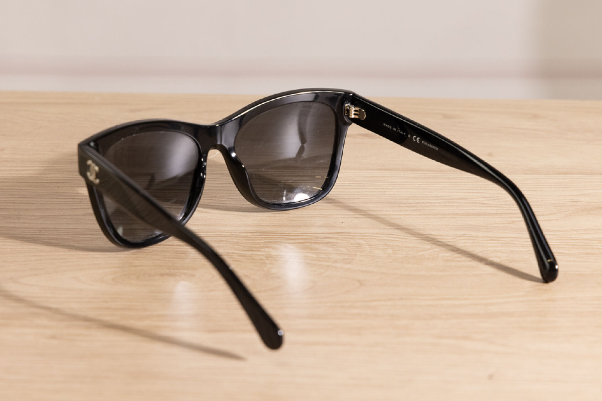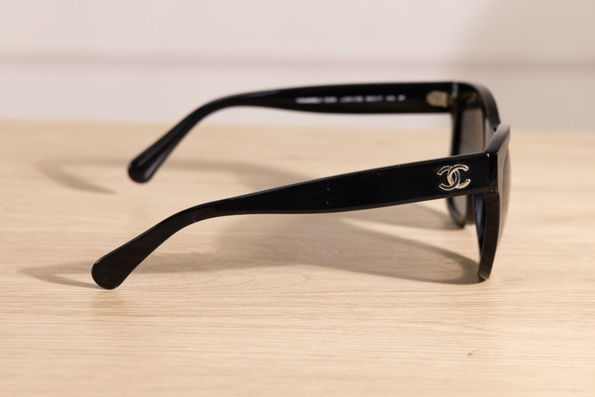 CHANEL - Paire de lunettes solaires en résine noire, verres fumés. Dans son étui et boite. Déjà portée, quelques griffures.
