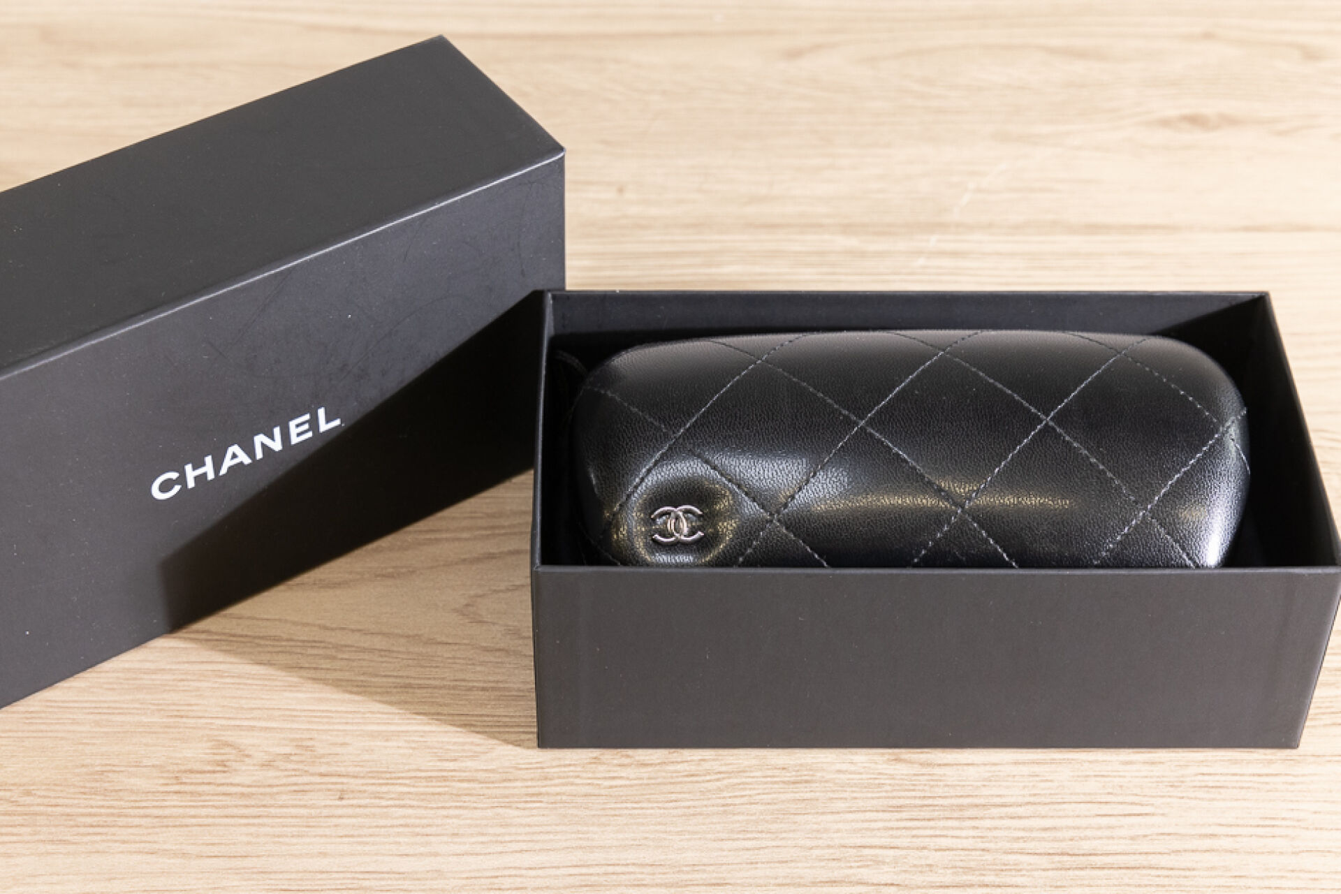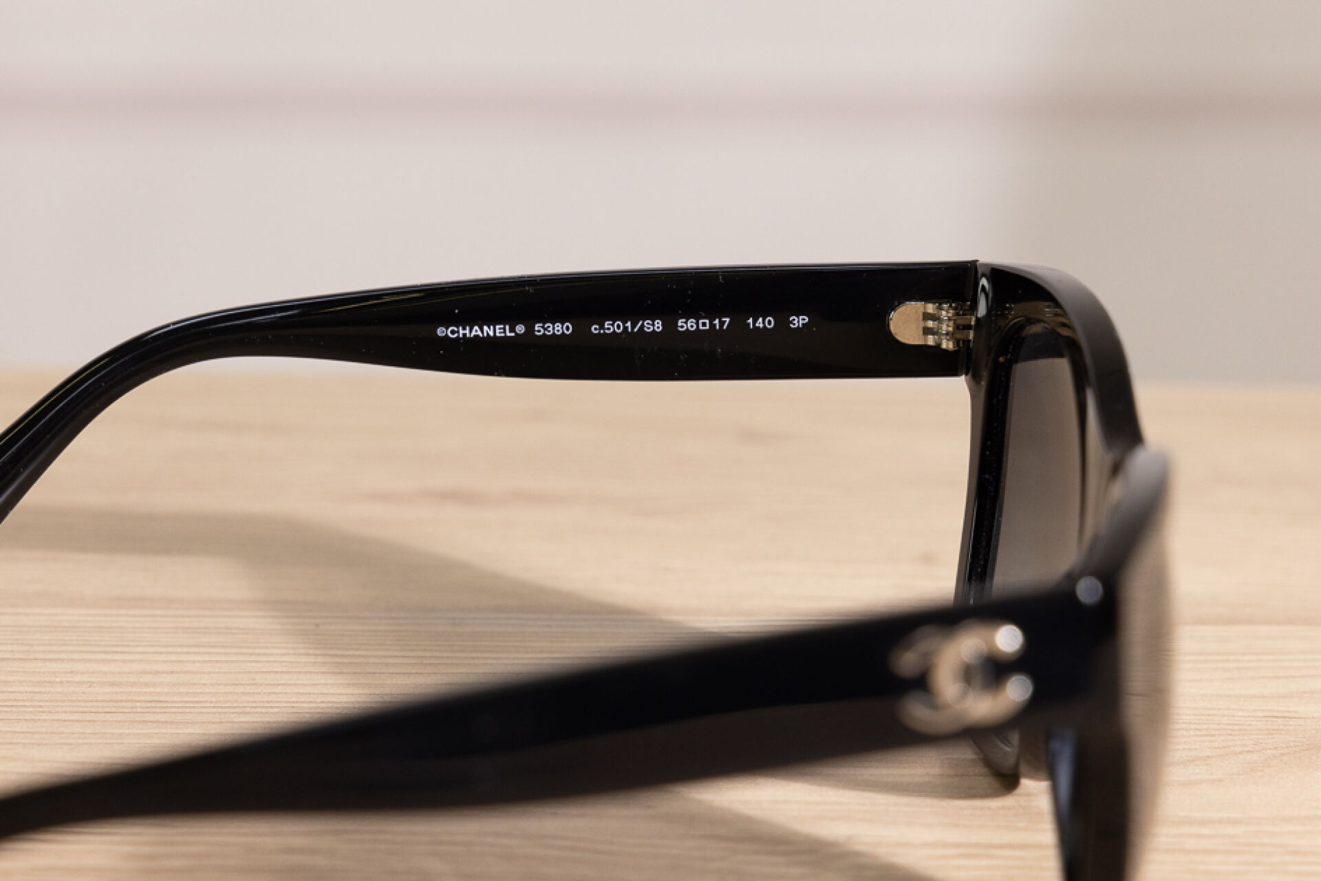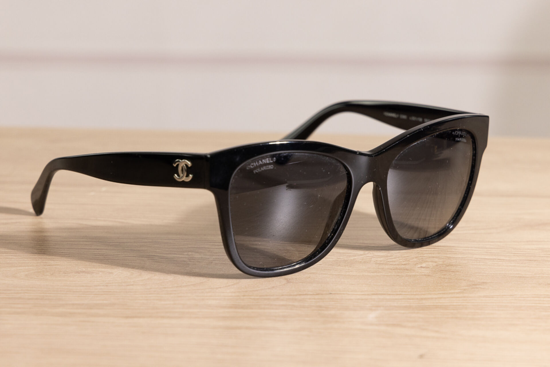 CHANEL - Paire de lunettes solaires en résine noire, verres fumés. Dans son étui et boite. Déjà portée, quelques griffures.