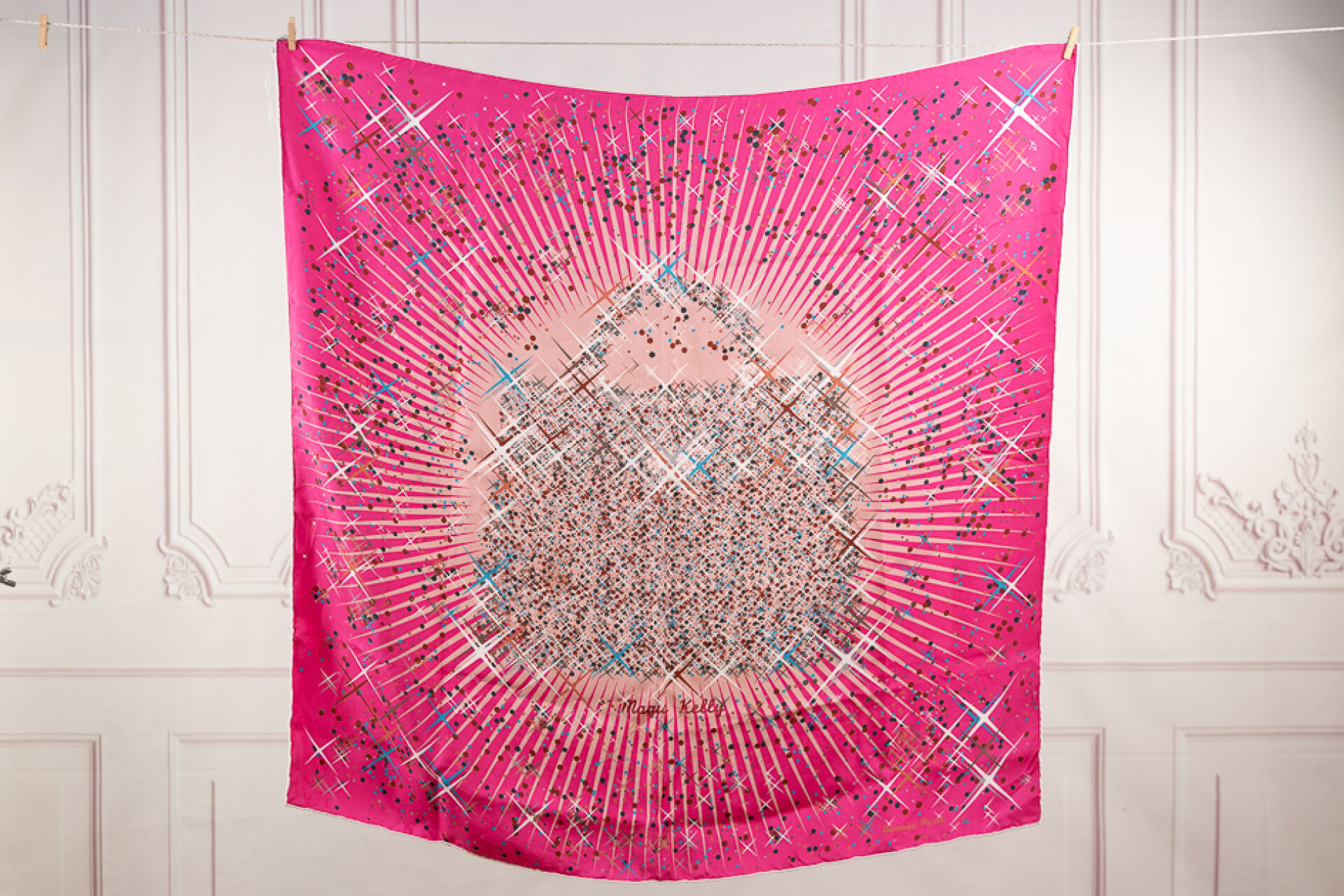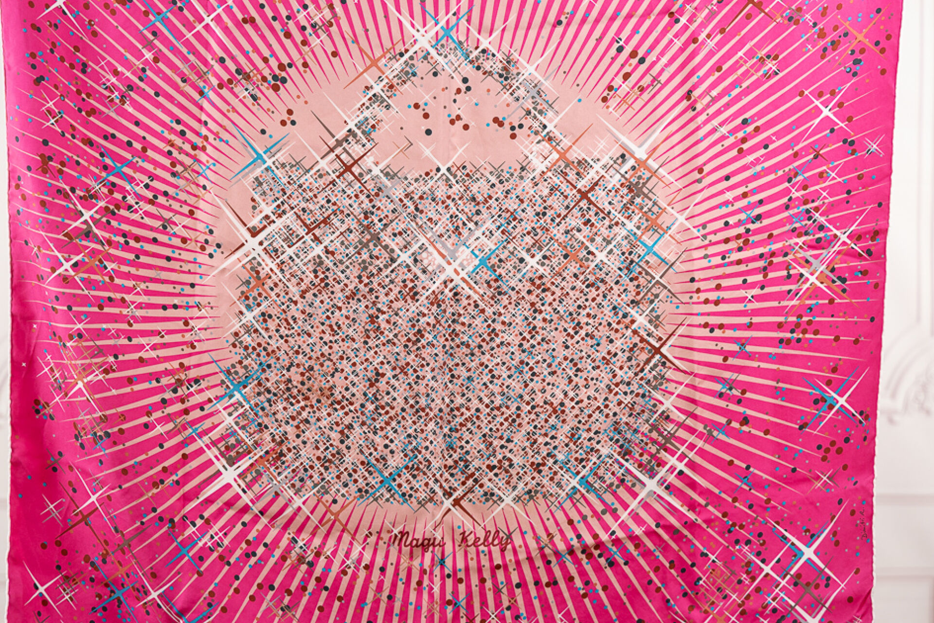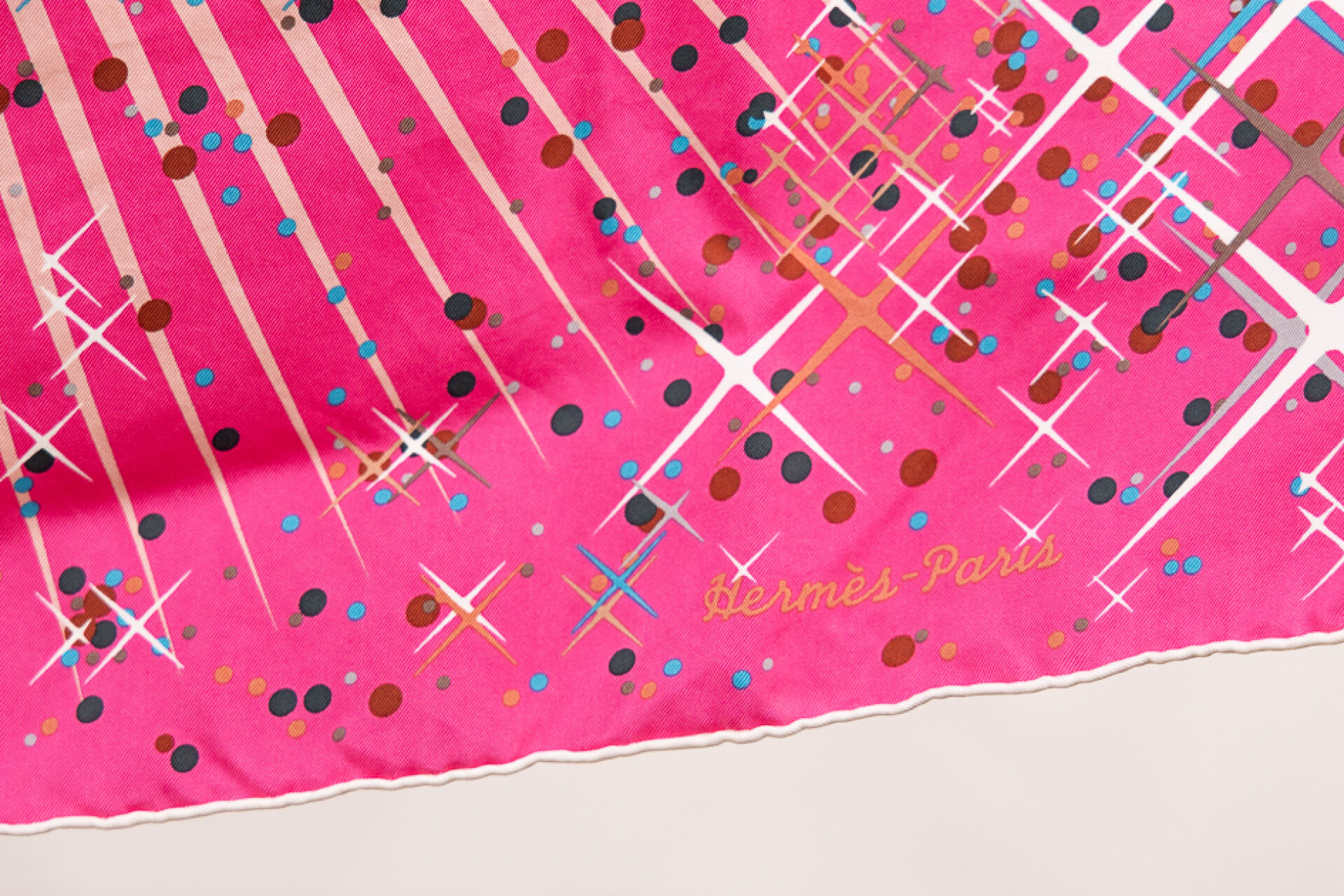 HERMES Paris - Carré en twill de soie imprimée, "Magic Kelly", multicolore sur fond rose, signé Dimitri Rybaltchenko. 90 x 90 cm Très bon état