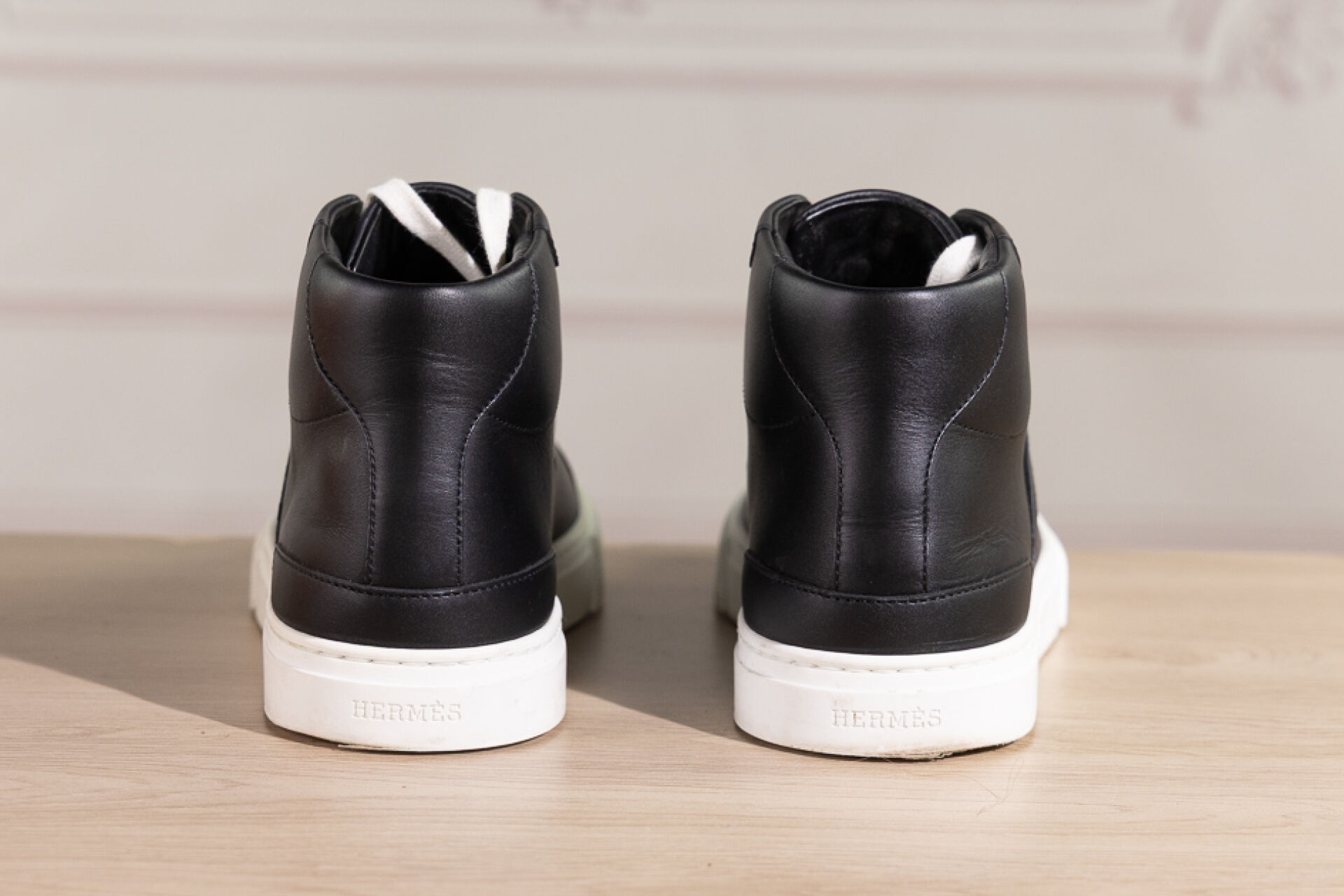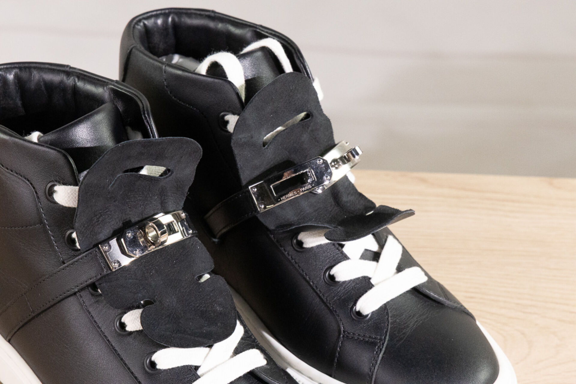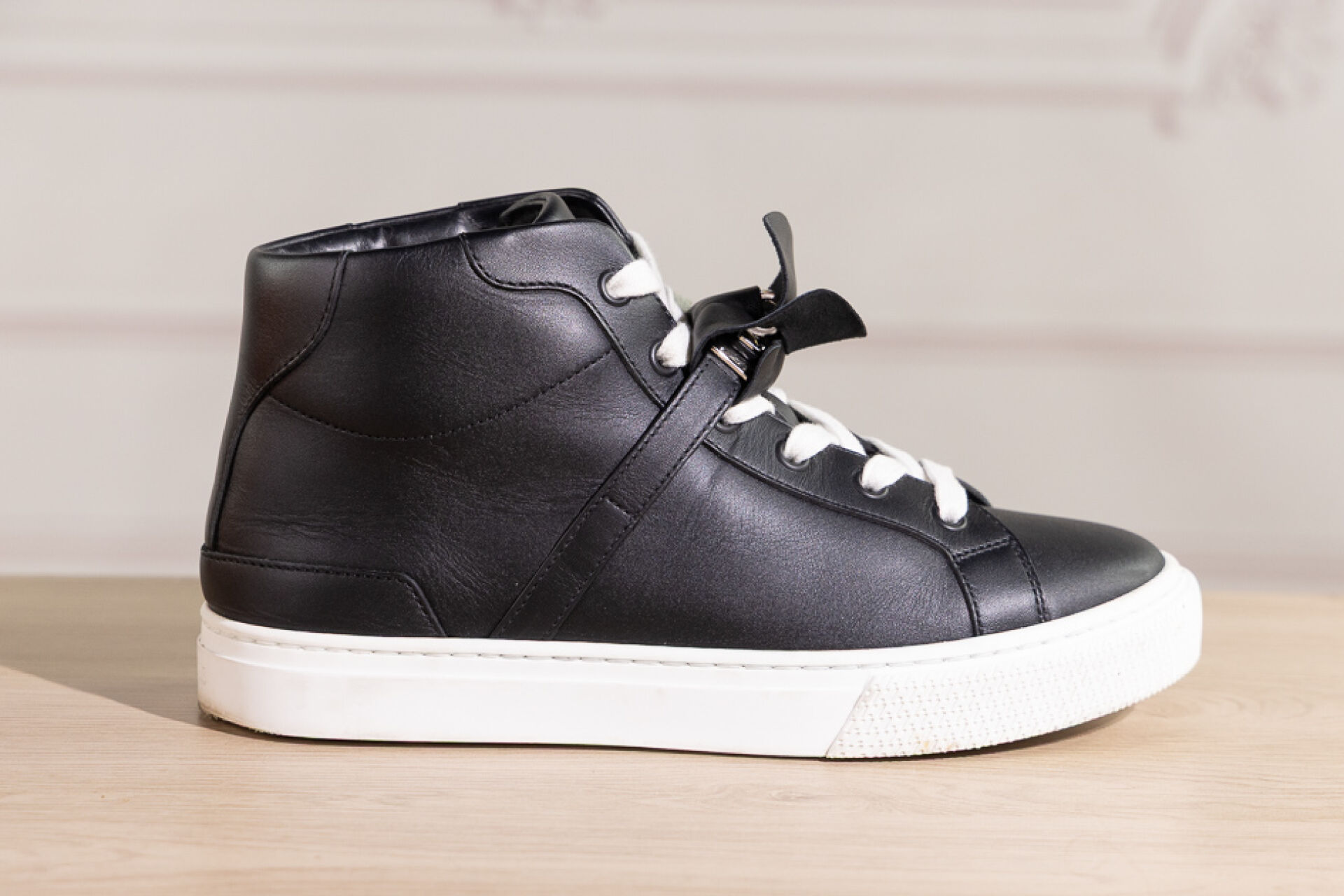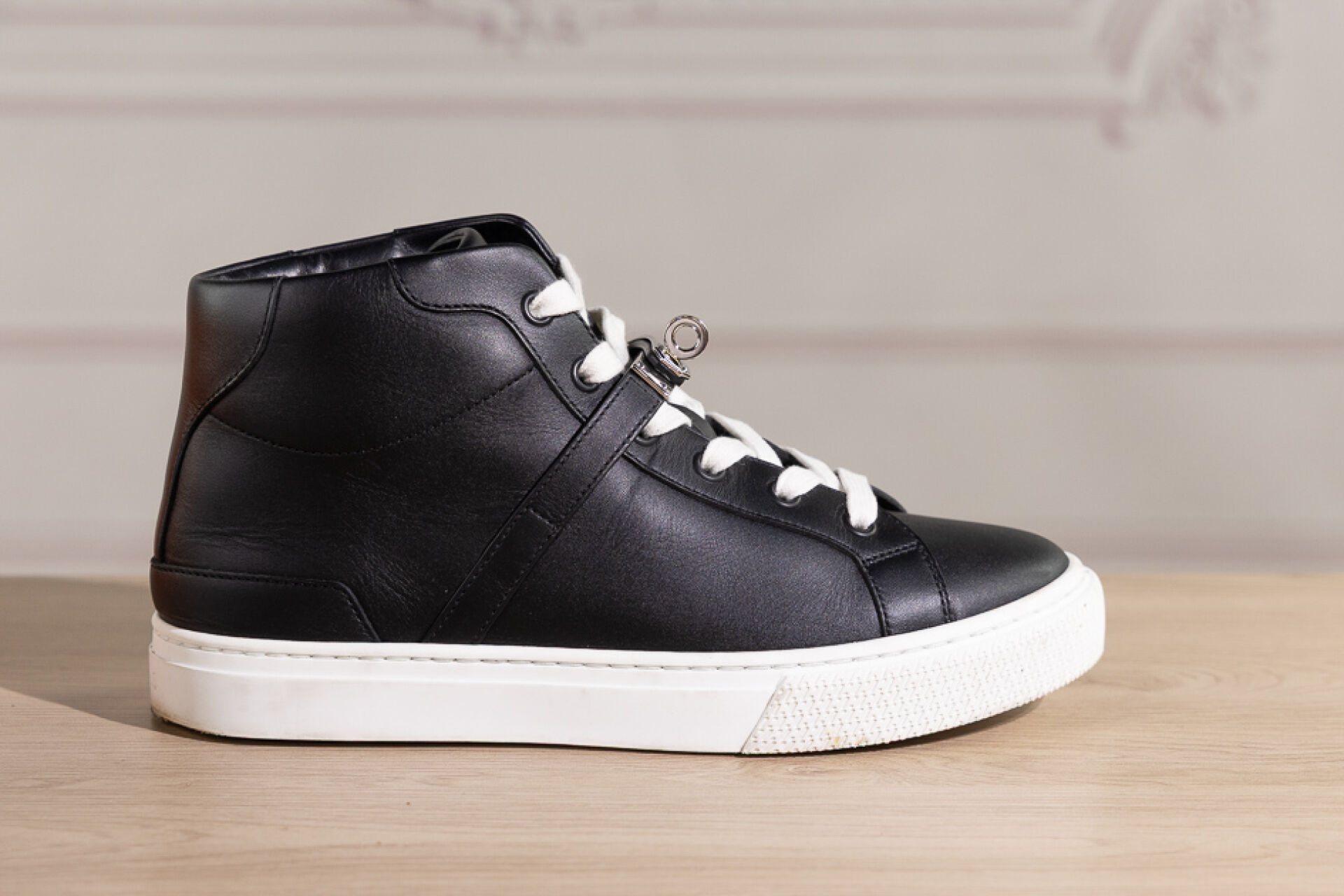 HERMES - Paire de sneakers montantes, modèle "Day" en cuir noir, semelles blanches, boucle Kelly métal argenté, lacets et paire de lacet supplémentaires. Dust Bag et boite. Pointure 36 Très bon état, portées une fois