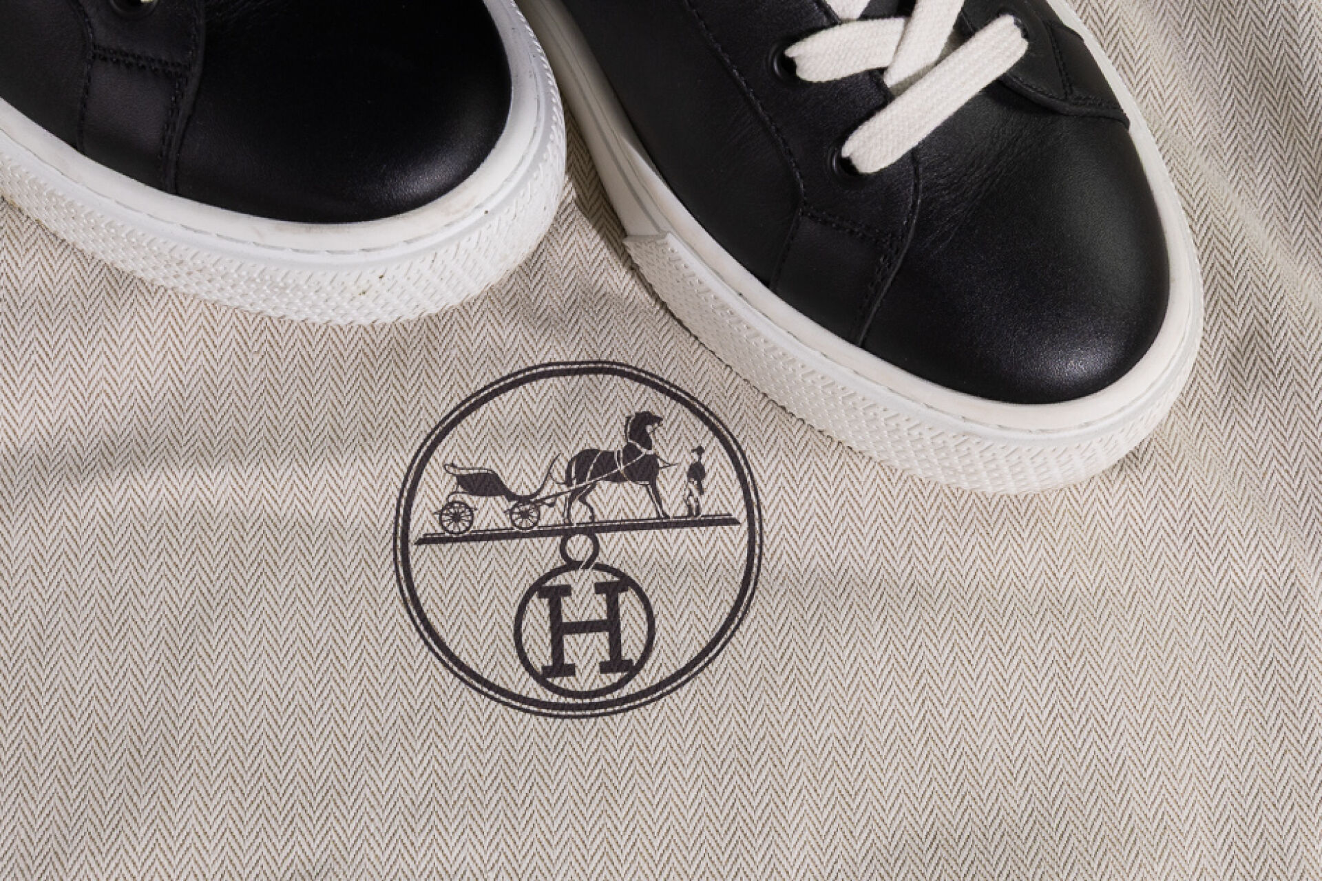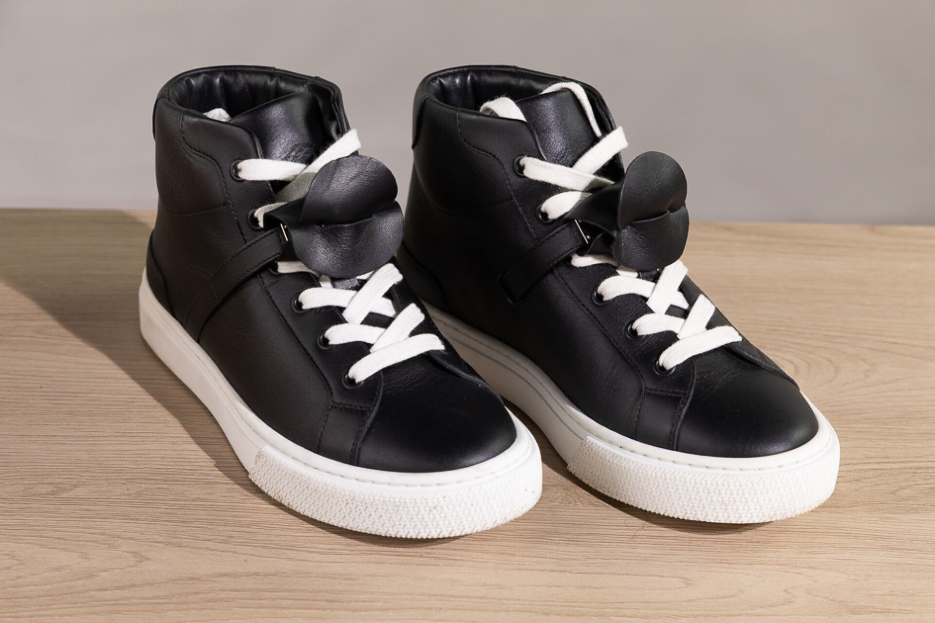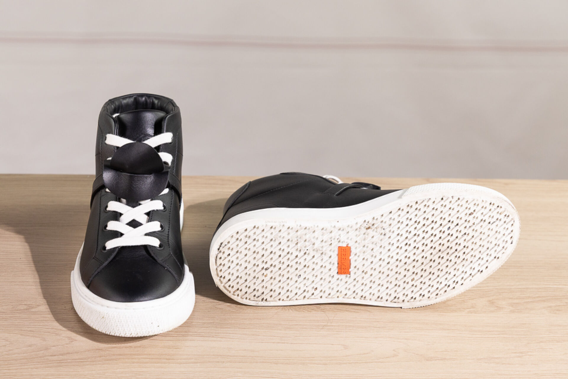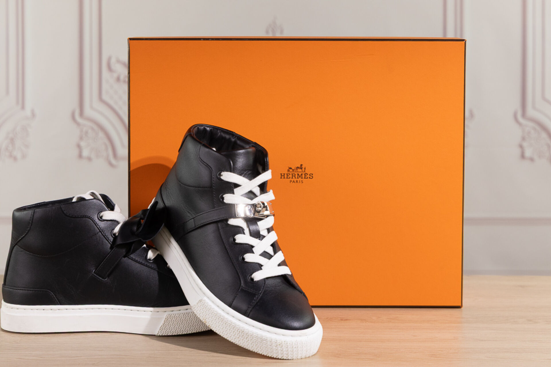 HERMES - Paire de sneakers montantes, modèle "Day" en cuir noir, semelles blanches, boucle Kelly métal argenté, lacets et paire de lacet supplémentaires. Dust Bag et boite. Pointure 36 Très bon état, portées une fois