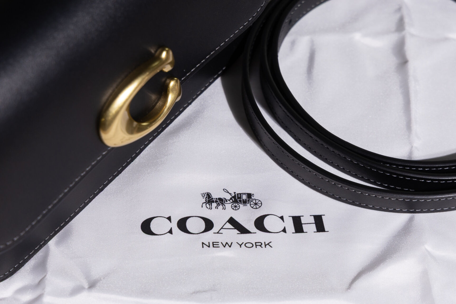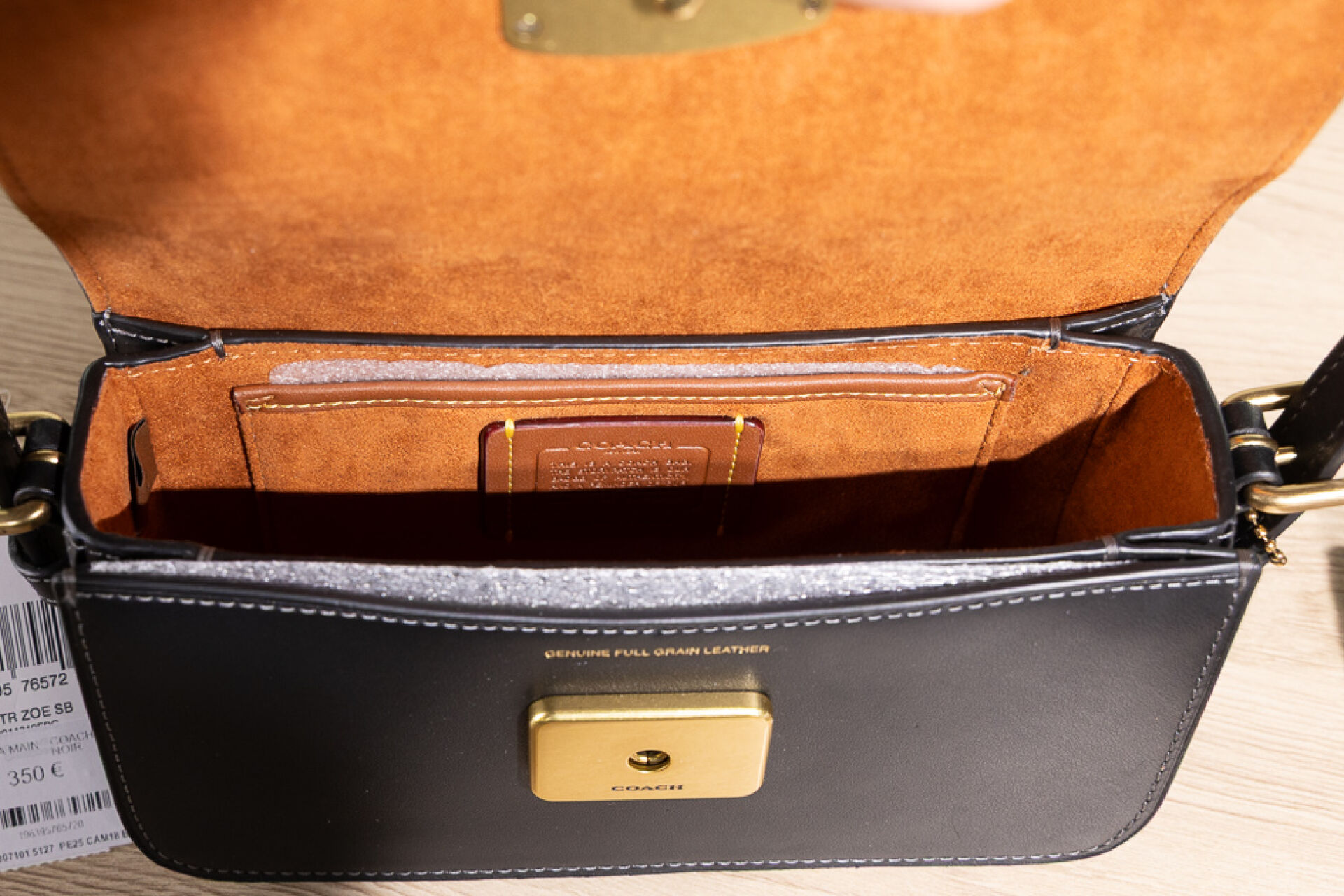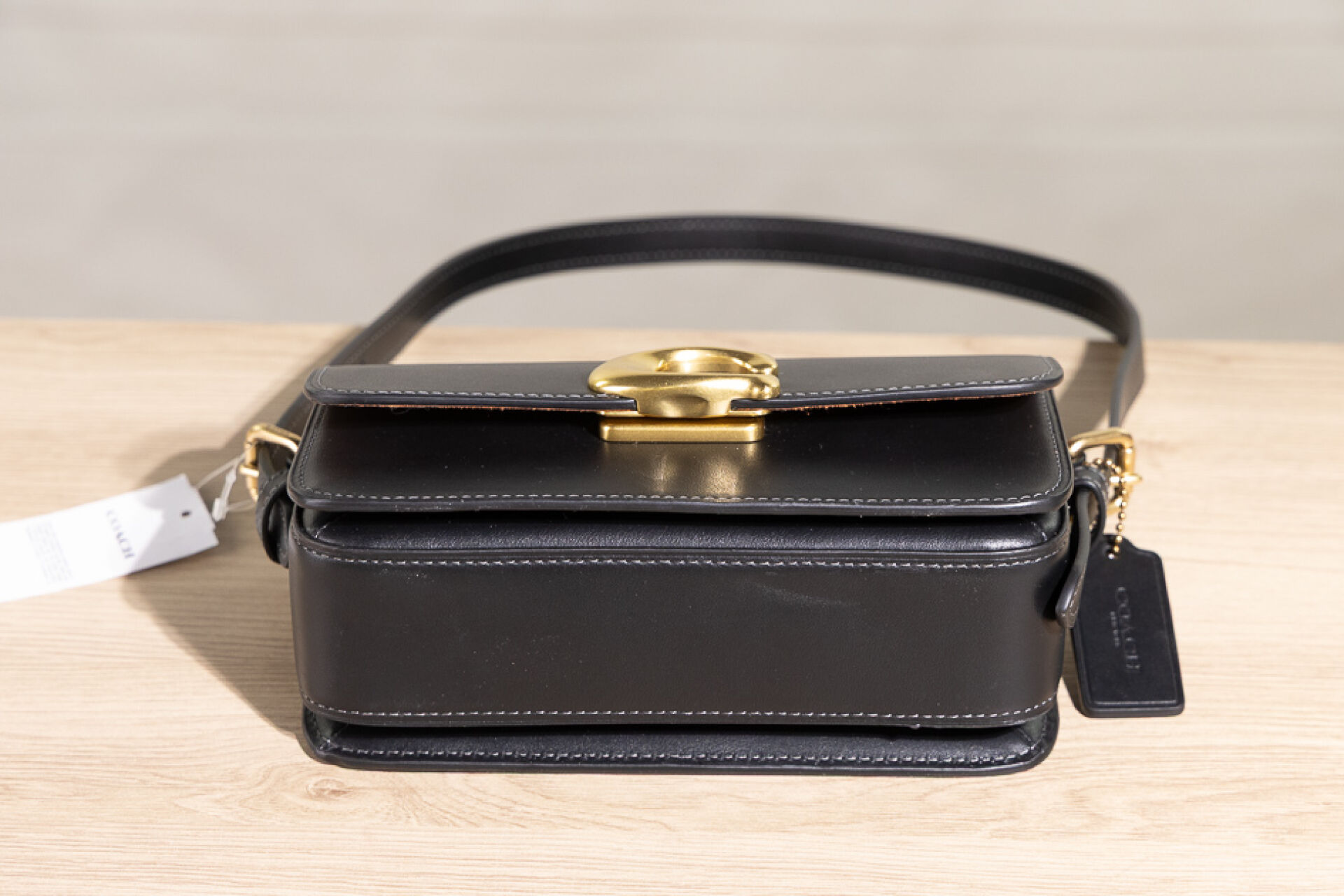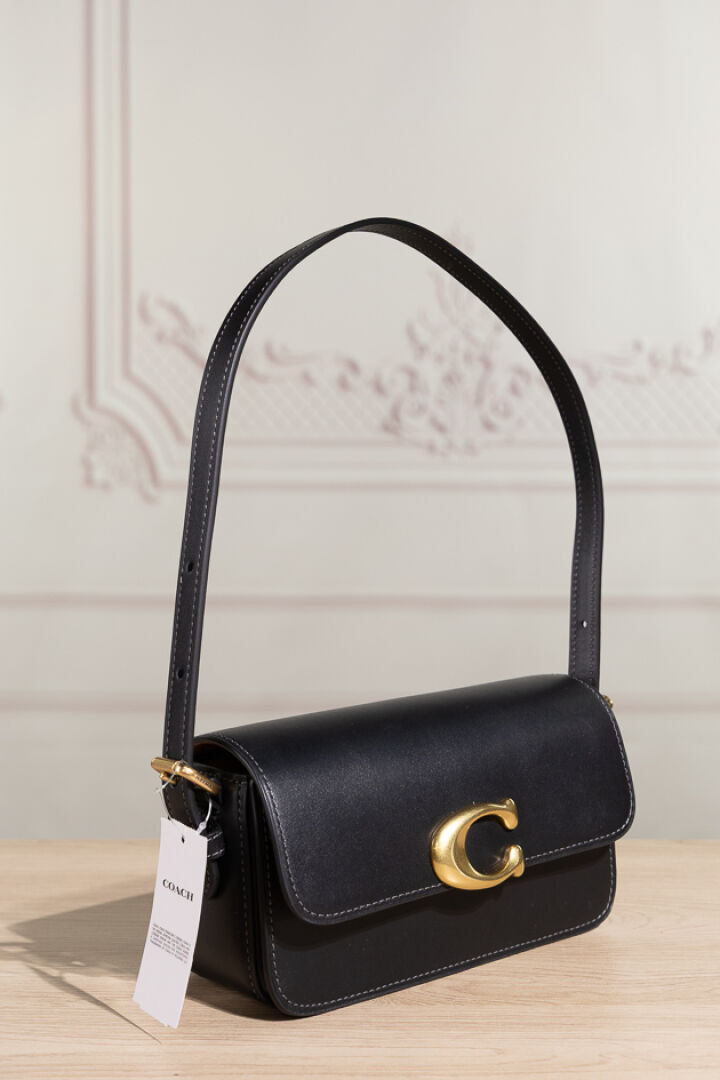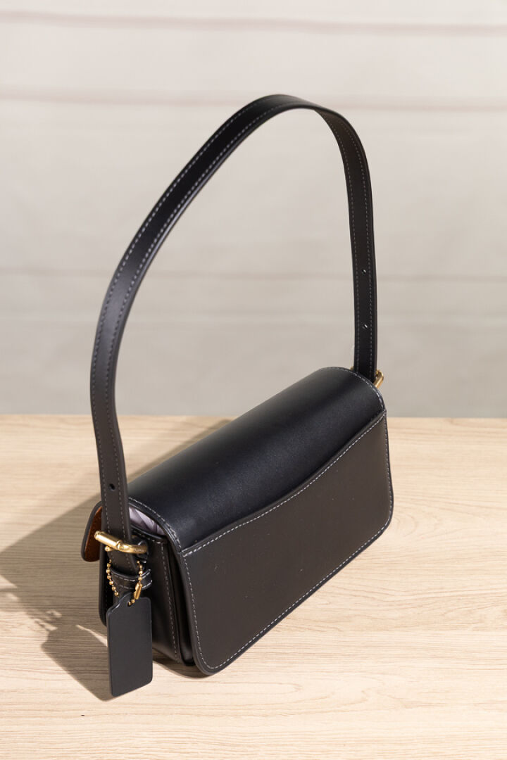 COACH - Petit sac en cuir noir, fermoir pression sous rabat siglé doré, deux anses de longueurs différentes à fixer à sa convenance, poche plaquée au dos. Haut. : 11 cm - Long. : 20 cm Non porté - Dust bag