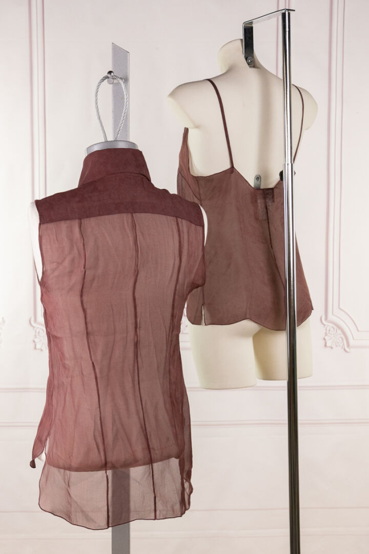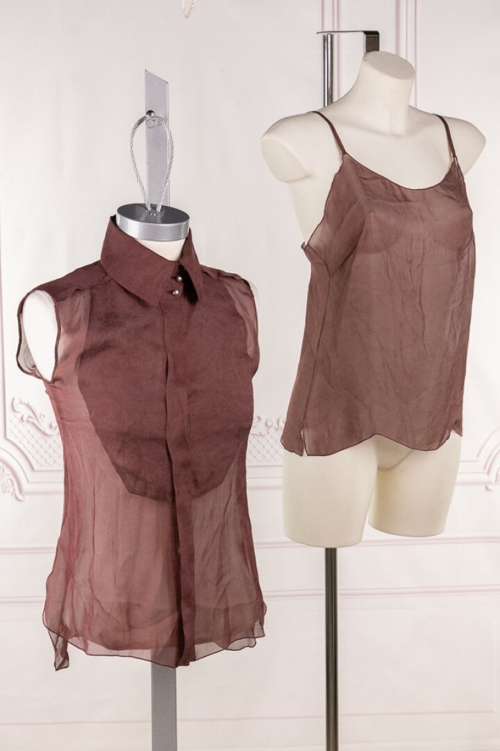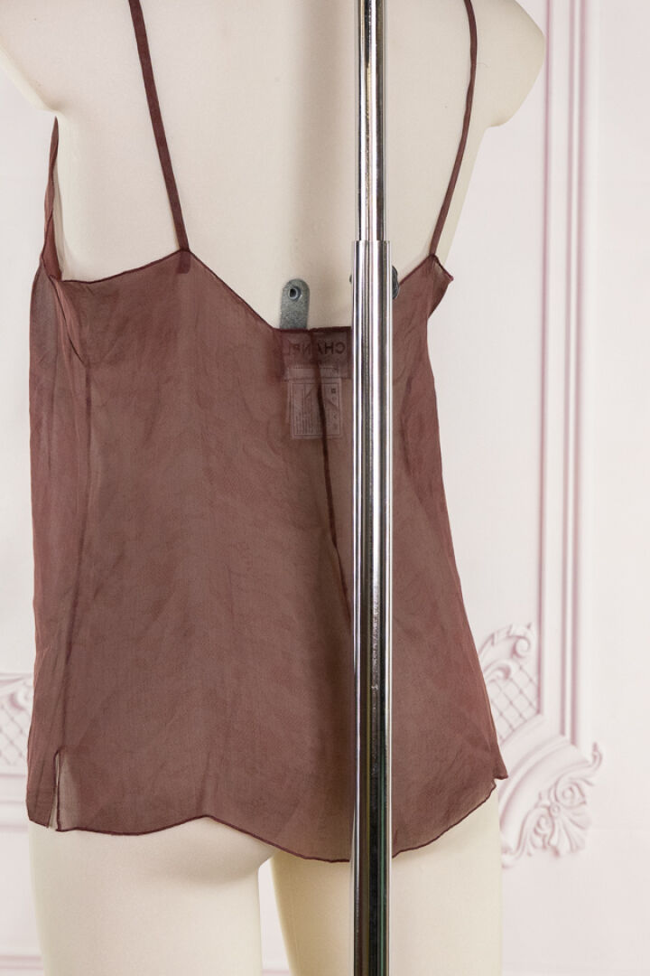 CHANEL - Collection Prêt à Porter Automne-Hiver 2002 - Ensemble chemisier sans manches à plis plats en plastron et débardeur en soie lie de vin imprimé floral en ton sur ton. Taille indiquée 36