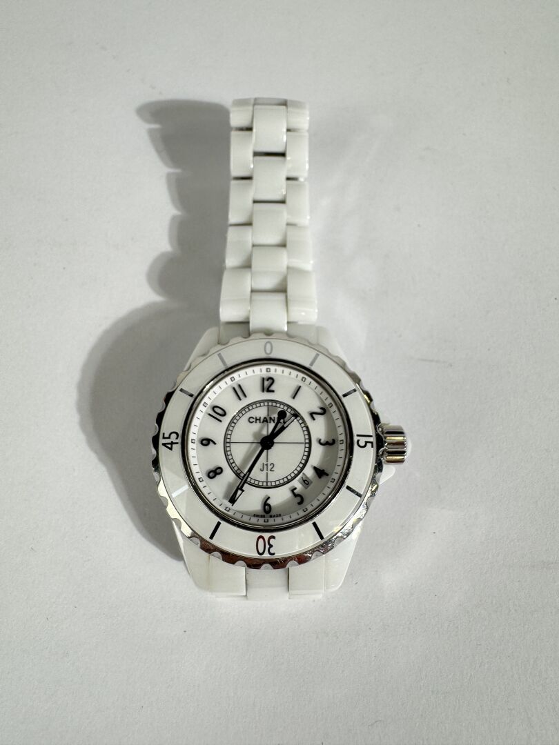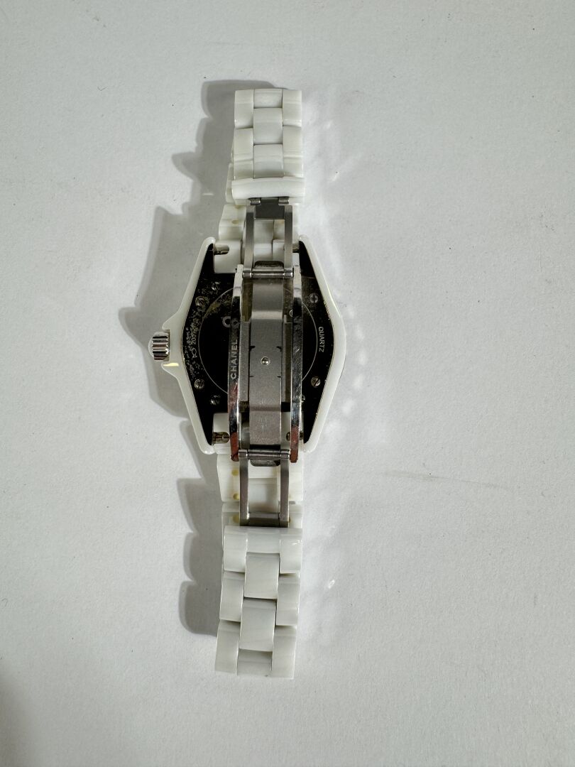 CHANEL - Montre J12 en céramique blanche, boitier rond en céramique, fond vissé, lunette graduée tournante unidirectionnelle, couronne vissée sertie d'un cabochon blanc, aiguilles bâtons luminescentes, trotteuse centrale, dateur par guichet entre 4 et 5h. Bracelet en céramique blanche, double boucle déployante en acier signée Chanel. Numérotée. Très bon état : cadran, verre et aiguilles en très bon état, micros-rayures d'usage au dos du boîtier. Montre fonctionnant lors de l'expertise. Une révision est conseillée. Conditions de vente spécifiques : Veuillez noter que toutes les montres sont vendues en l'état. Aucune garantie n'est faite sur l'état de marche, une révision est donc conseillée. Certaines montres ont été ouvertes pour identifier le type et la qualité du mouvement, y compris les montres résistantes à l'eau, il est donc conseillé à l'acheteur de consulter un horloger pour revoir l'étanchéité de la montre.