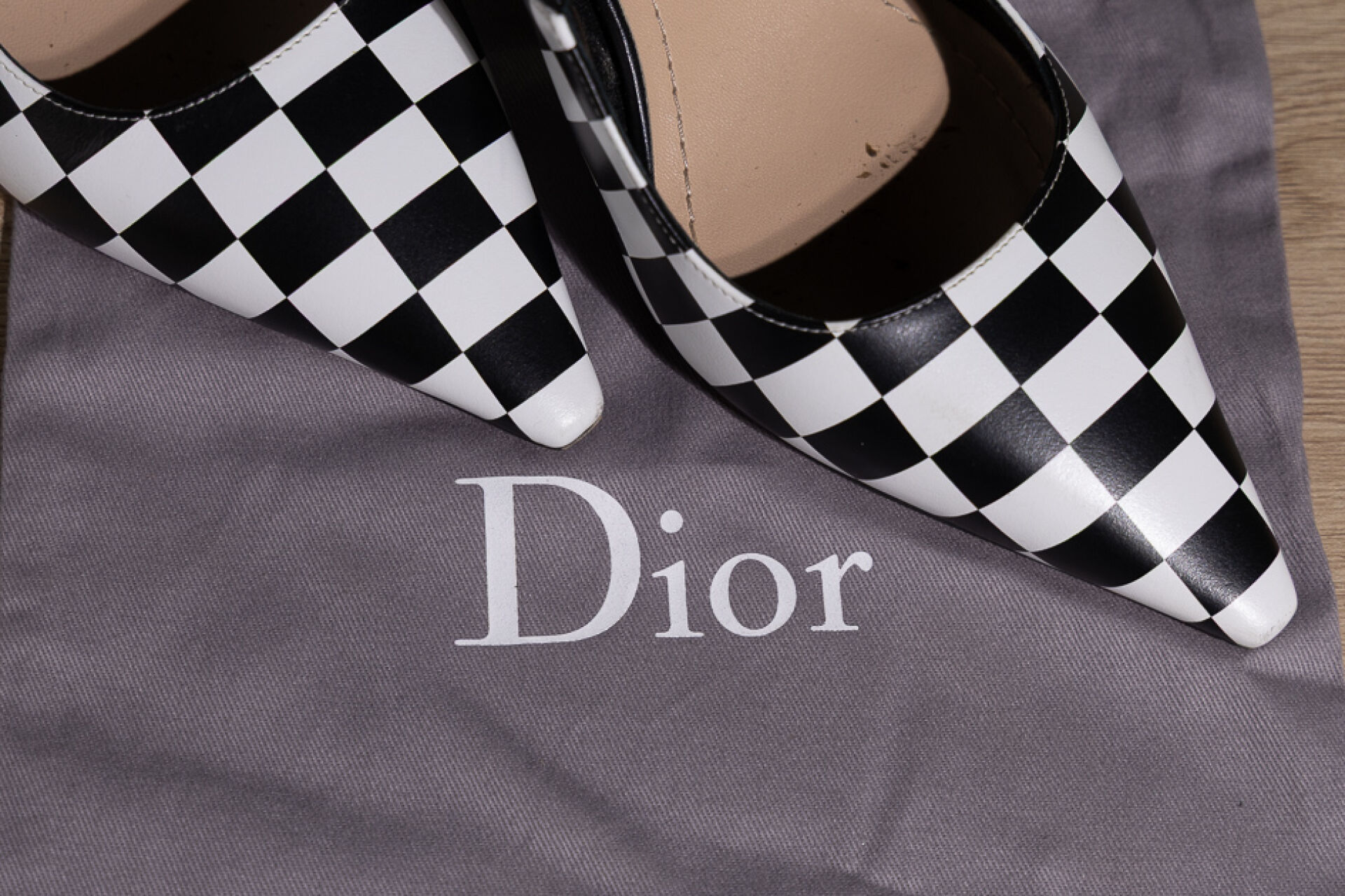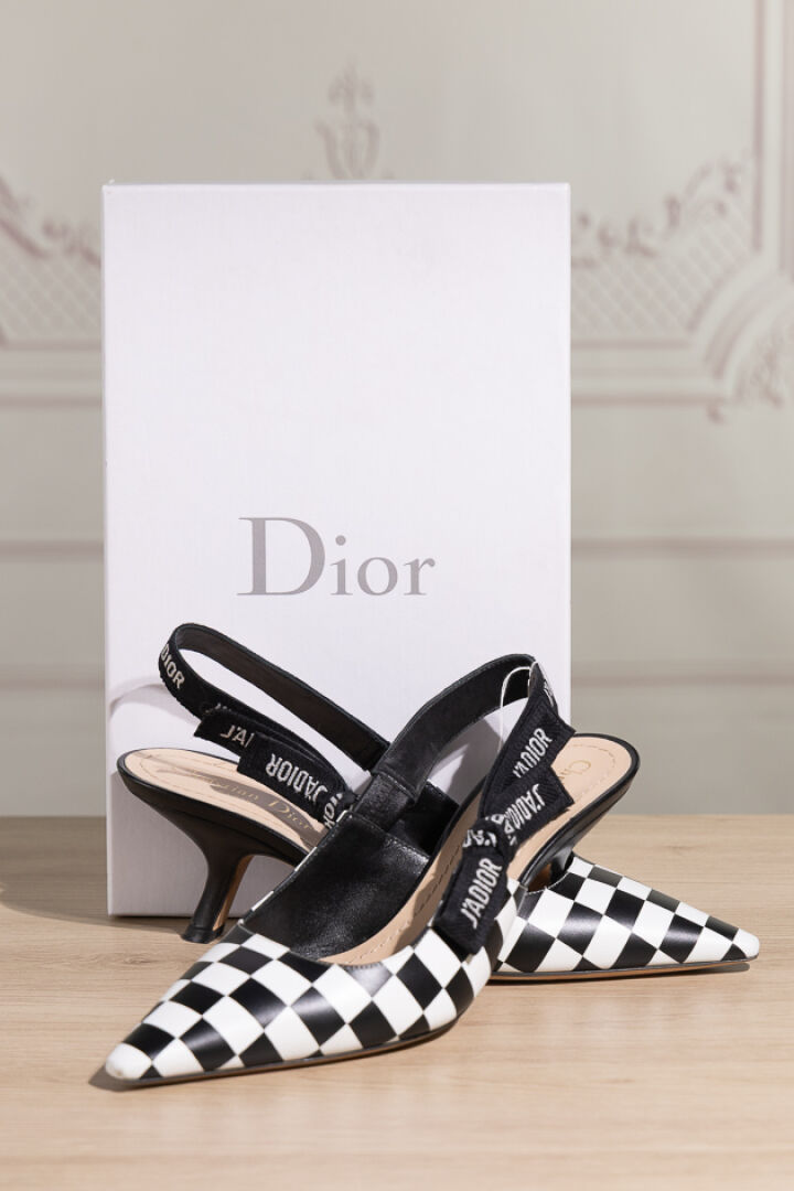 CHRISTIAN DIOR - Paire d'escarpins Jadior damier noir et blanc, petits talons. Dans leur boite. Pointure 37 - Haut. du talon : 6.5 cm Peu portés