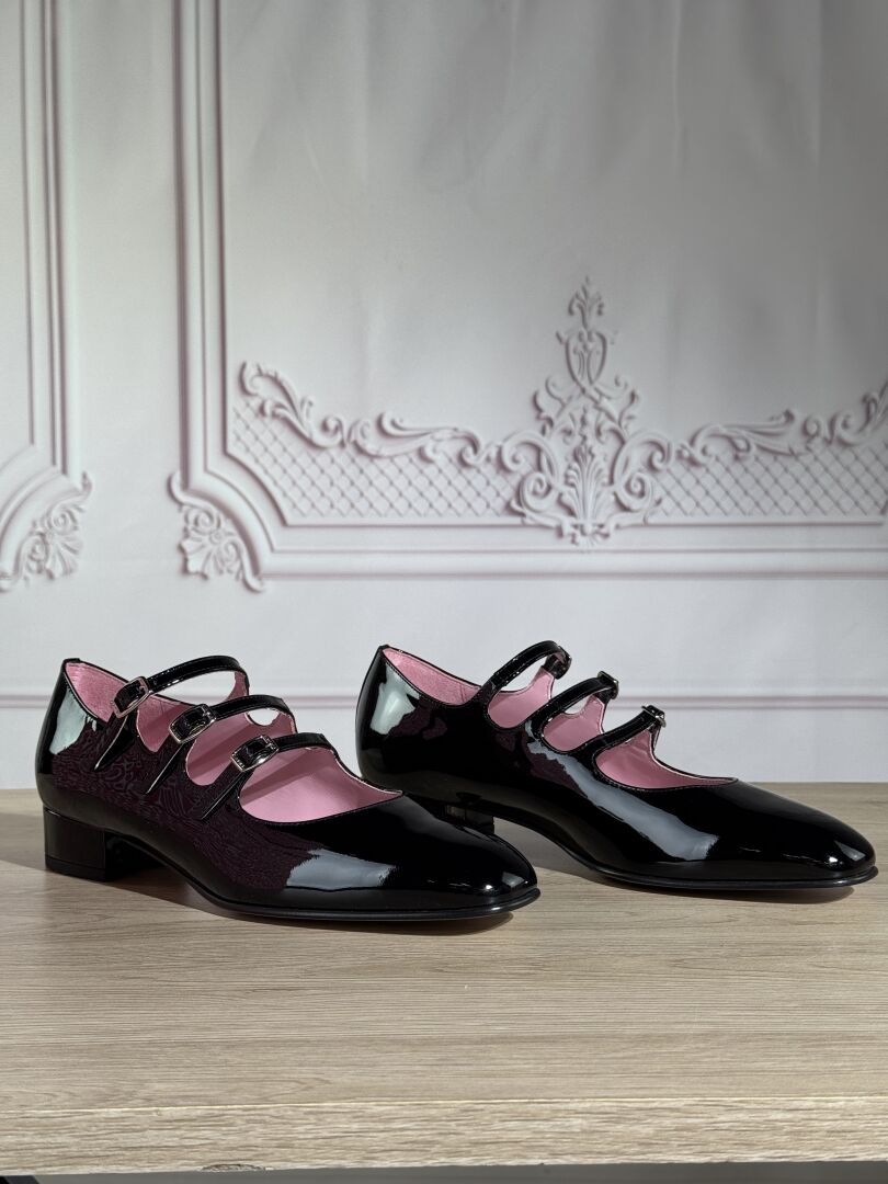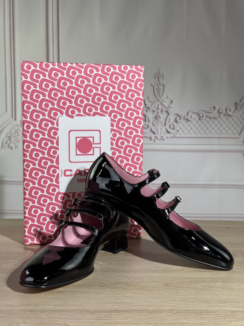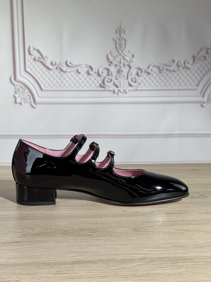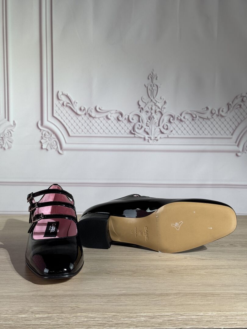 CAREL - Paire de souliers, modèle "Ariana", cuir agneau noir vernis, trois brides, petits talons. Pointure 38 - Haut du talon : 2,5 cm Etat neuf