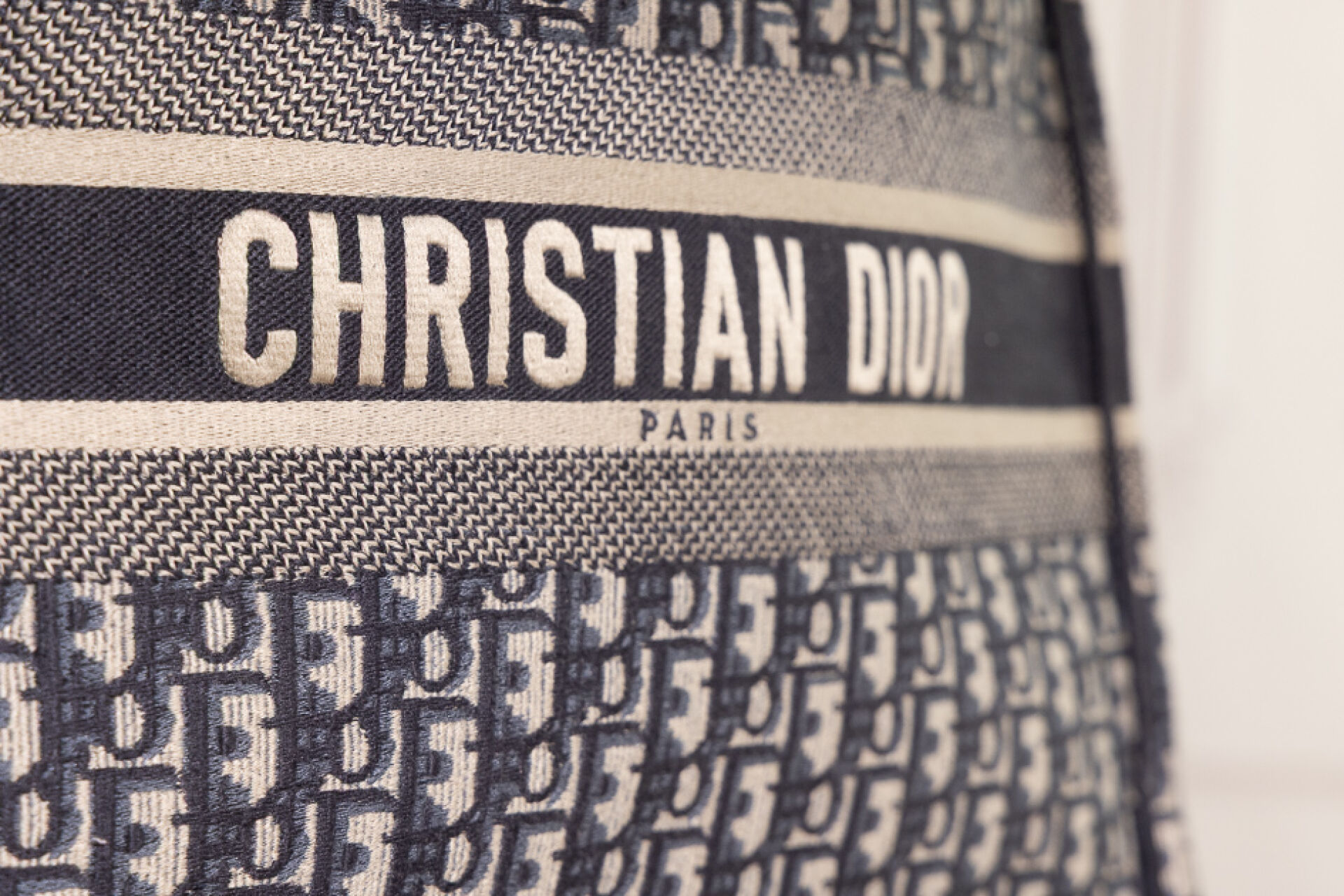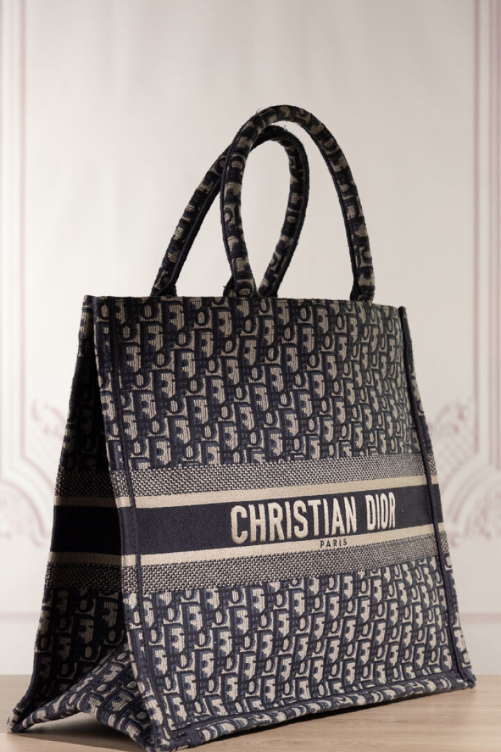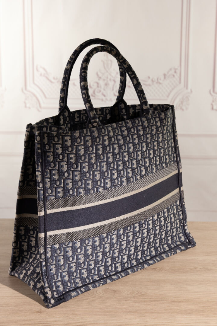CHRISTIAN DIOR - Sac cabas "Book Tote" en toile jacquard oblique marine, bleu, ivoire, double poignée. Haut. : 34 cm x Long. : 41,5 cm Tampon or made in Italy - N° 17-BO-0175