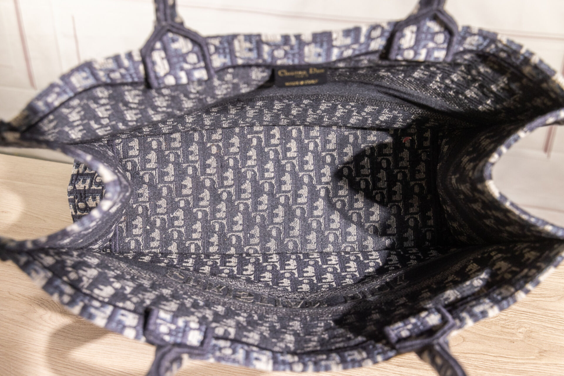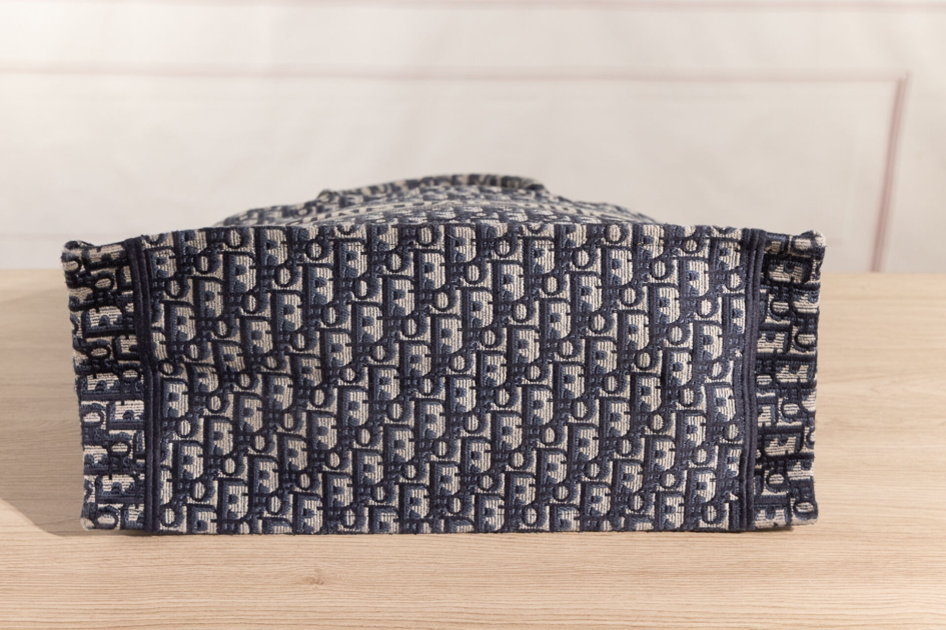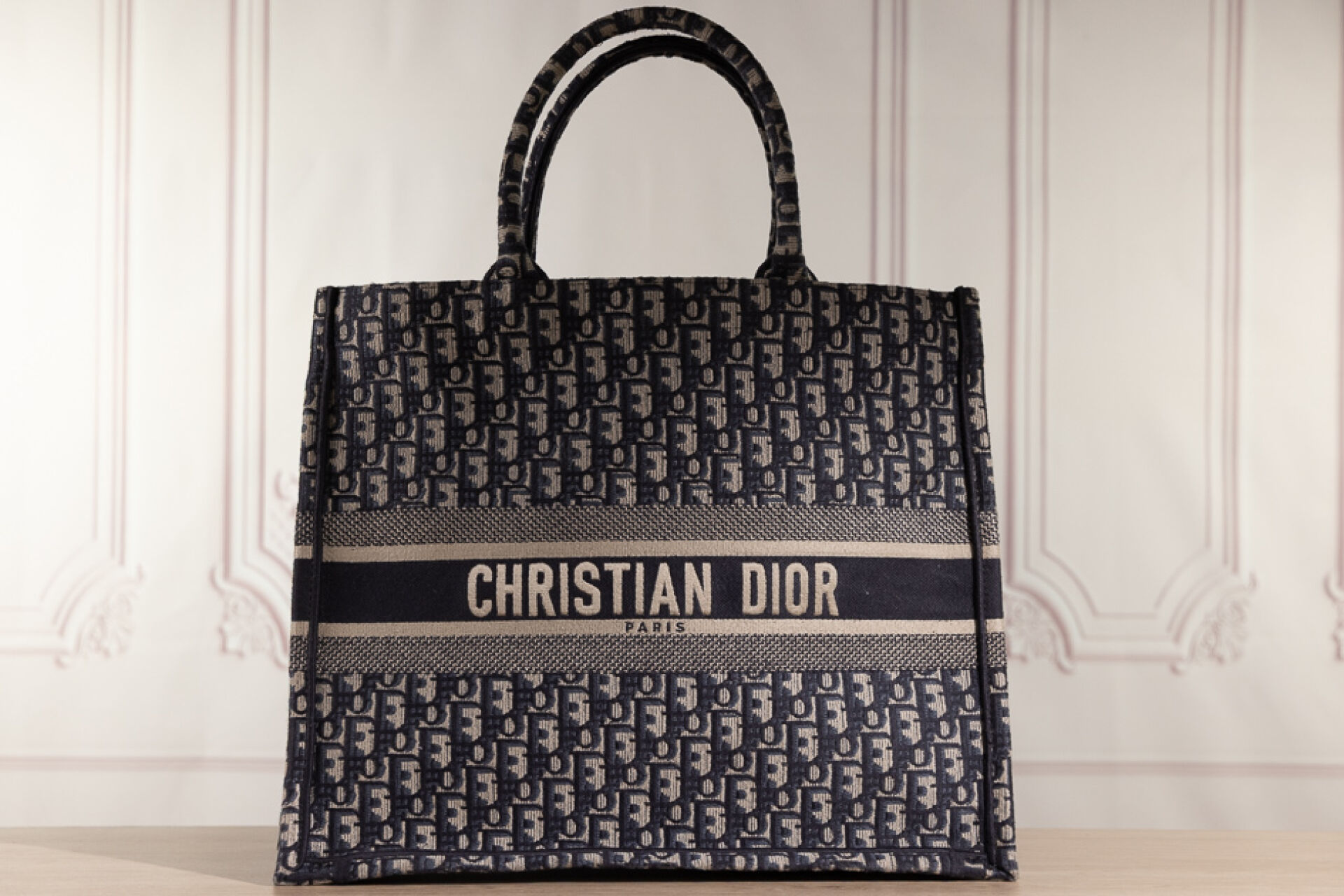 CHRISTIAN DIOR - Sac cabas "Book Tote" en toile jacquard oblique marine, bleu, ivoire, double poignée. Haut. : 34 cm x Long. : 41,5 cm Tampon or made in Italy - N° 17-BO-0175