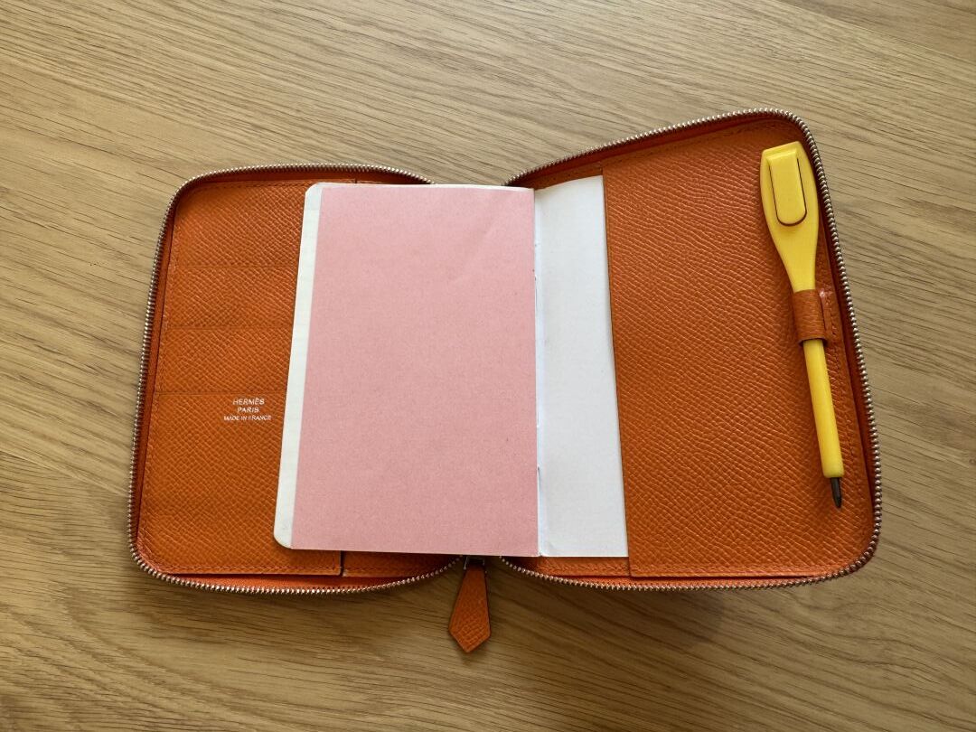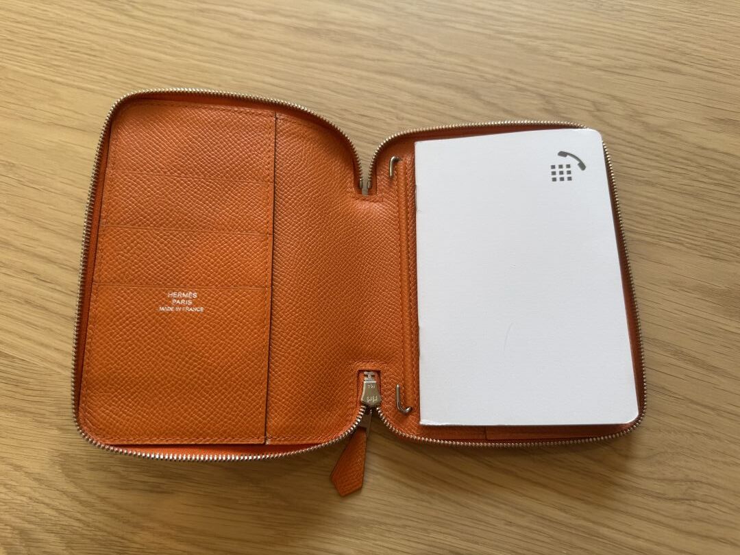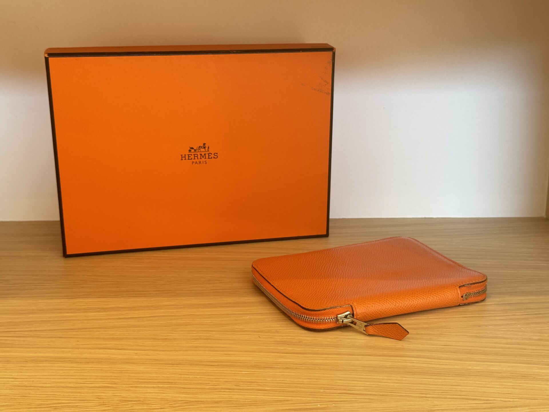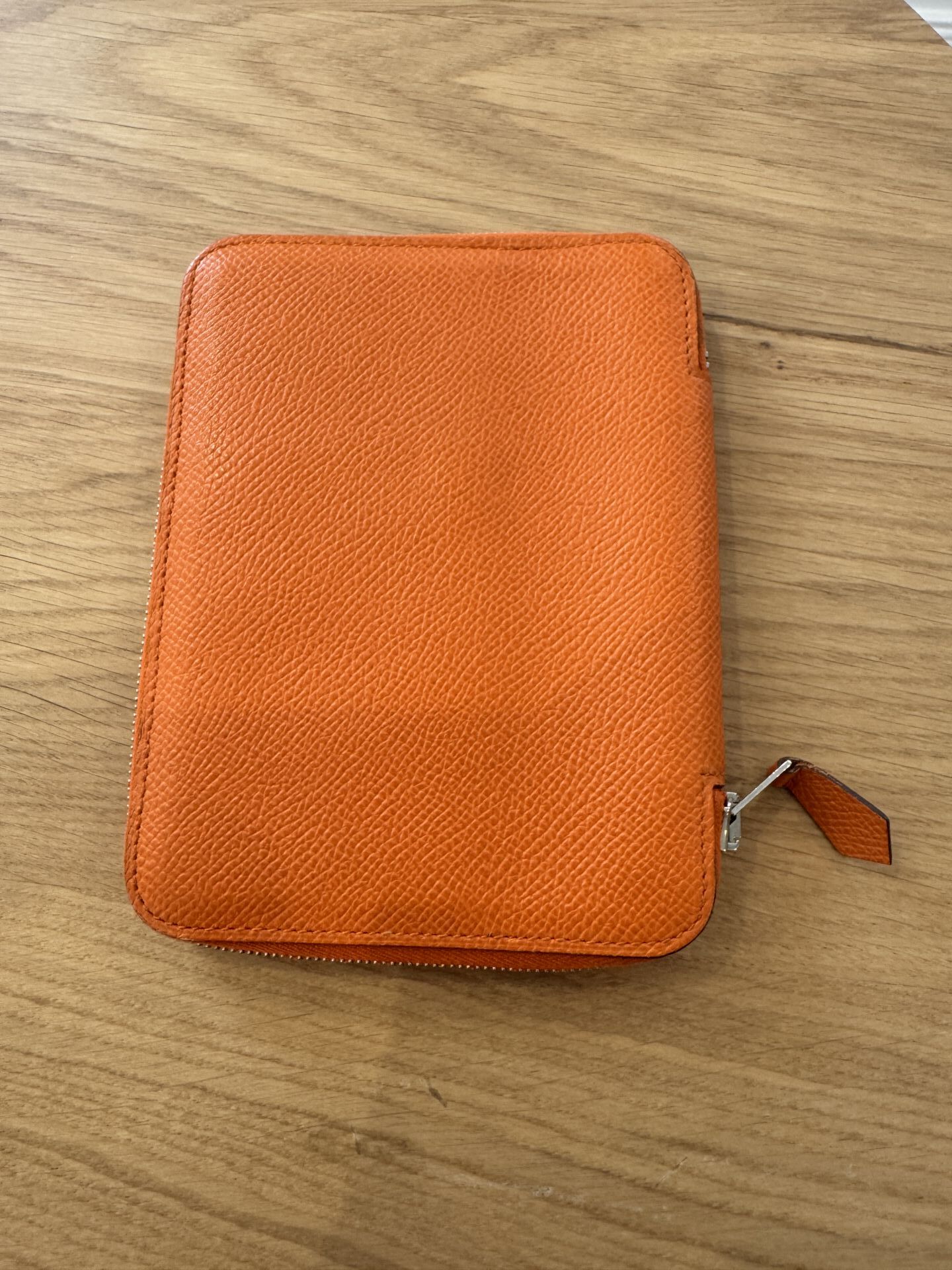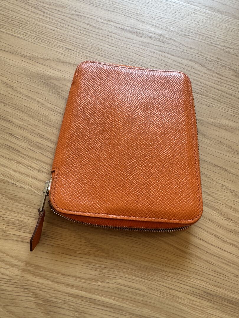 HERMES Paris - Porte-carte/agenda, cuir epson orange, fermeture zip, boite. 14 x 10 cm