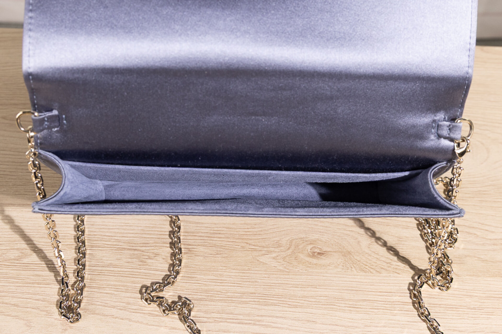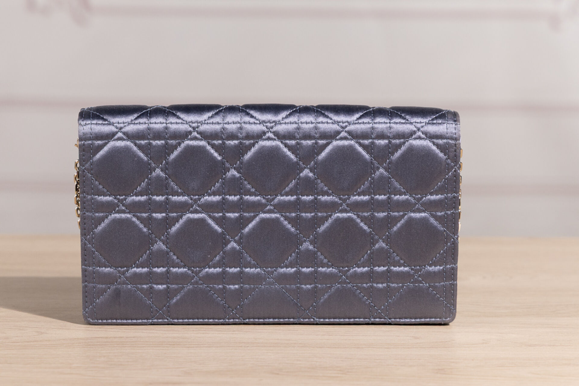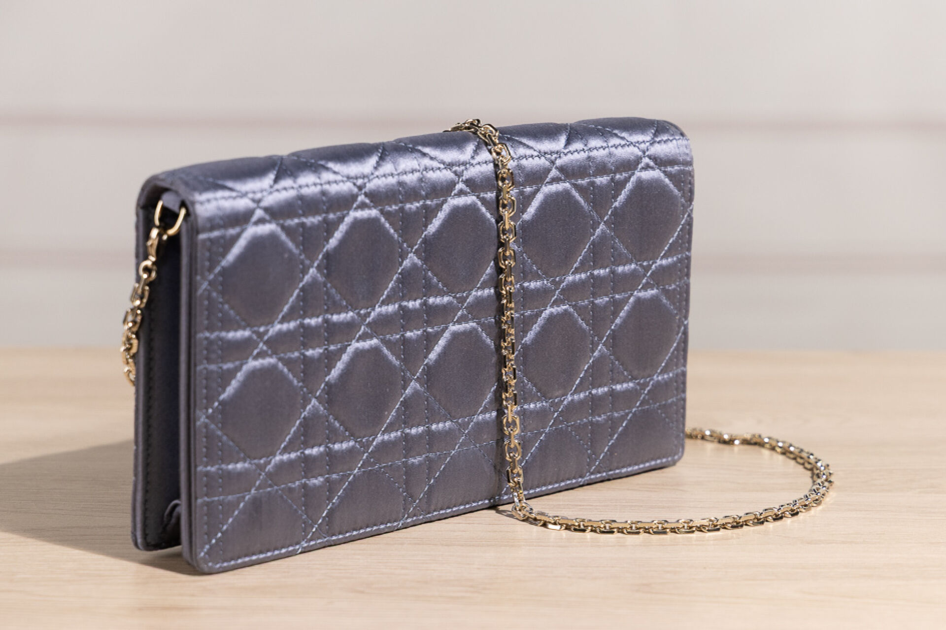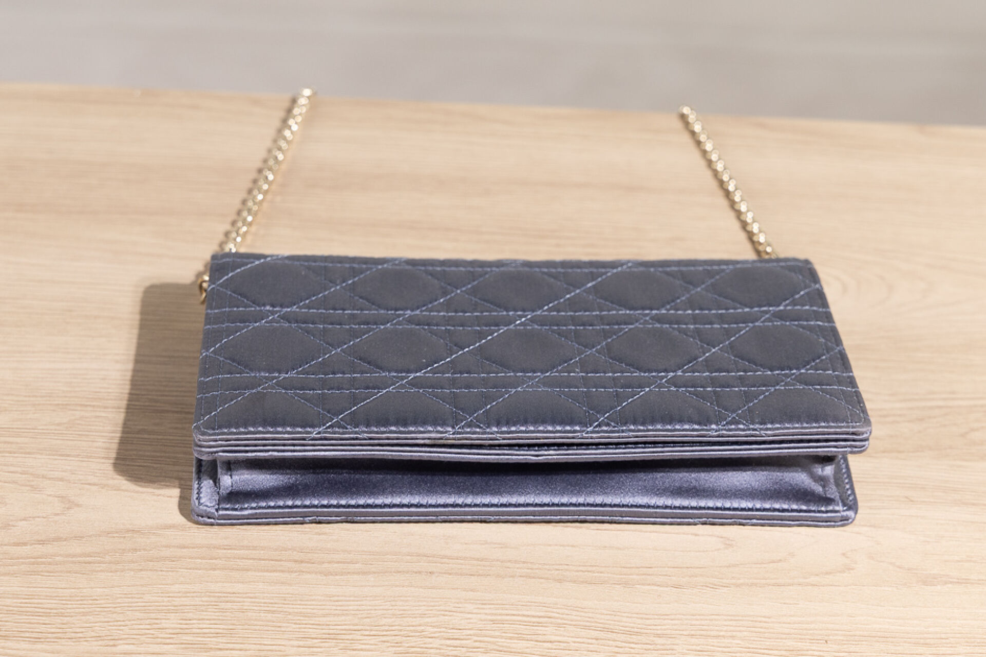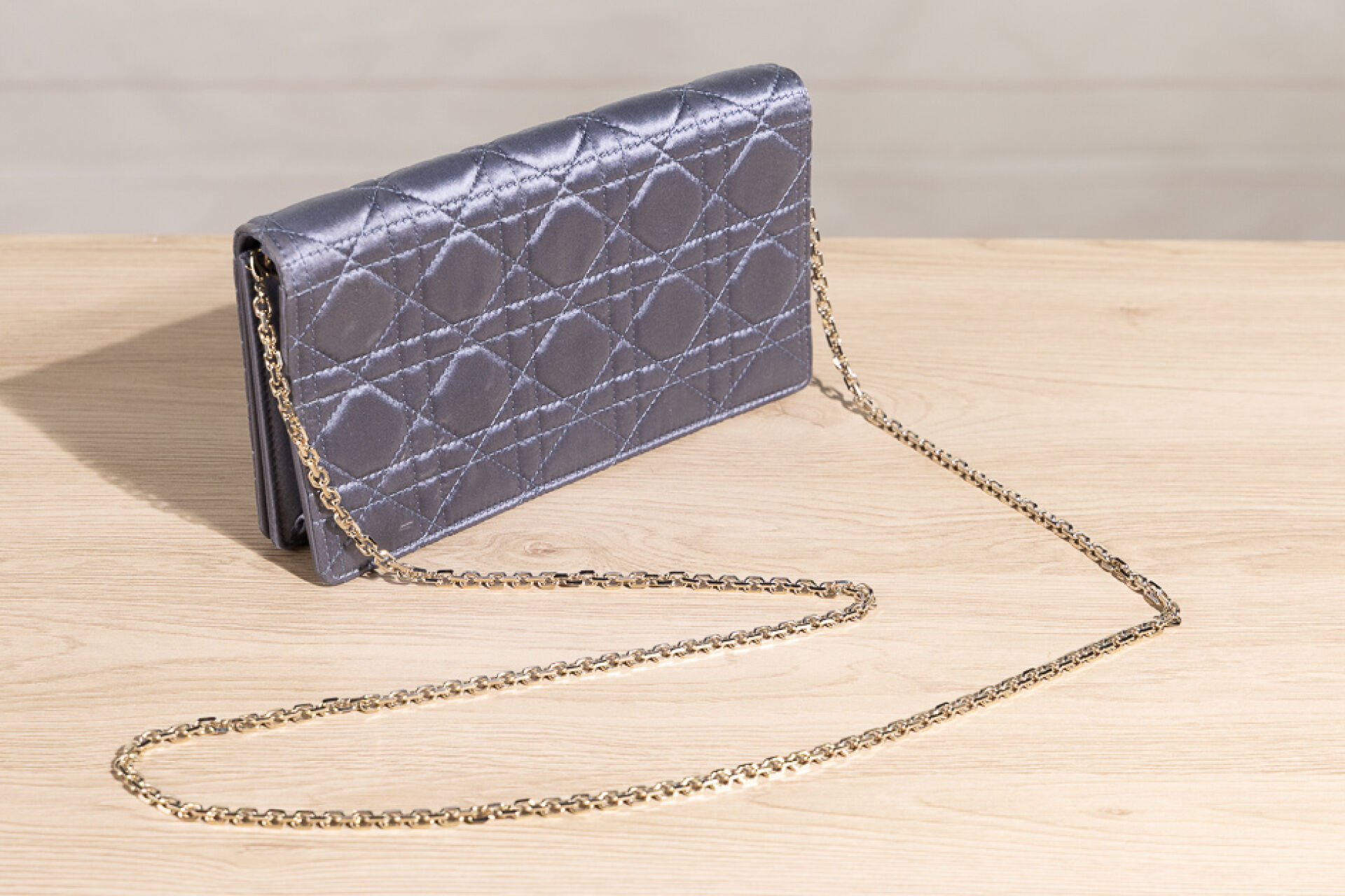 CHRISTIAN DIOR - Petit sac du soir en soie bleu irisée matelassée cannage, fermoir aimanté sous rabat, doublure en daim, anse chaine en métal doré amovible. Haut. : 12 cm - Long. : 22 cm Très légères traces