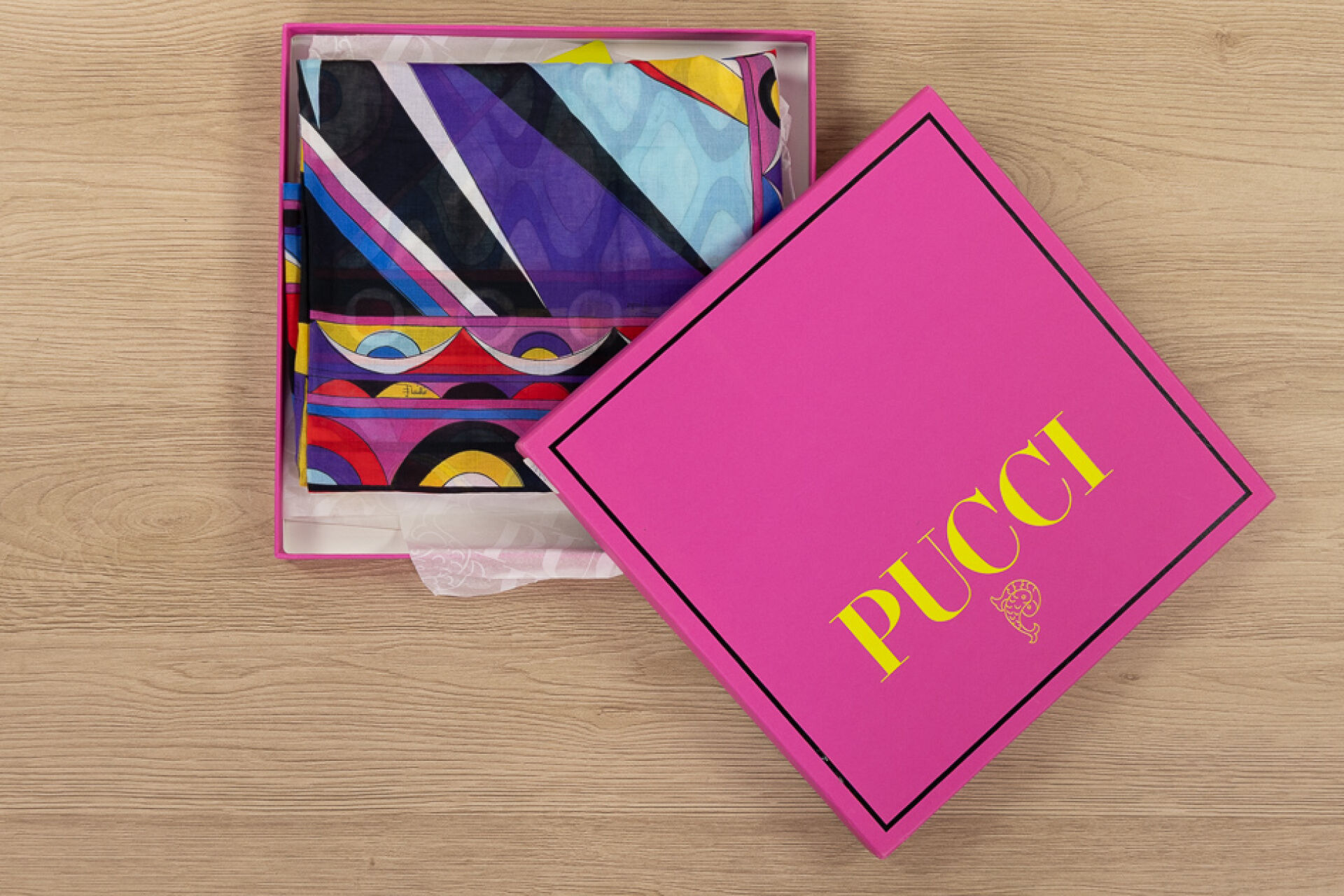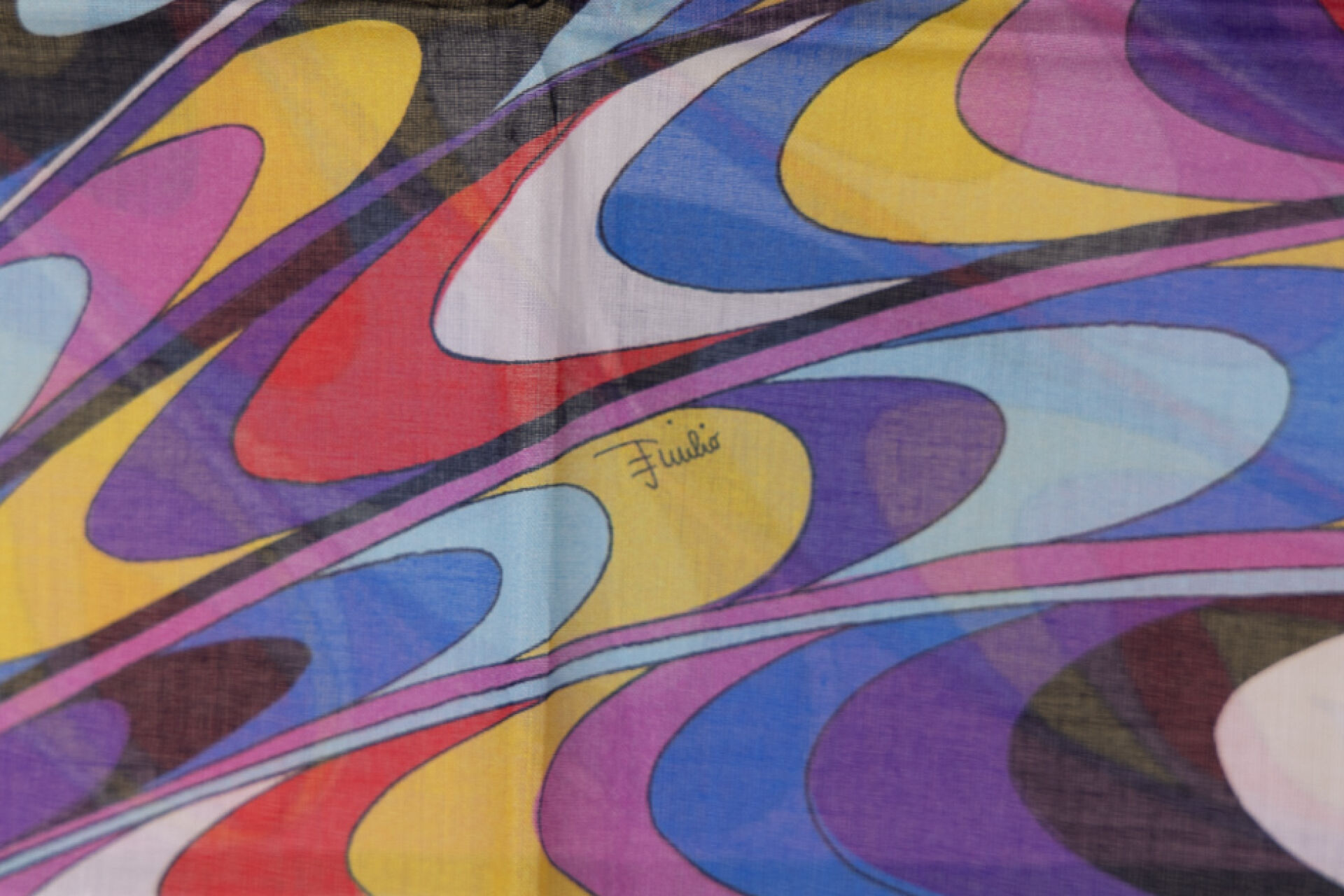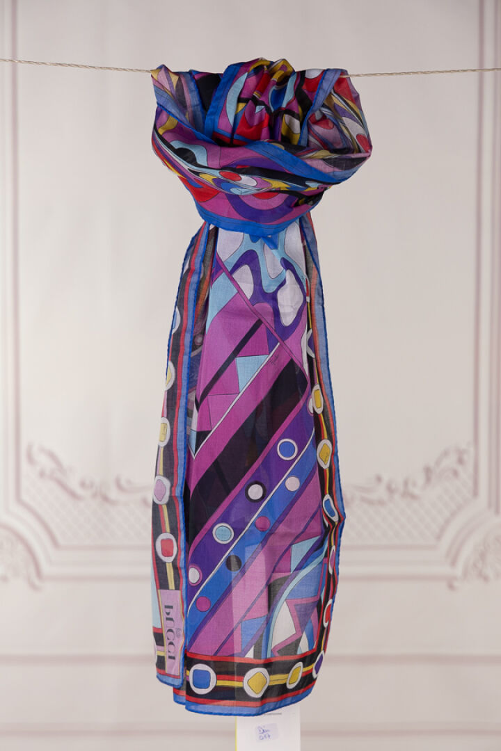PUCCI - Écharpe en coton imprimé psychédélique bleu, rose, parme, jaune, rouge. Boite. 54 x 150 cm environ Non porté, étiquette.