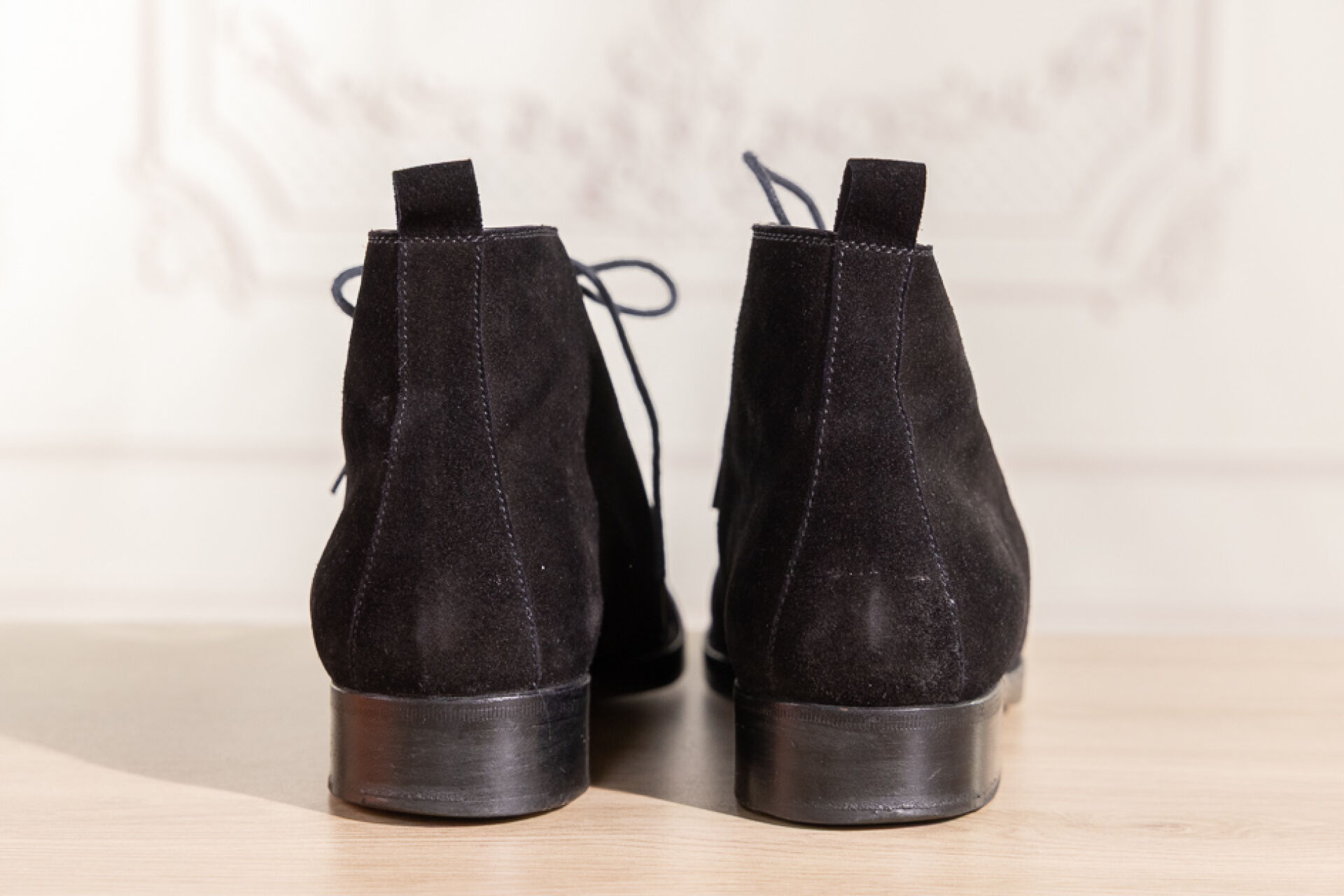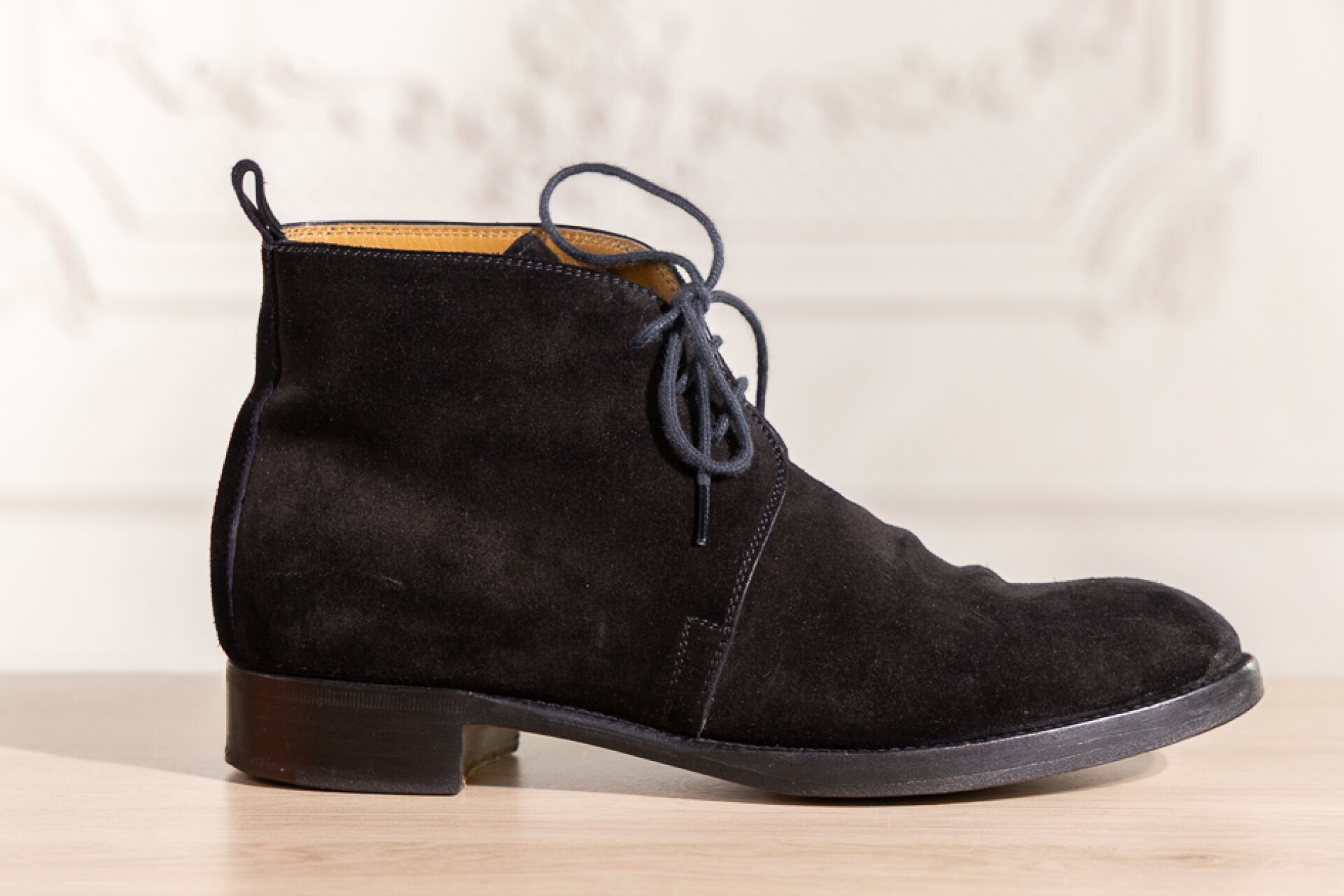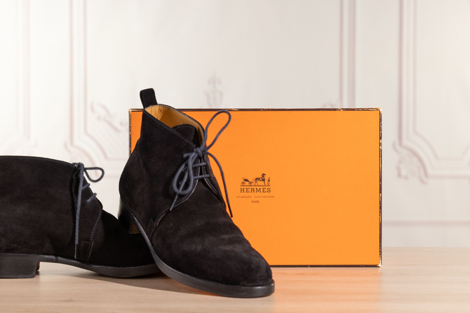 HERMES Paris - Paire de chaussures montantes en daim marron très foncé tirant sur le noir, lacets. Dans une boite. Pointure 37,5 Déjà portées, petites usures à la semelle