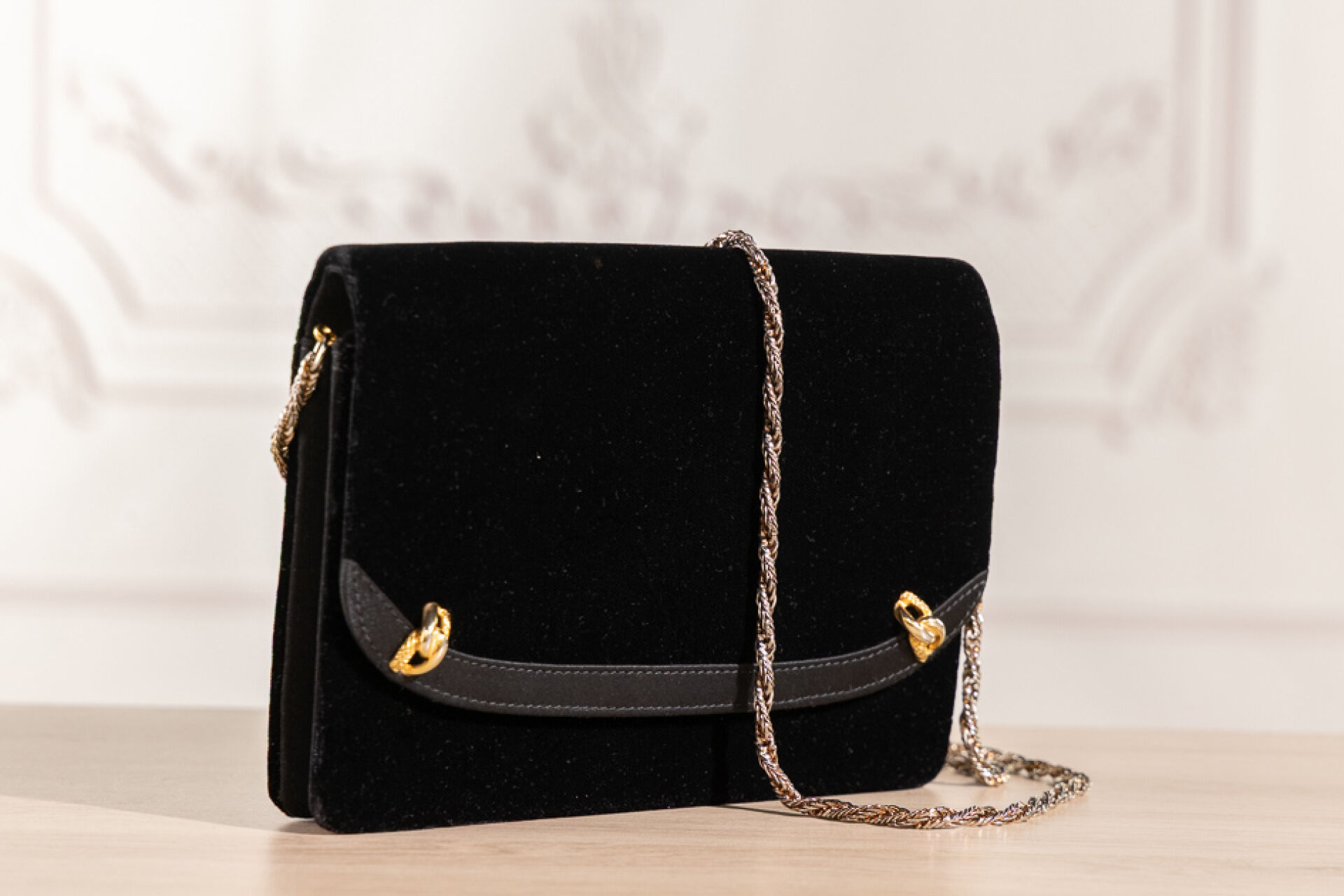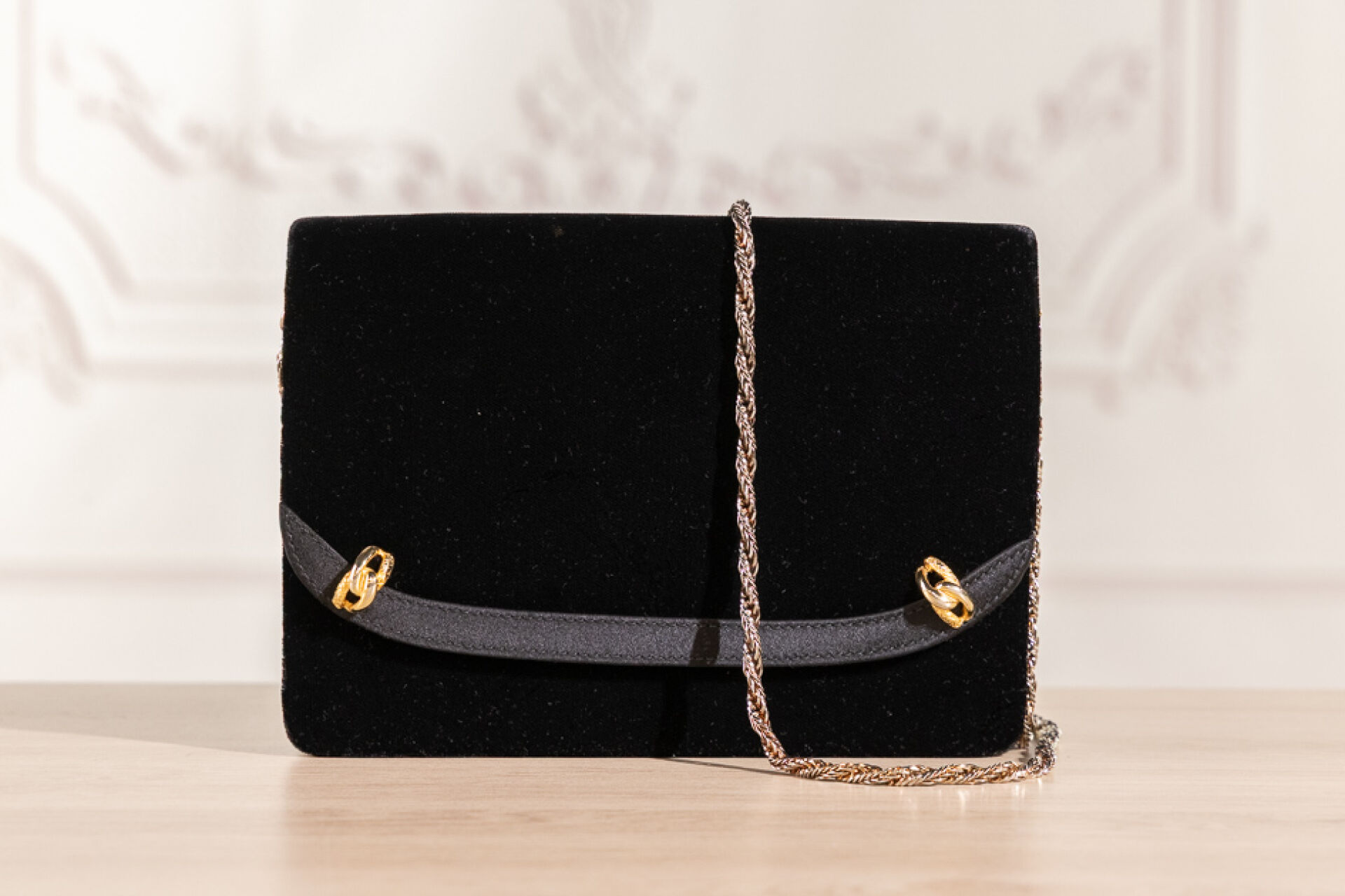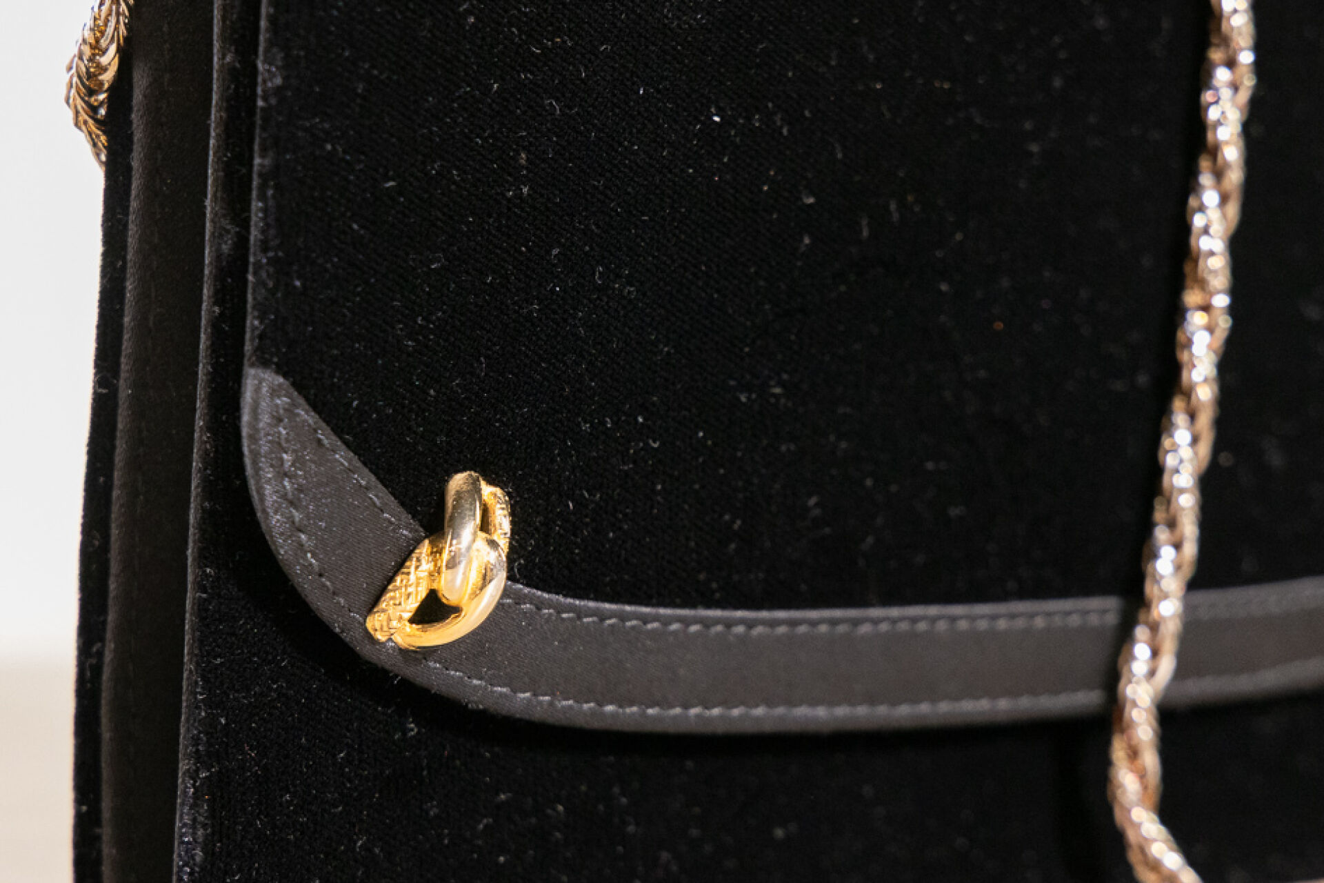 GUCCI - Pochette en velours noir bordé de toile satinée noire, éléments métal doré, fermoir à pression, chaine torsadée amovible en métal doré. Haut. : 20 cm - Long. : 14 cm Très légères traces, anse chaine probablement rapportée