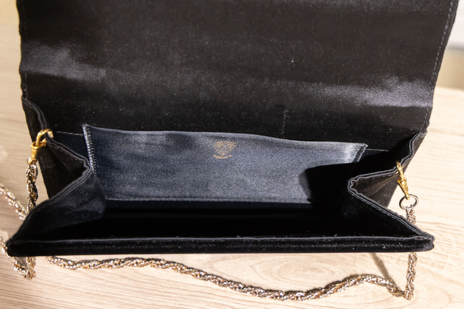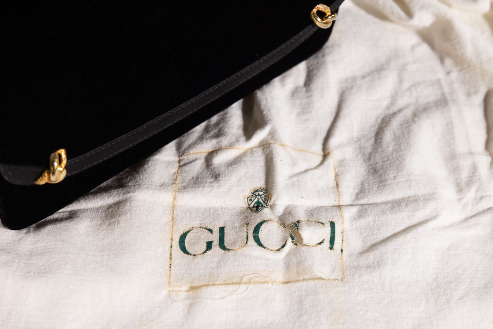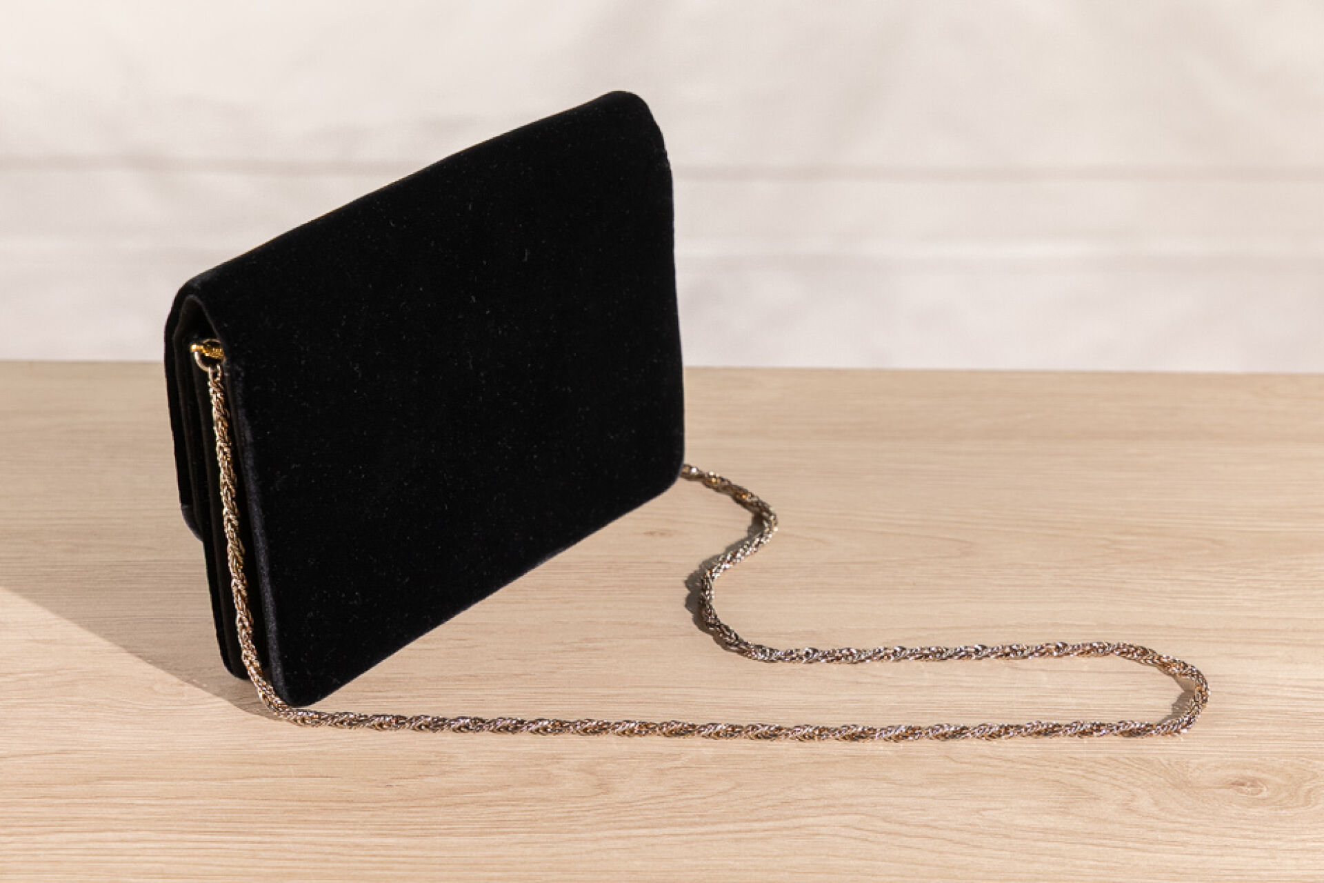 GUCCI - Pochette en velours noir bordé de toile satinée noire, éléments métal doré, fermoir à pression, chaine torsadée amovible en métal doré. Haut. : 20 cm - Long. : 14 cm Très légères traces, anse chaine probablement rapportée