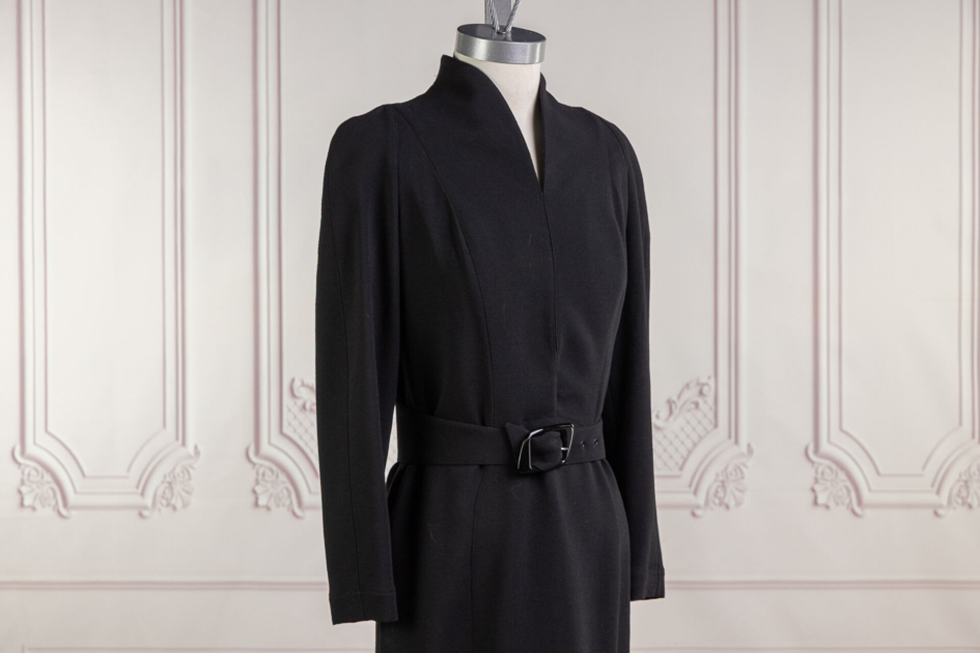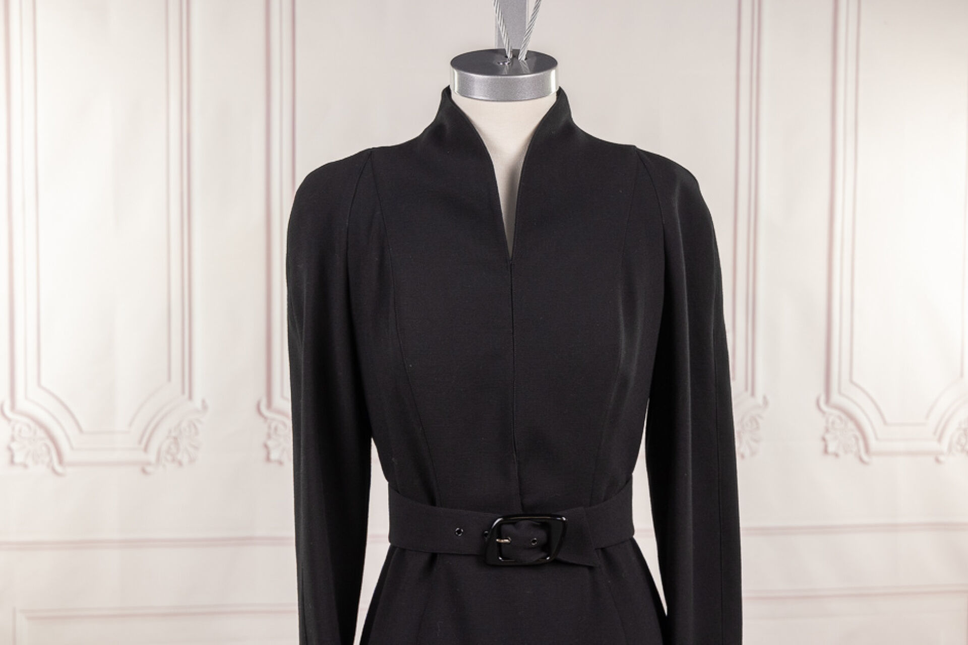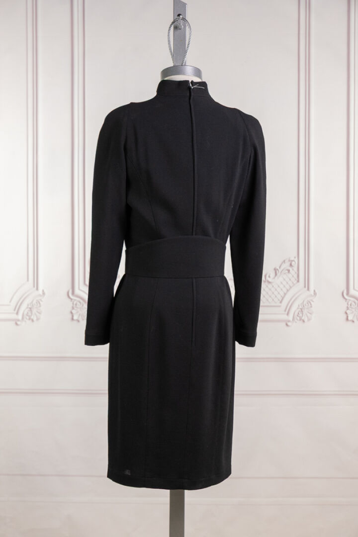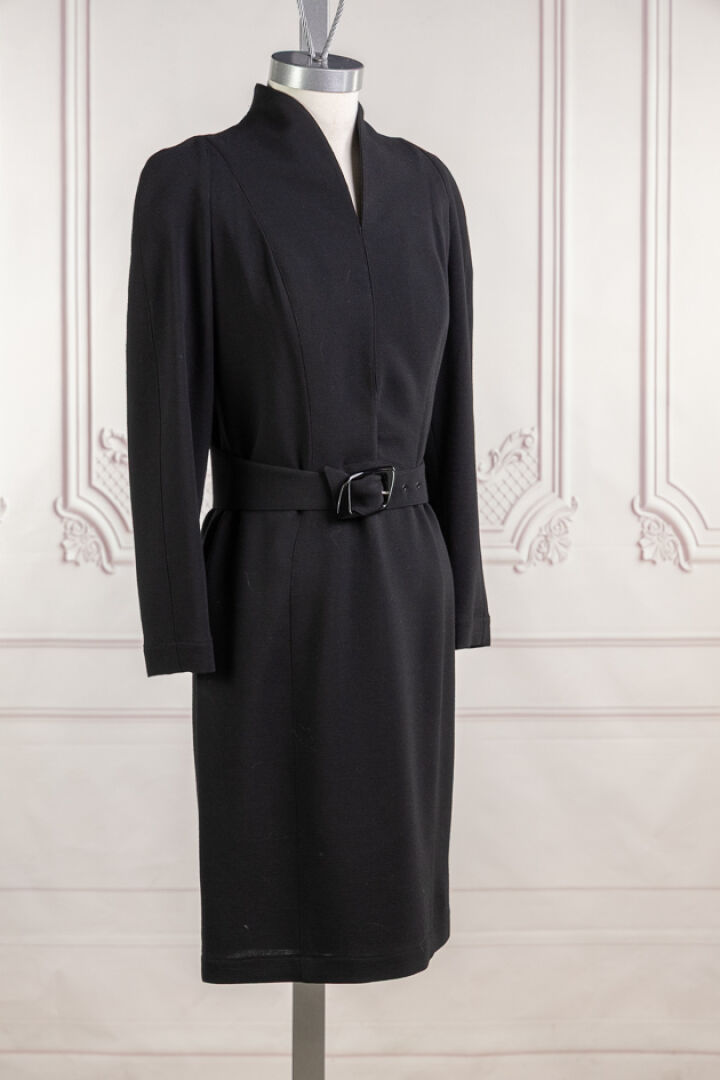 THIERRY MUGLER - Robe en jersey de laine noir à découpes, col montant, décolleté fendu, manches longues montées légèrement chauve-souris, ceinture. Griffe bleu graphisme argent Taille indiquée 38
