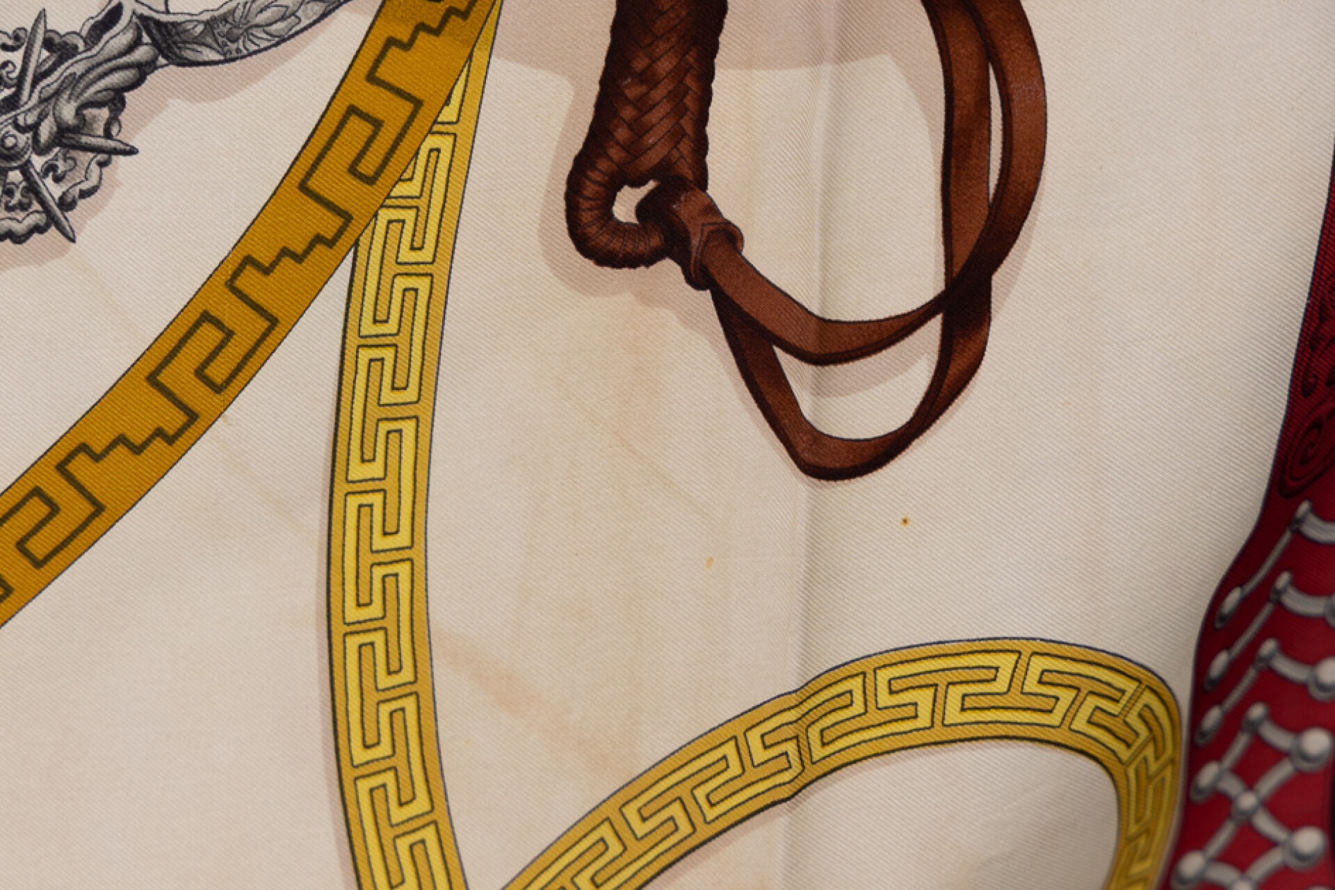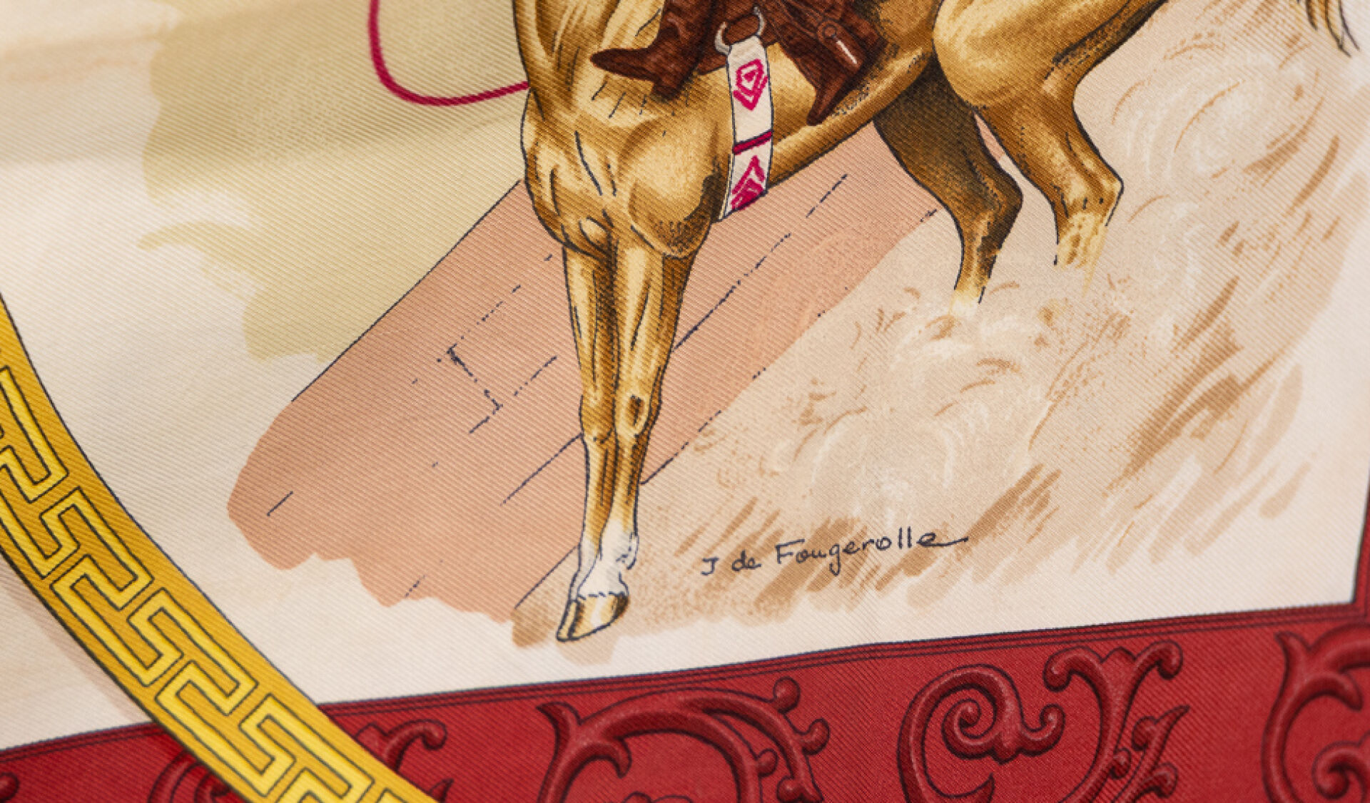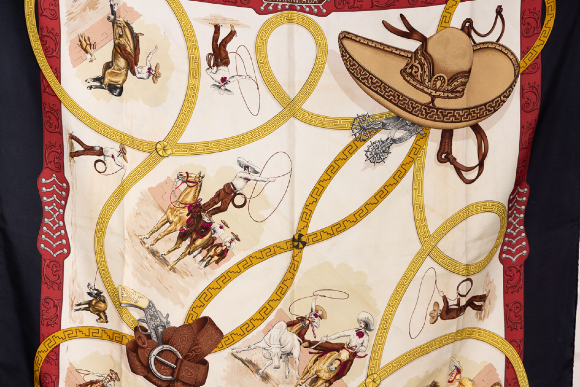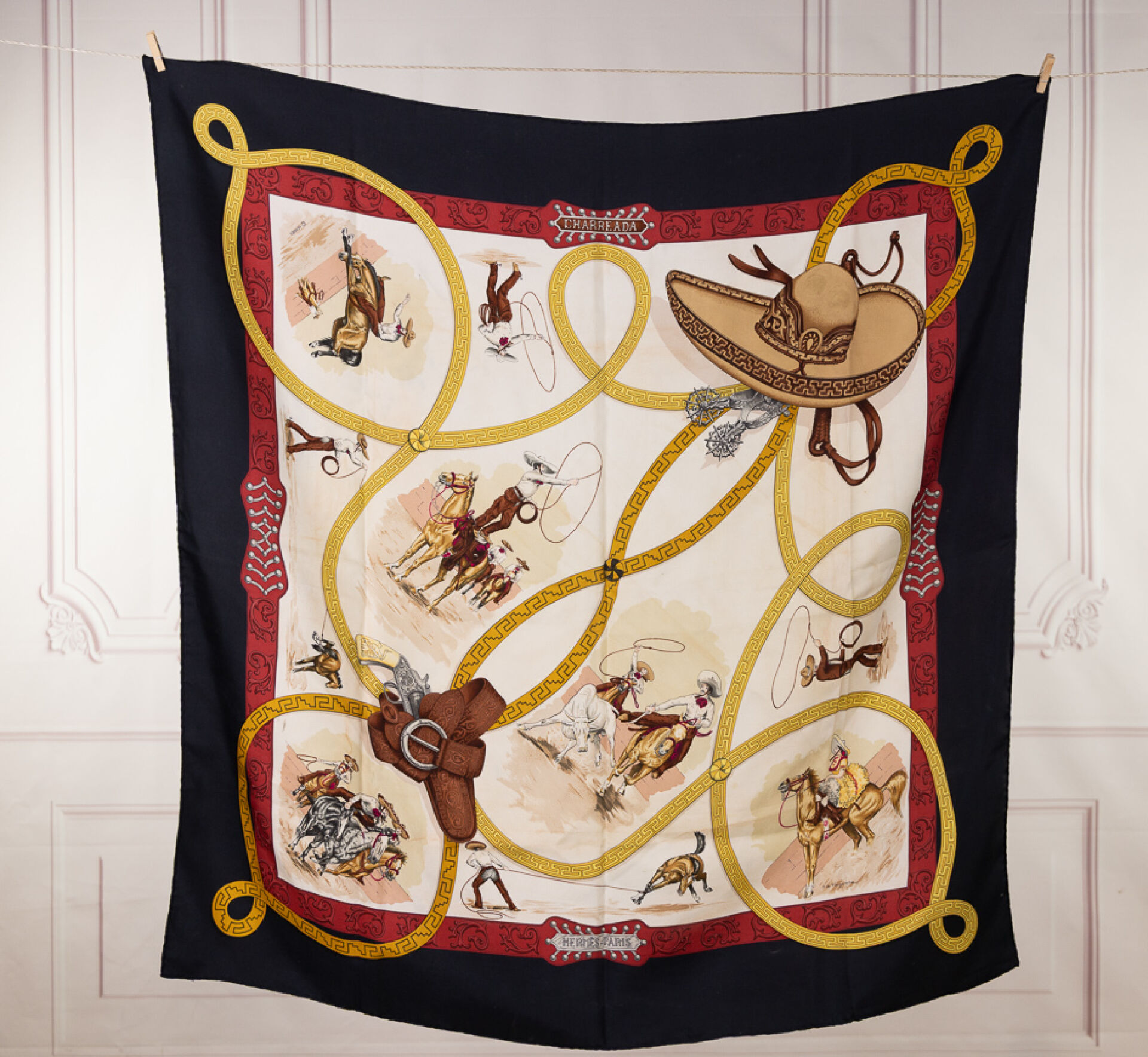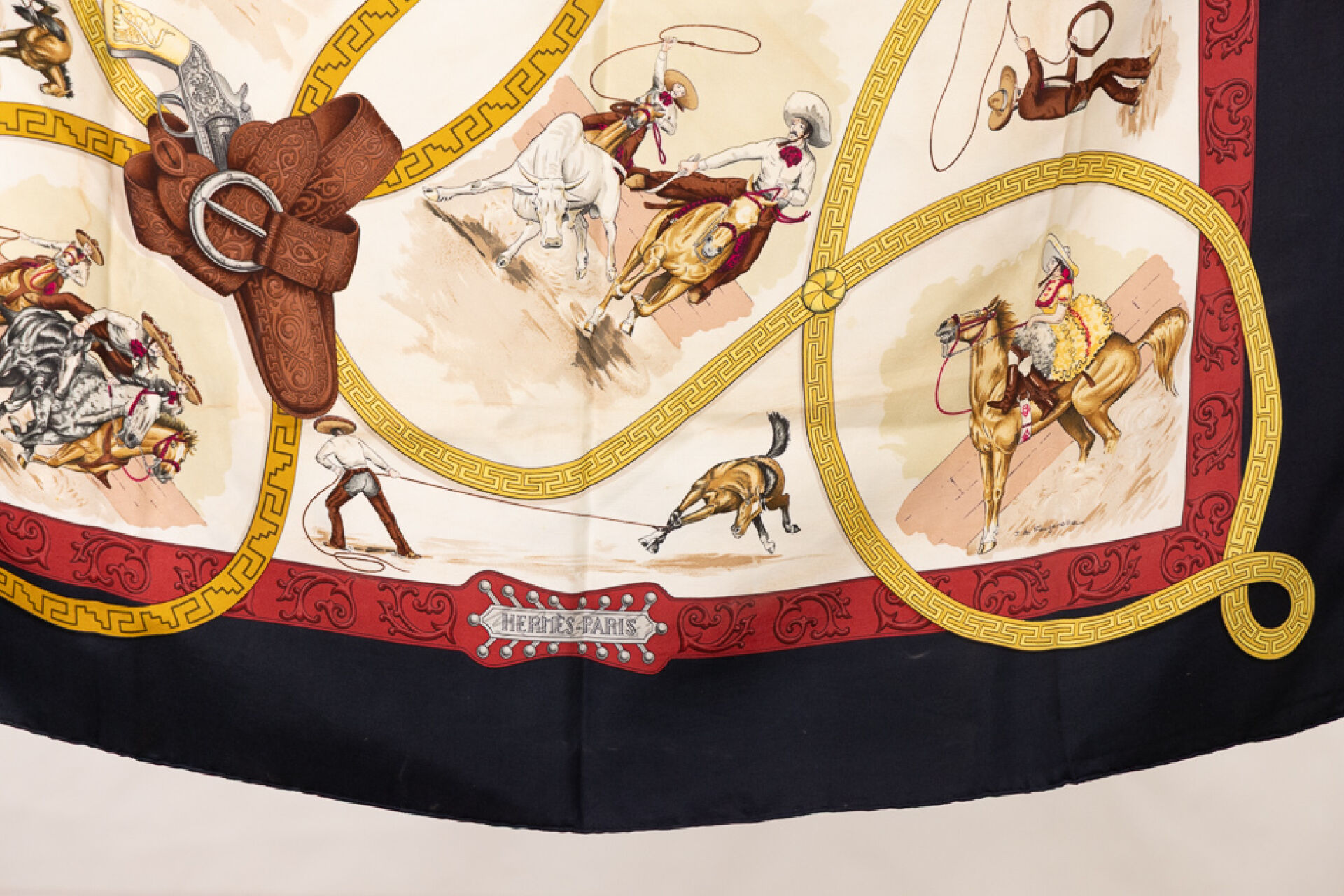 HERMES Paris. Carré en twill de soie imprimé titré "Charreada", signé J de Fougerolle, à dominante rouge, noir, beige, or. 90 x 90 cm Salissures, taches.