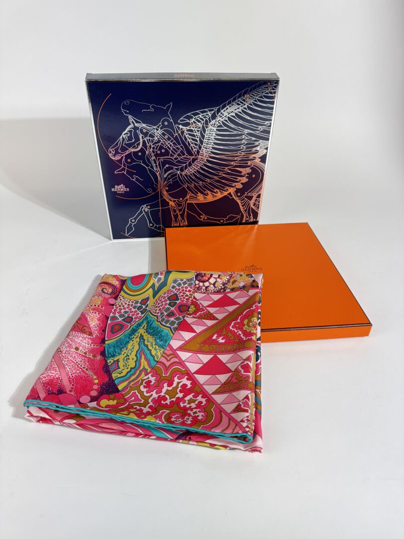 HERMES Paris - Carré en twill de soie imprimée, titré "L'Ivresse de l'Infini", dominantes rose, jaune et turquoise. Dans sa boite et sur boite. 90 x 90 cm Très bon état