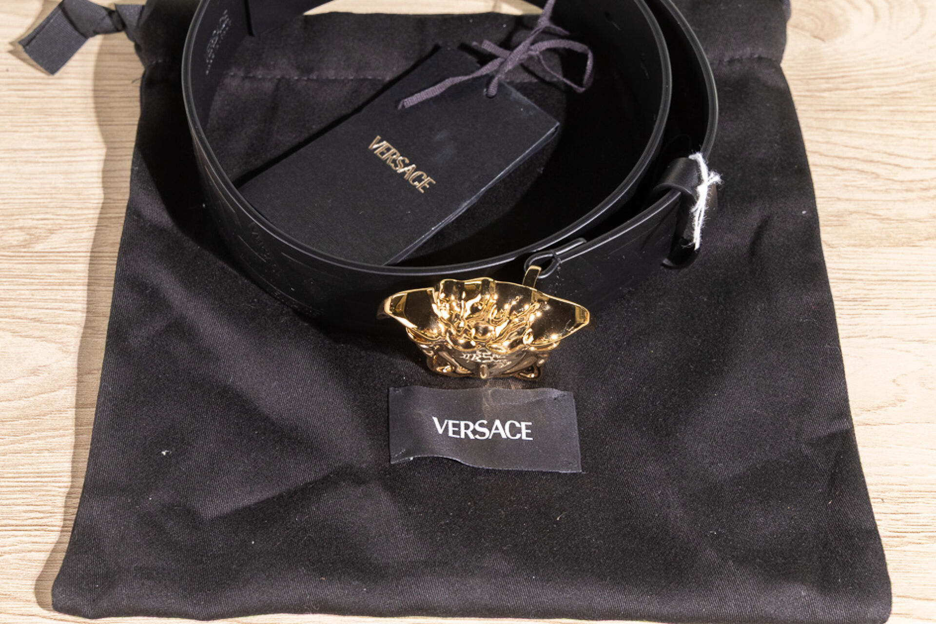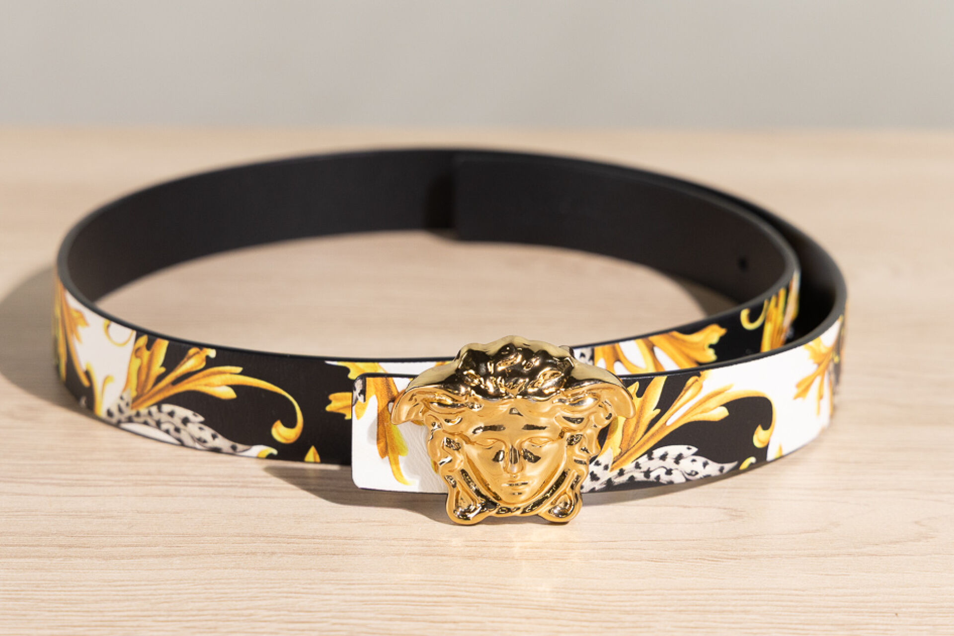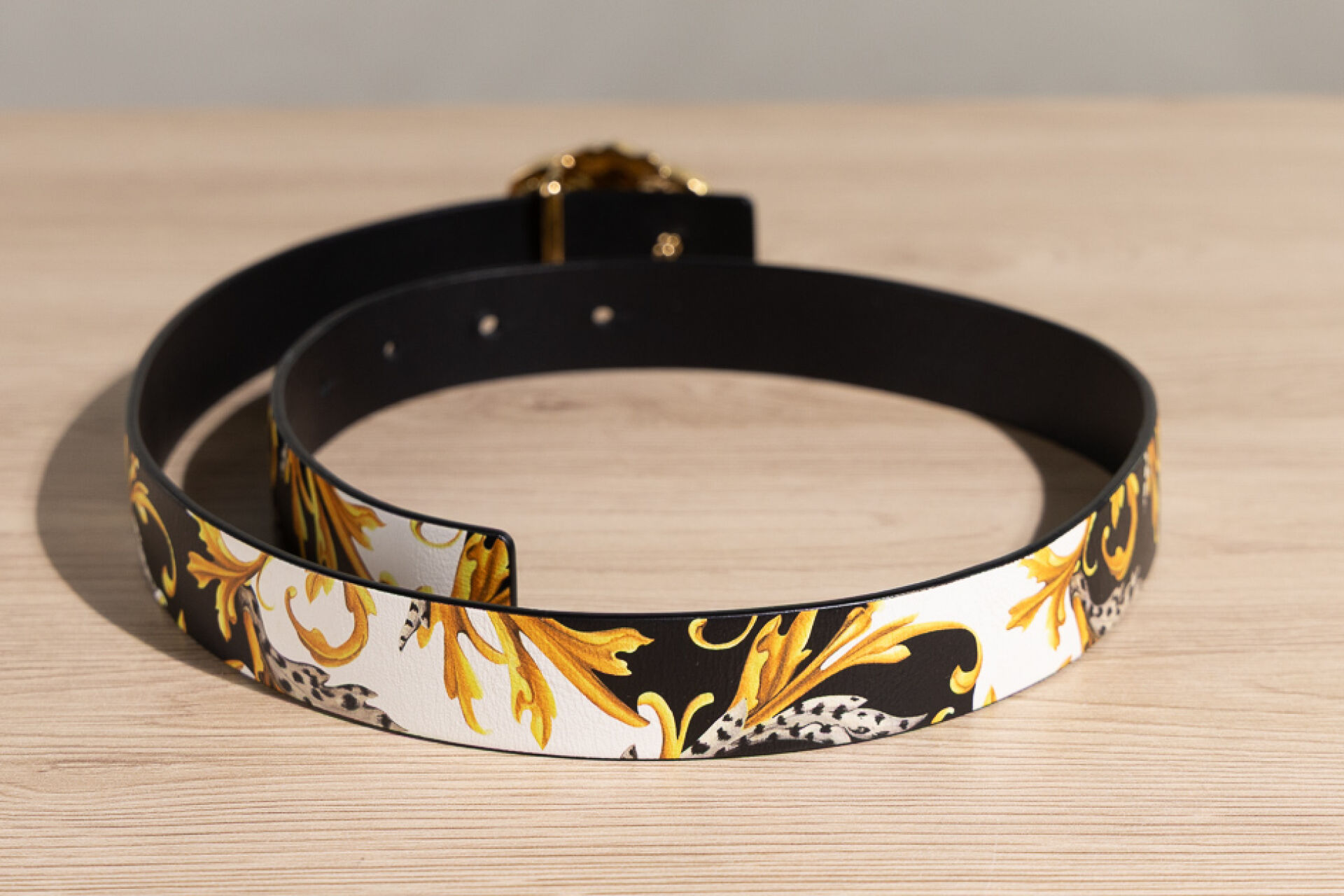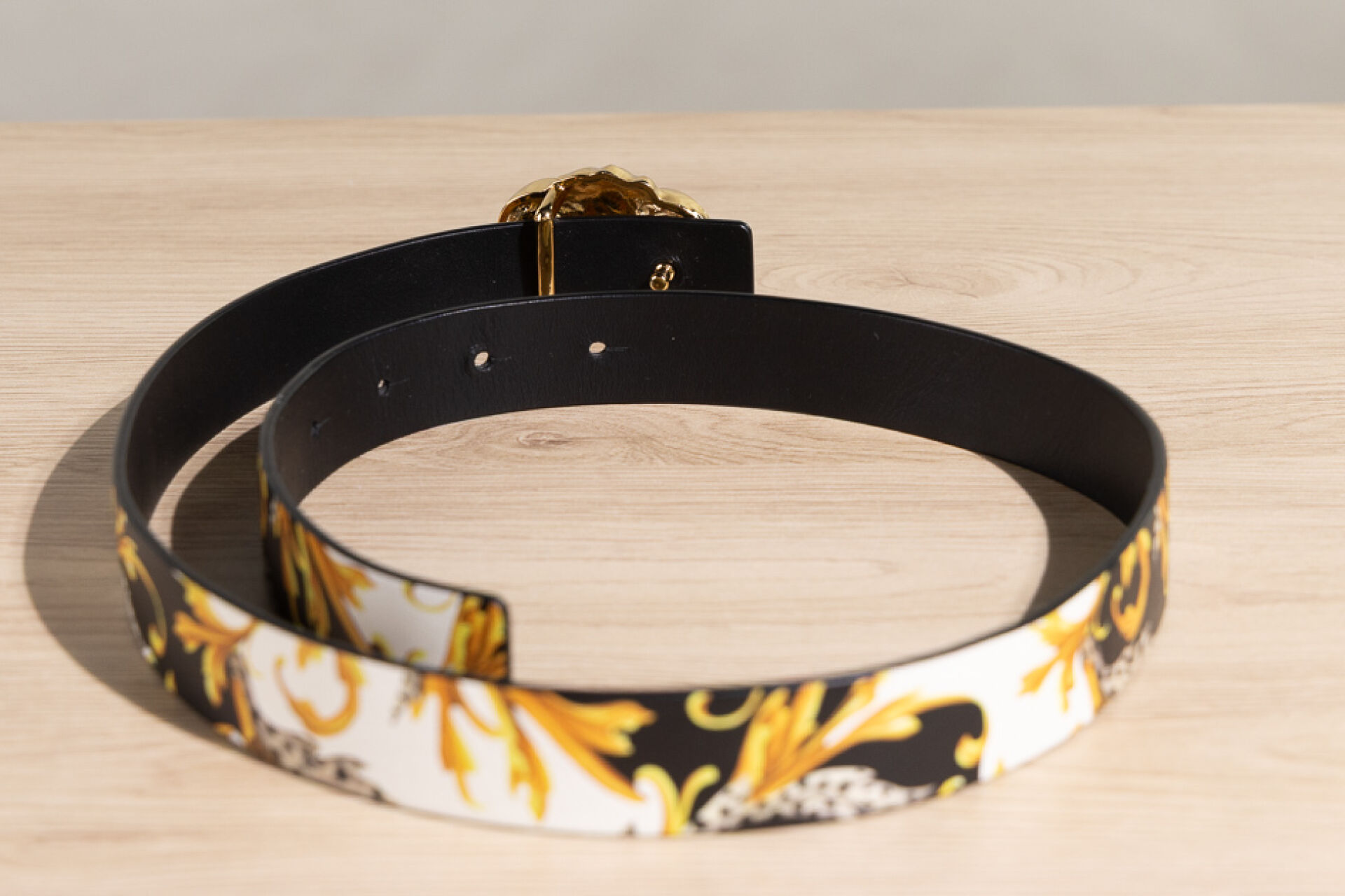 VERSACE - Ceinture en cuir noir imprimé baroque doré et blanc, à boucle Médusa en métal doré. Taille supposée 70 Non portée