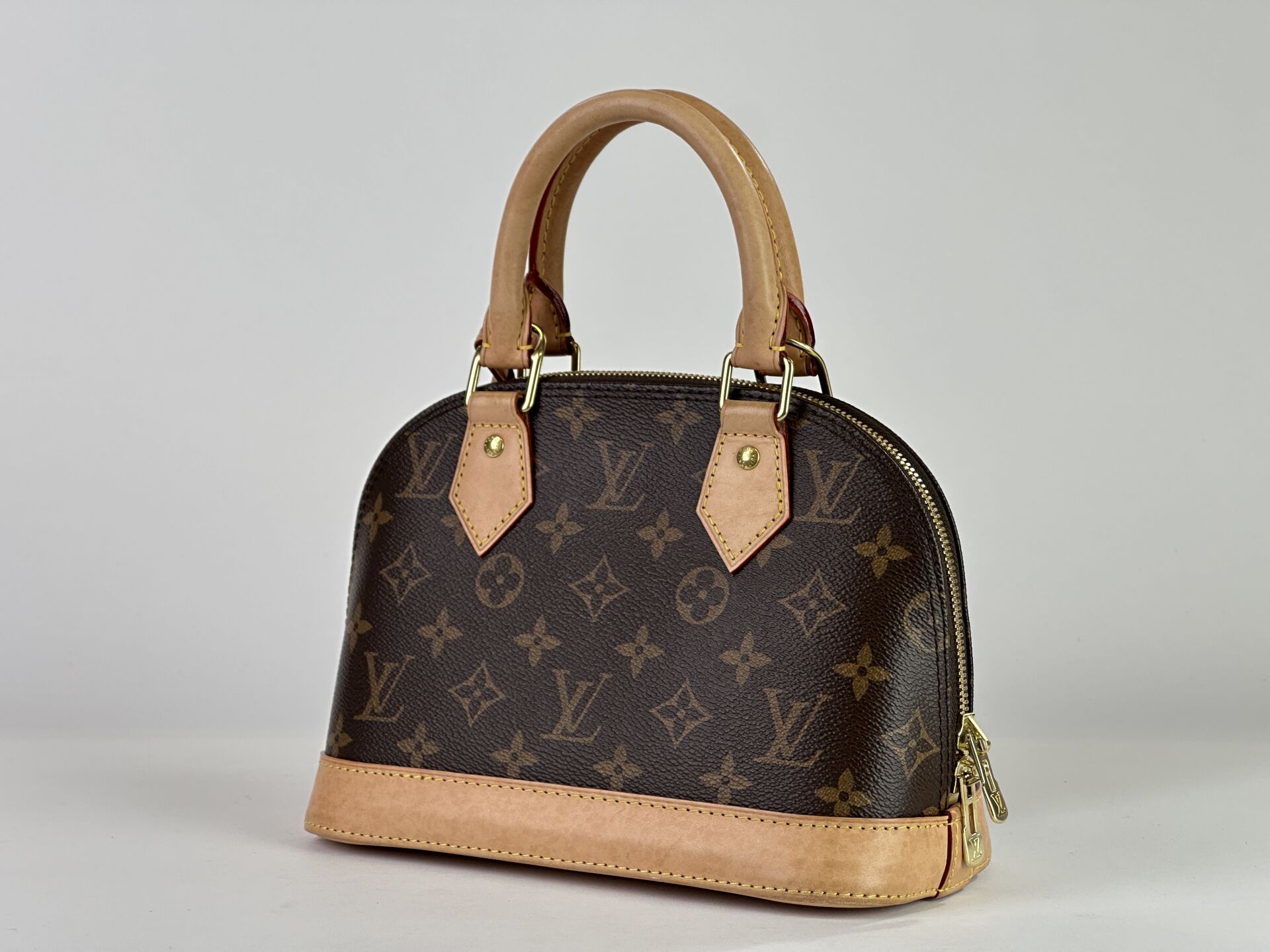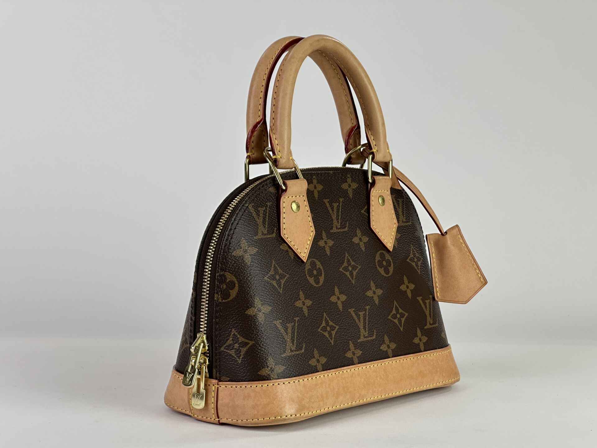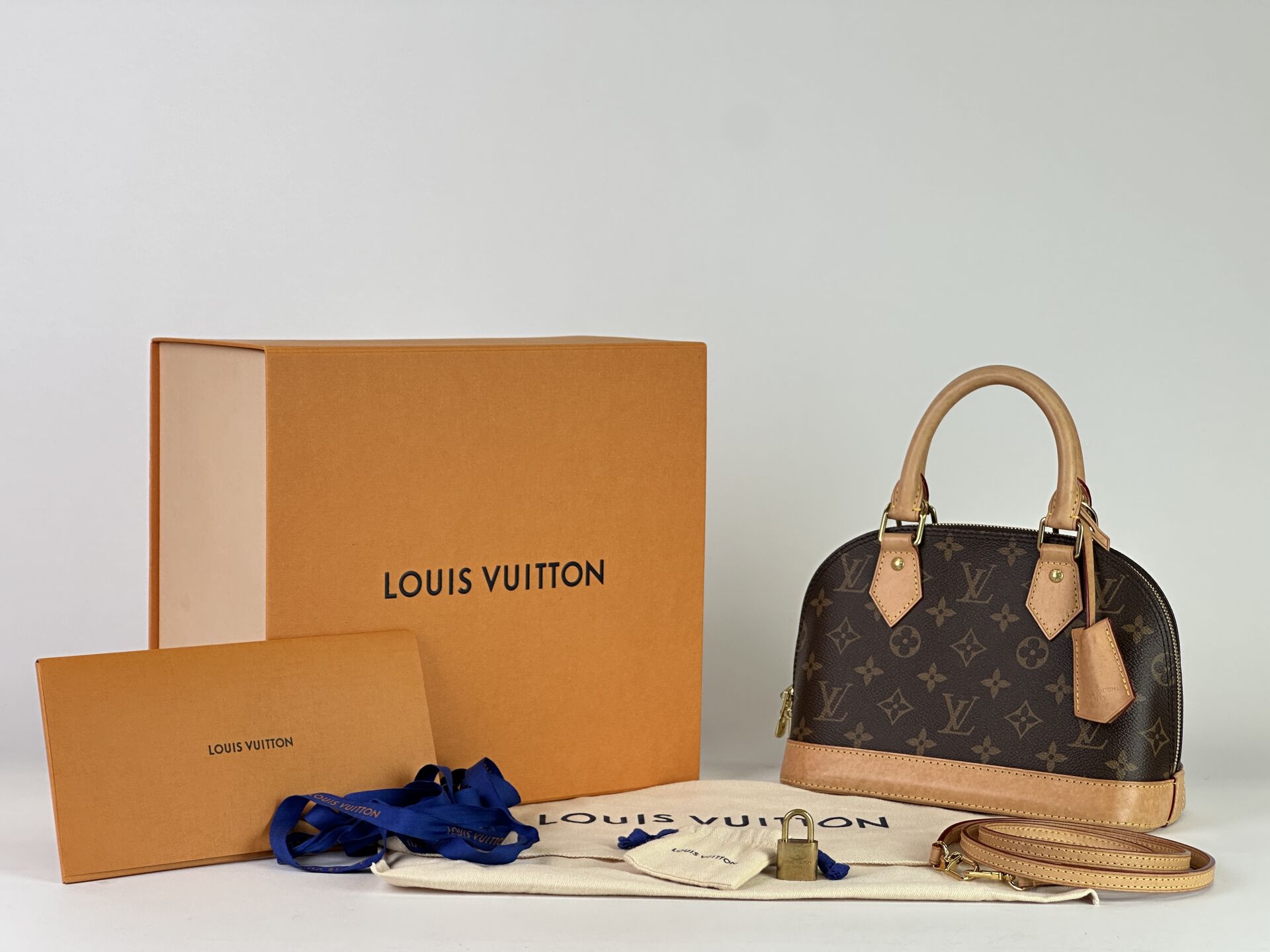 LOUIS VUITTON - Sac Alma BB en toile Monogram et cuir naturel, double poignée, fermeture à glissière à double curseur, cadenas, deux clefs, doublure en toile marron, anse bandoulière amovible. Dust bag, facture, boite (abimée). Haut. : 17cm - Long. : 24 cm Quelques légères taches, notamment à la base