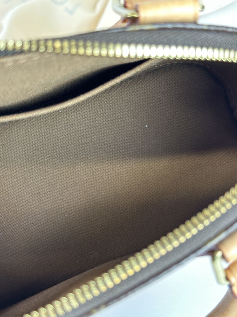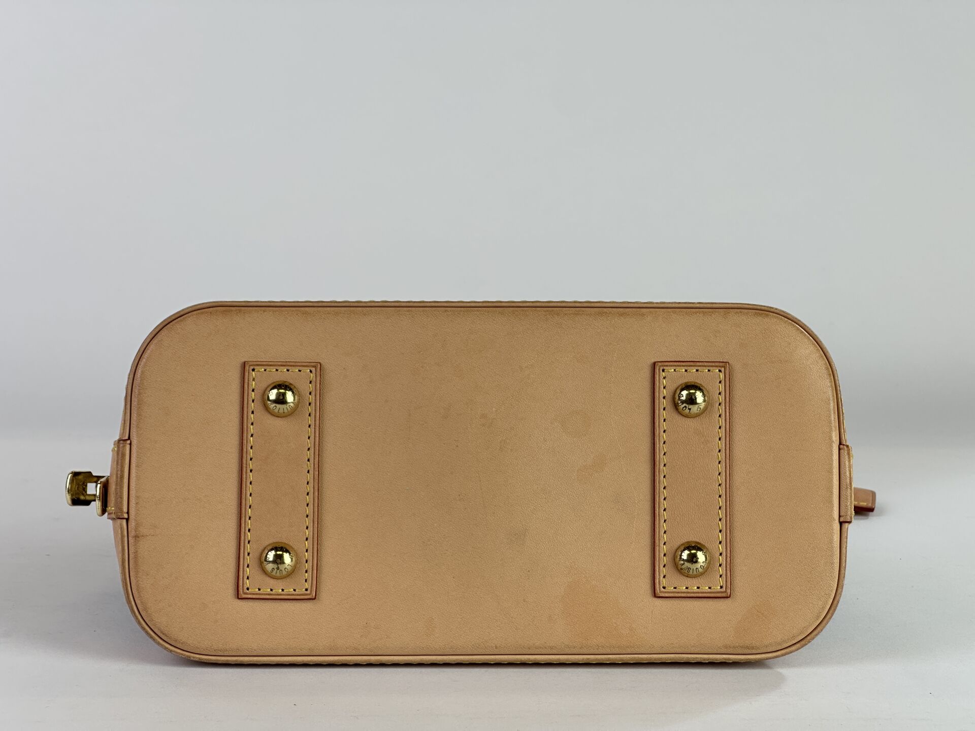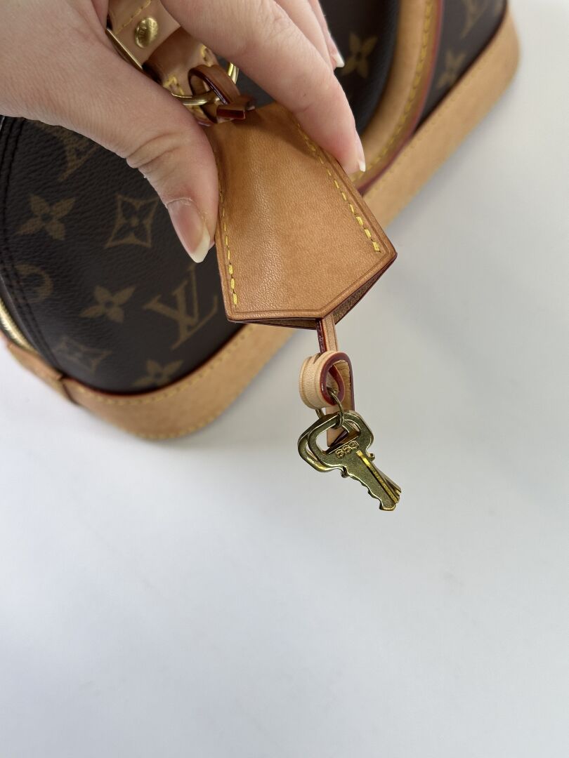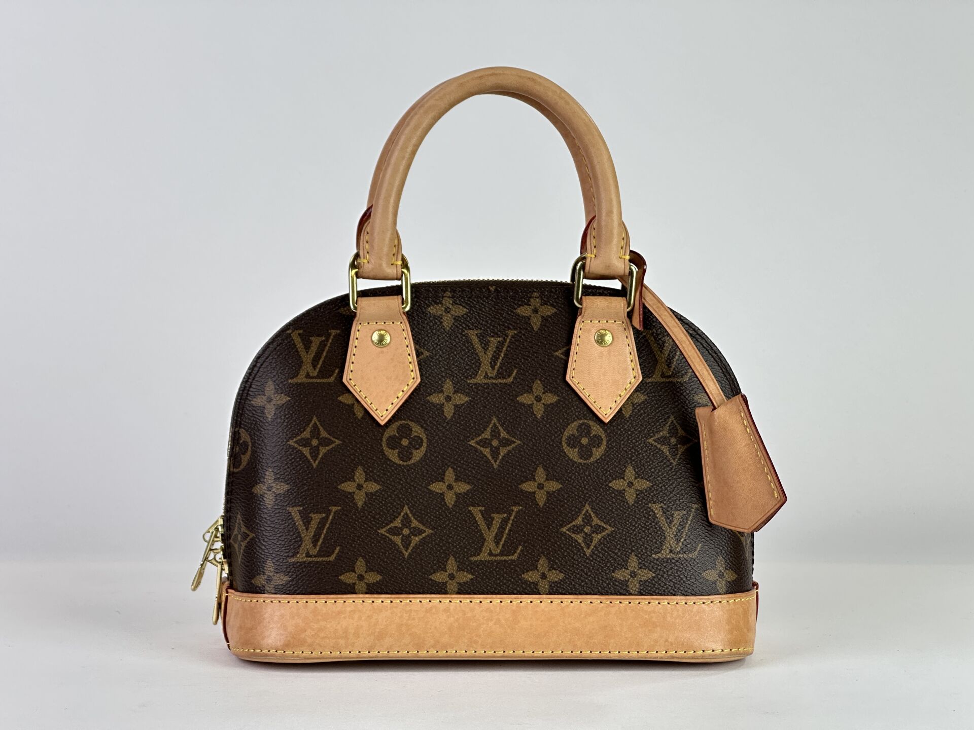 LOUIS VUITTON - Sac Alma BB en toile Monogram et cuir naturel, double poignée, fermeture à glissière à double curseur, cadenas, deux clefs, doublure en toile marron, anse bandoulière amovible. Dust bag, facture, boite (abimée). Haut. : 17cm - Long. : 24 cm Quelques légères taches, notamment à la base