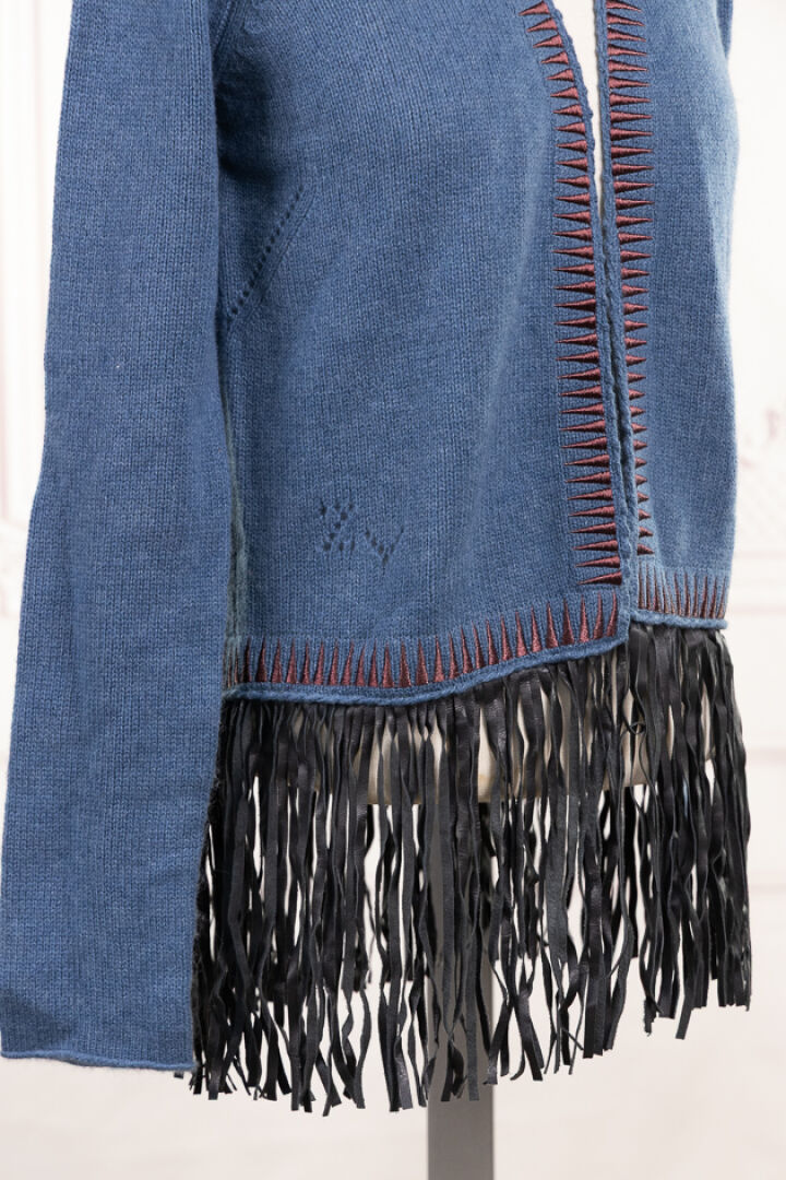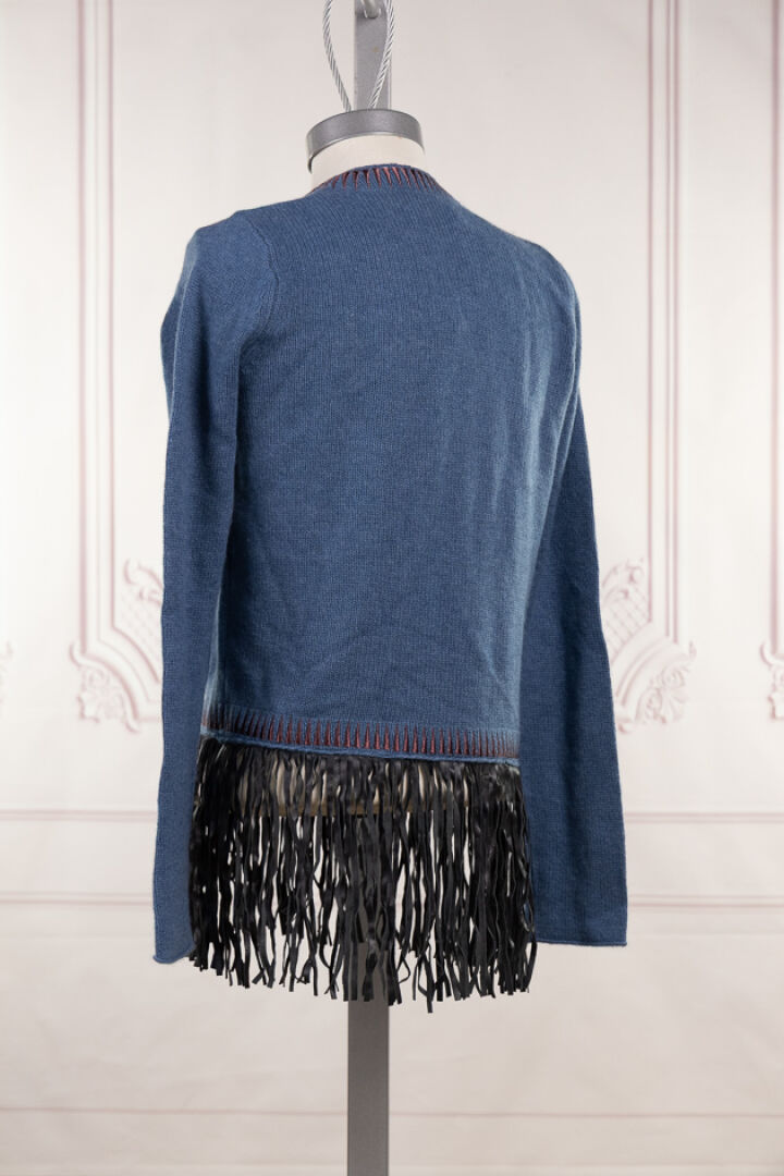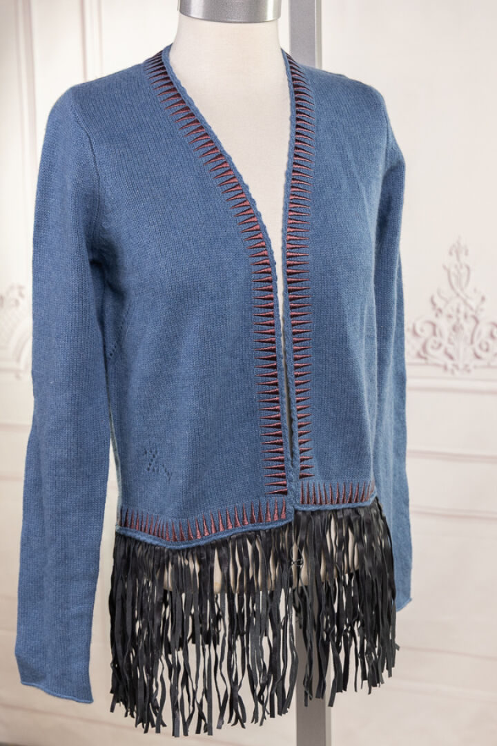 ZADIG & VOLTAIRE Deluxe - Gilet en cachemire chiné bleu ciel, sans fermeture à ganse triangulaire, manches longues, bas à franges de cuir gris. Taille S Non porté, étiquette d'origine