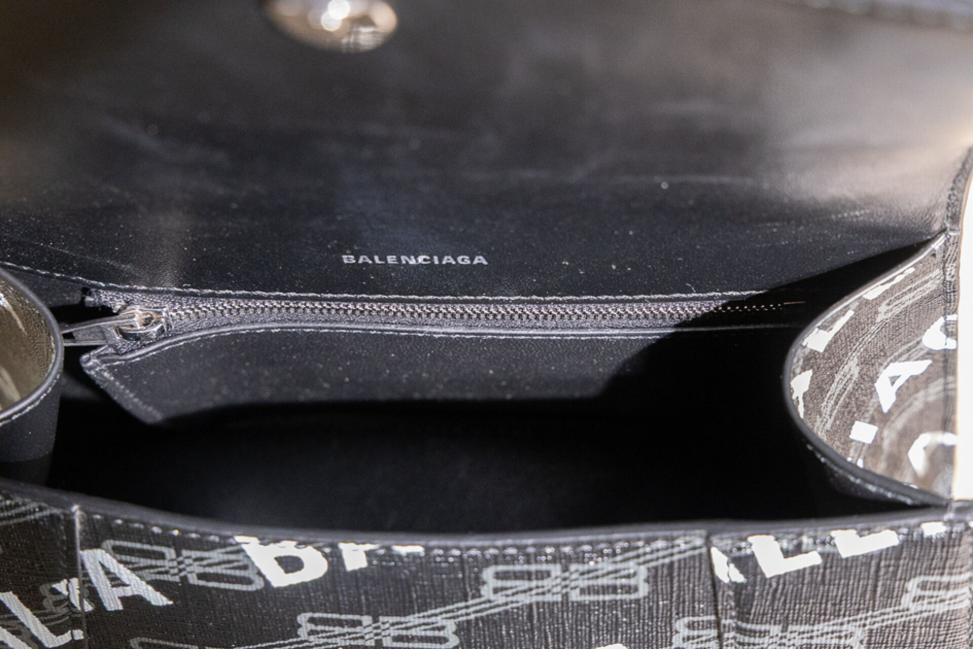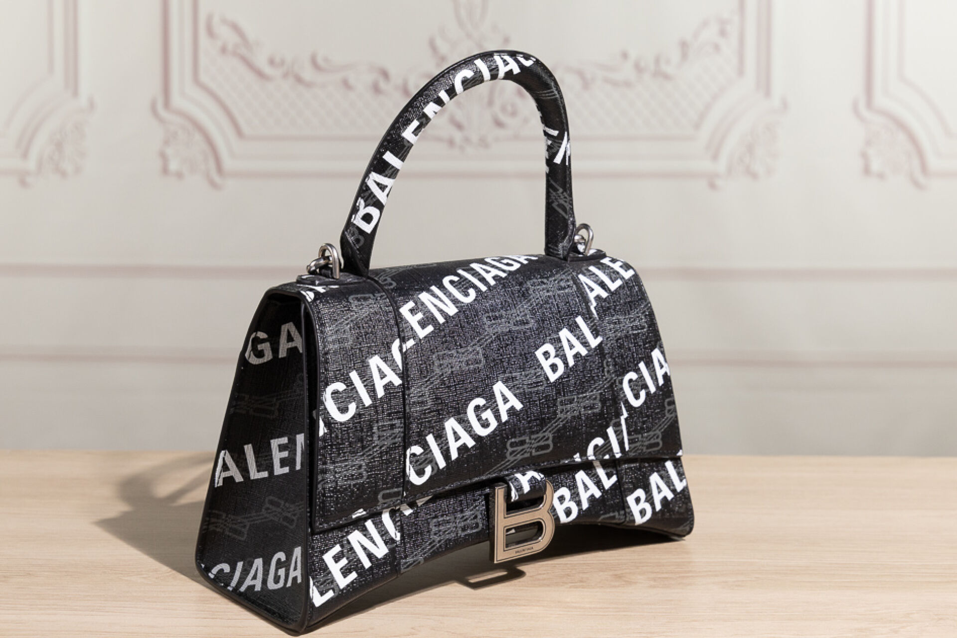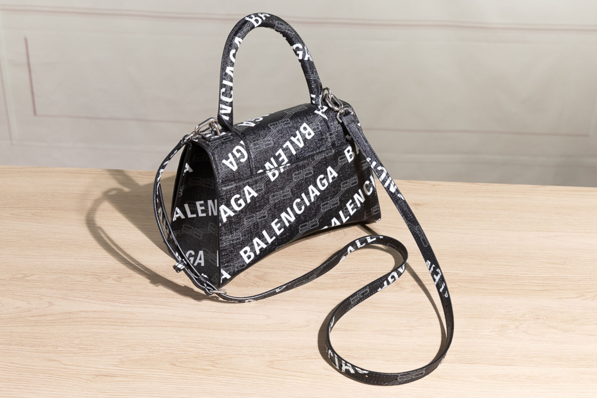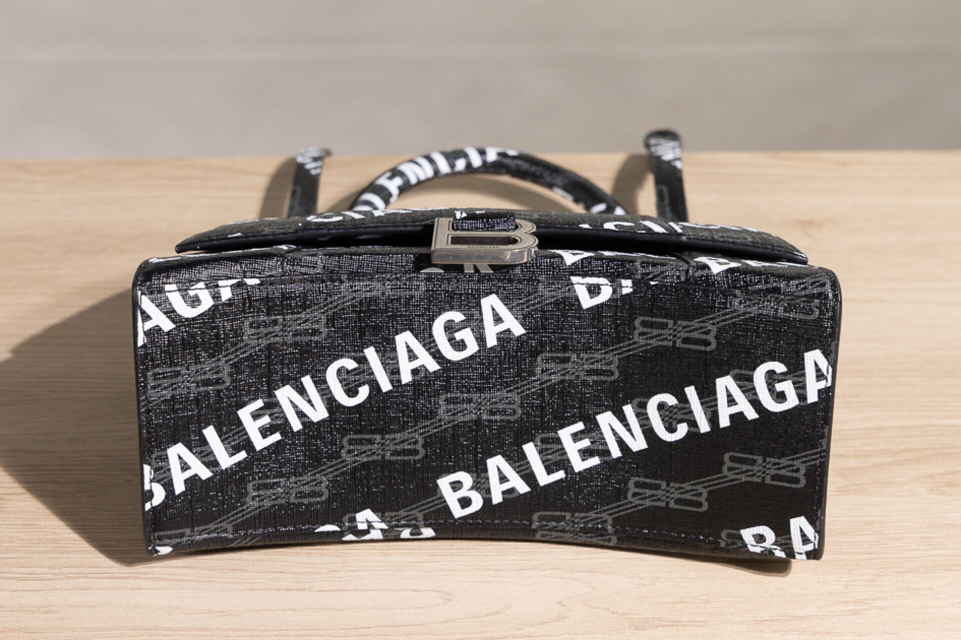 BALENCIAGA - Sac "Hourglass" en toile enduite siglée et signée en bayadère noir, gris, blanc, fermoir aimanté sous rabat, poignée, anse bandoulière amovible, poche plaquée au dos. Haut. : 14 cm - Long. : 22 cm Numéroté :592546-1960-0-643888 Bon état