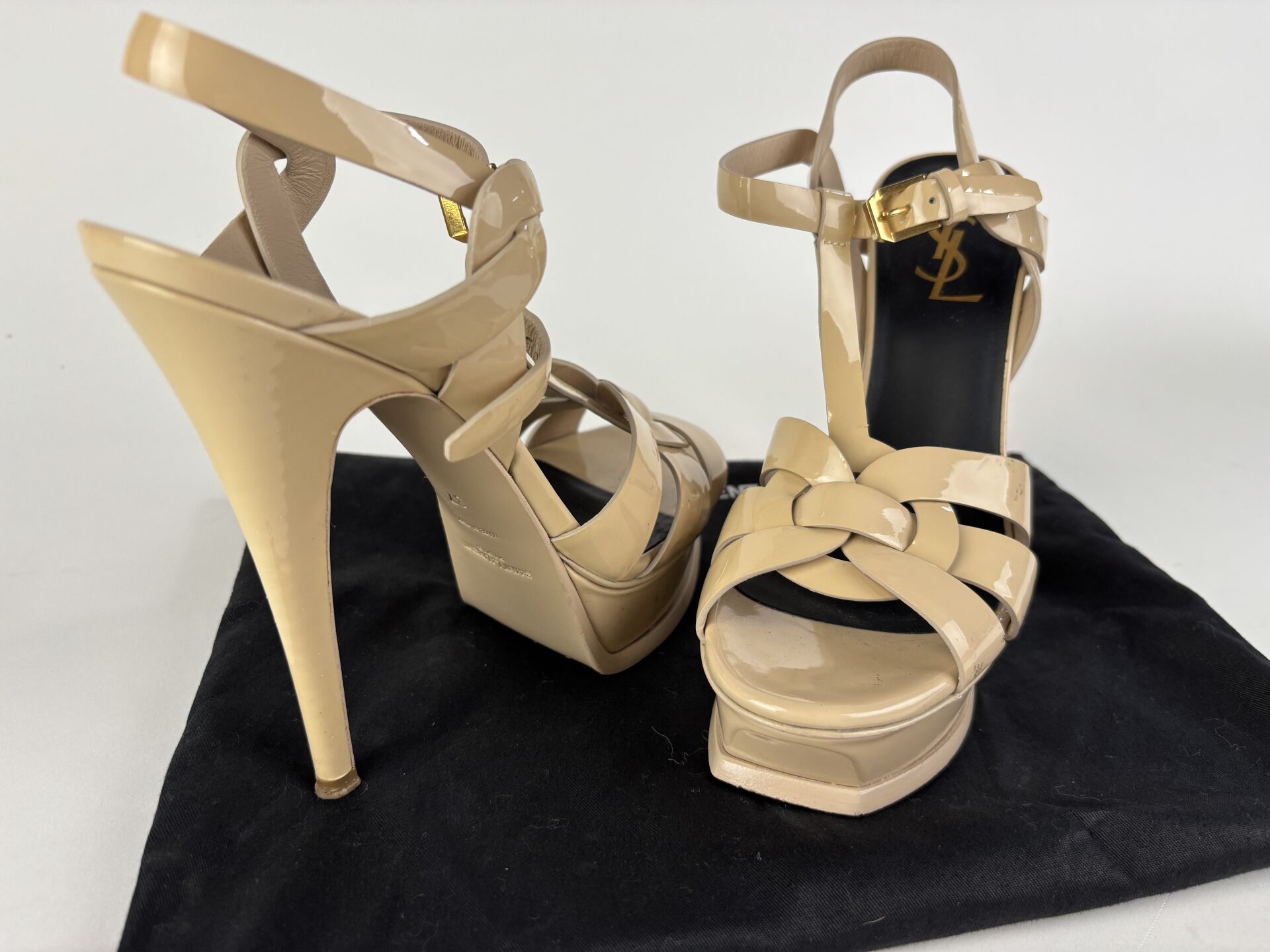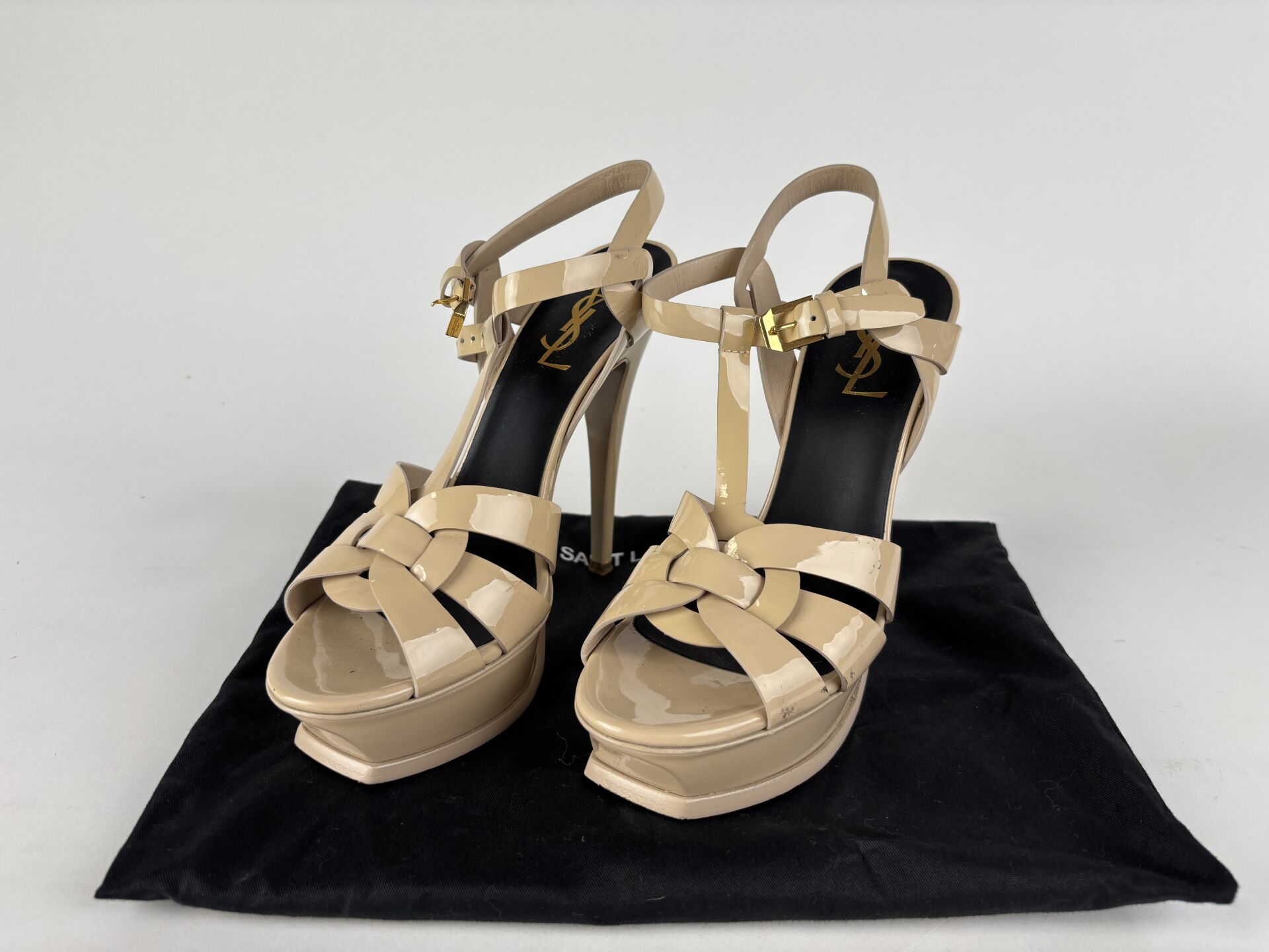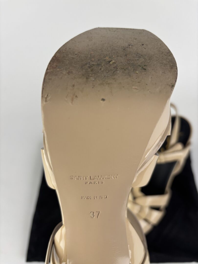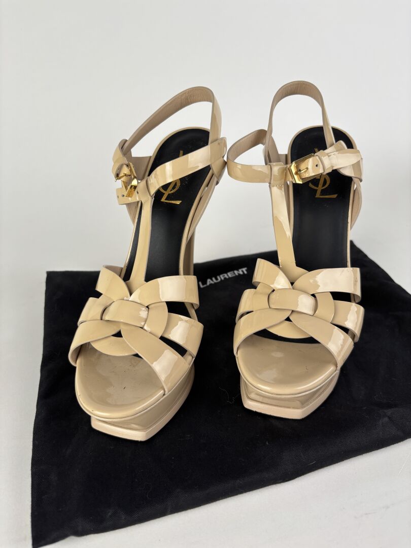 SAINT LAURENT - Paire de sandales modèle "Tribute" en cuir verni crème, plateforme avant, talons. Pointure 37 - Haut. du talon : 12 cm Bon état général, marques sur les côtés