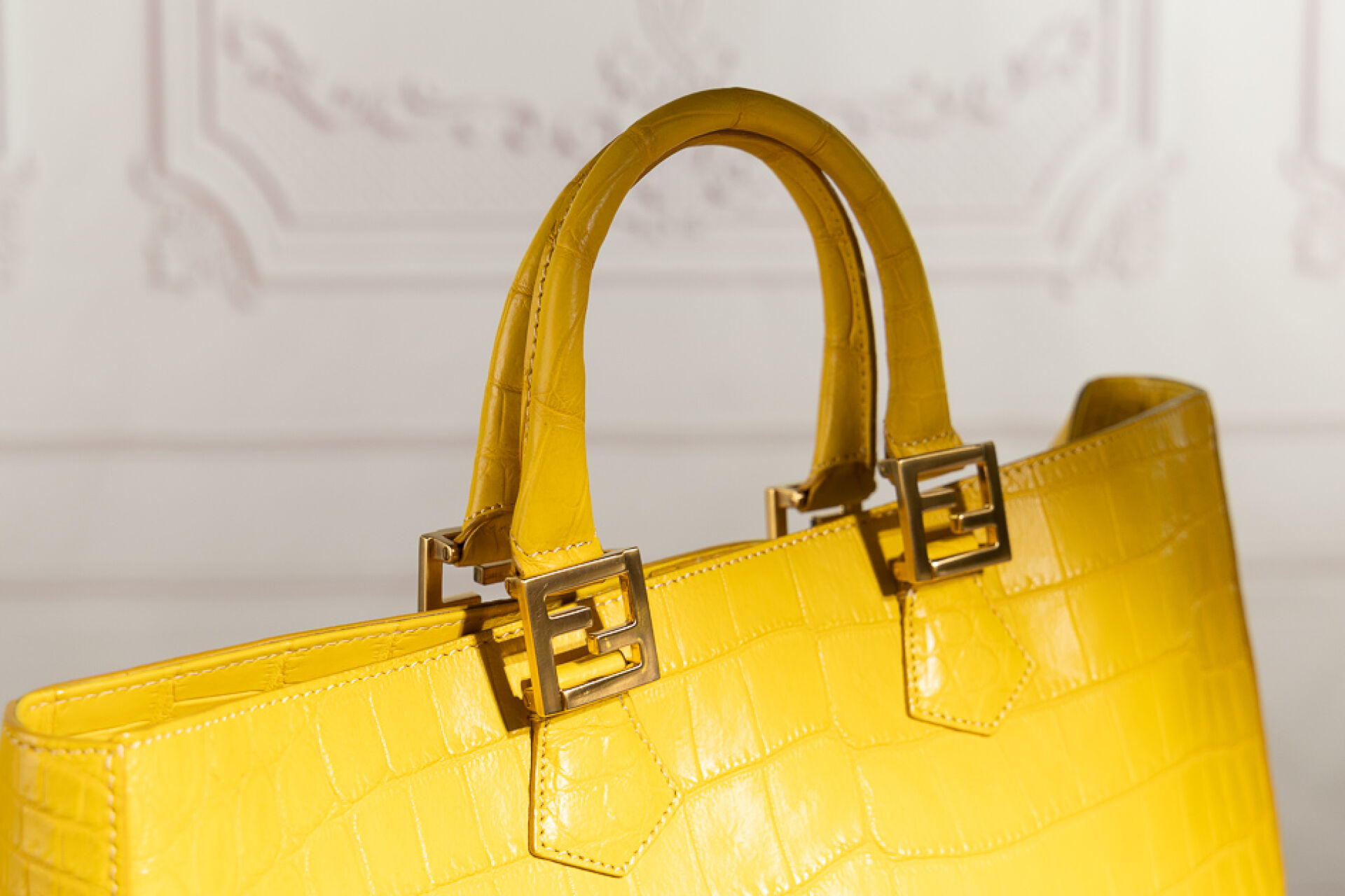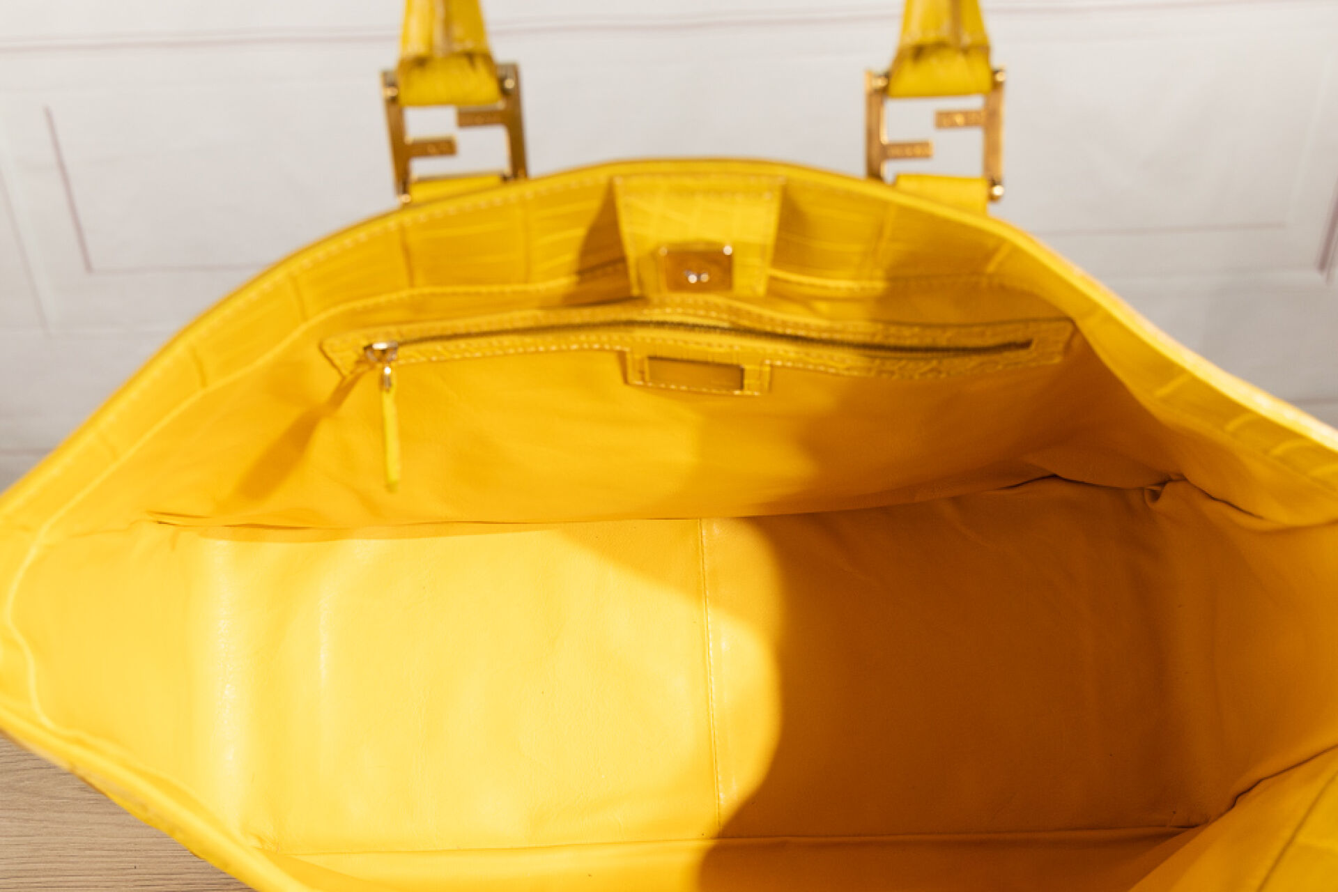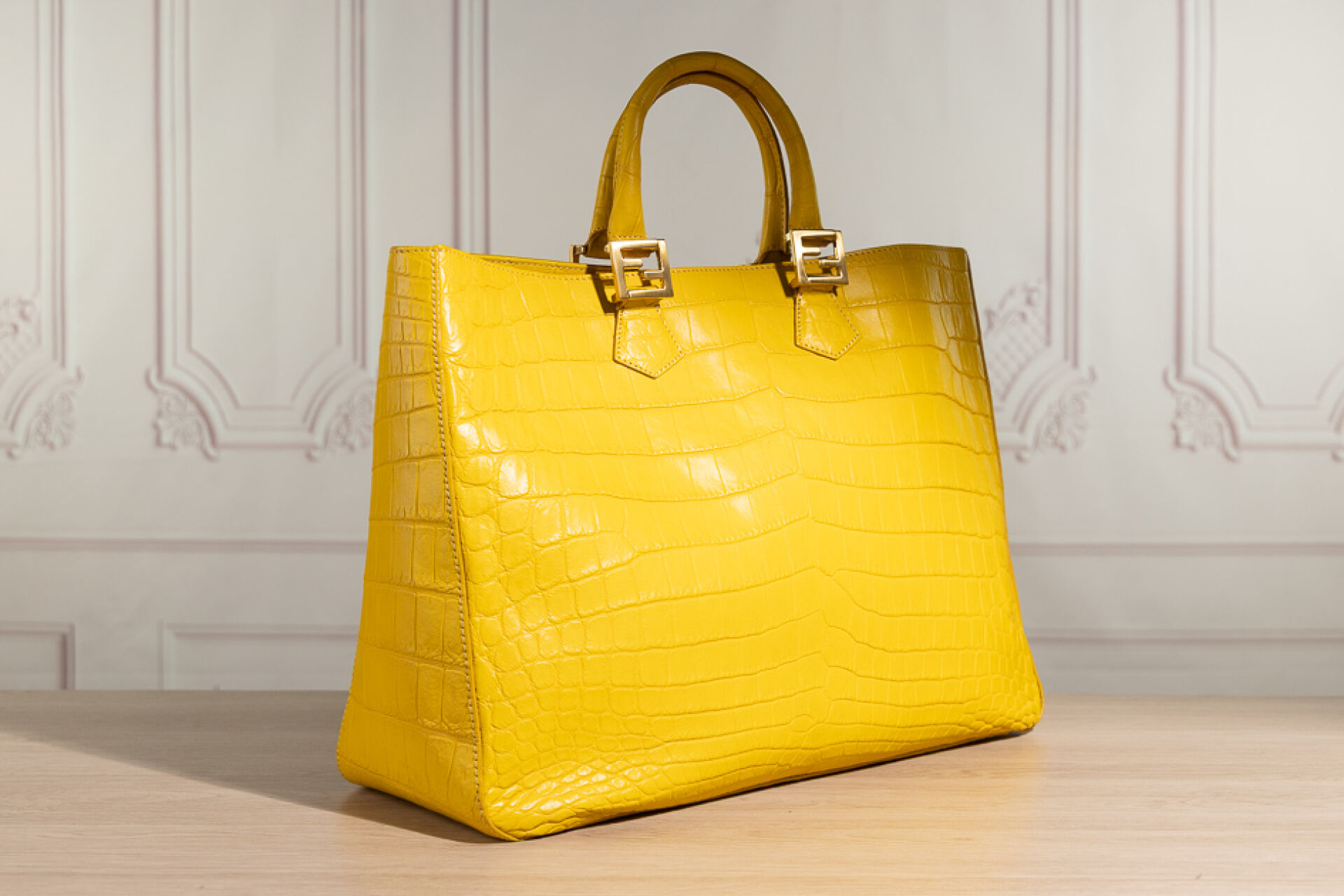 FENDI - Sac cabas en cuir jaune façon croco, double poignées aux attaches sigles dorés, fermoir aimanté. Dustbag. Haut. : 30 cm - Long. : 42 cm Usures