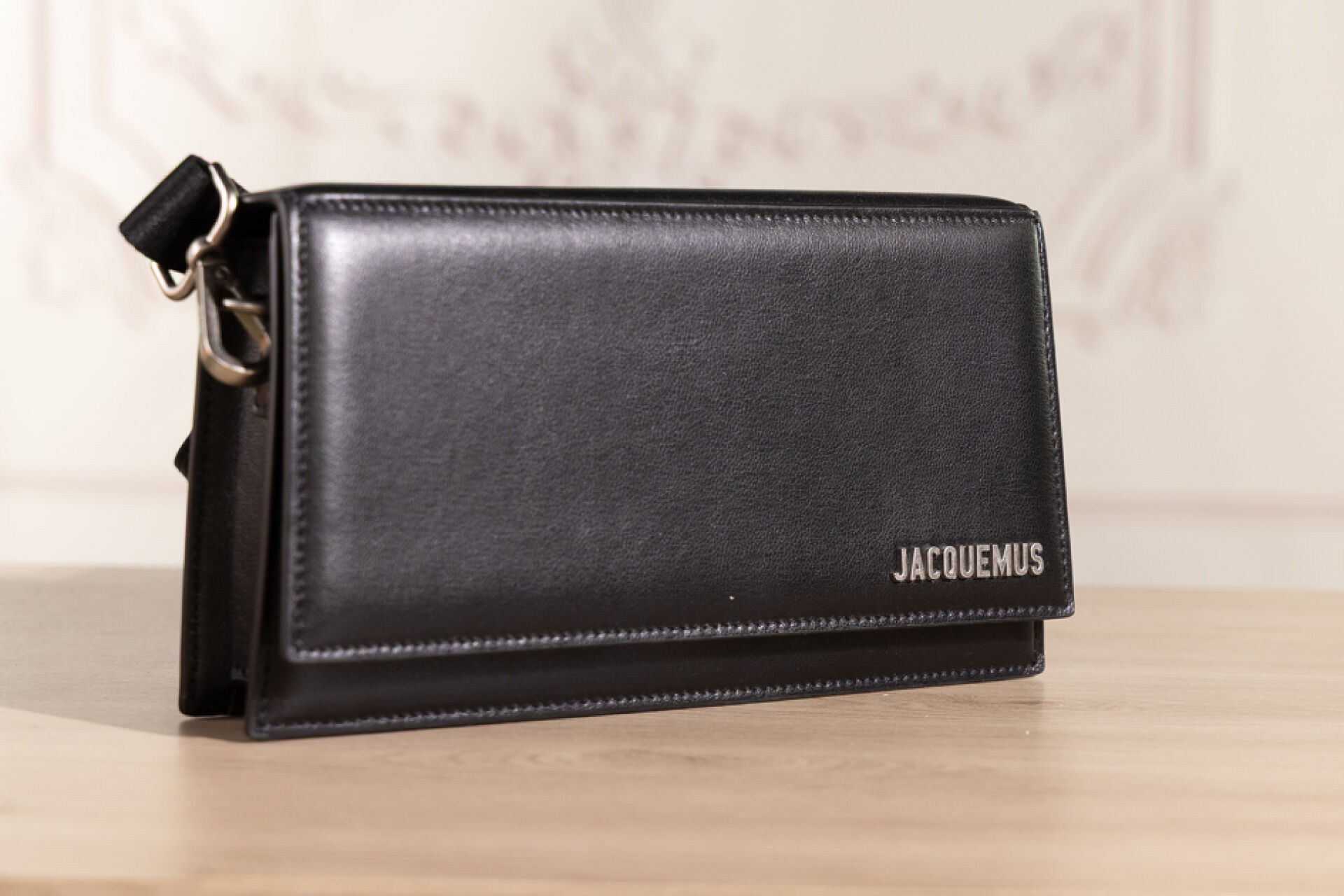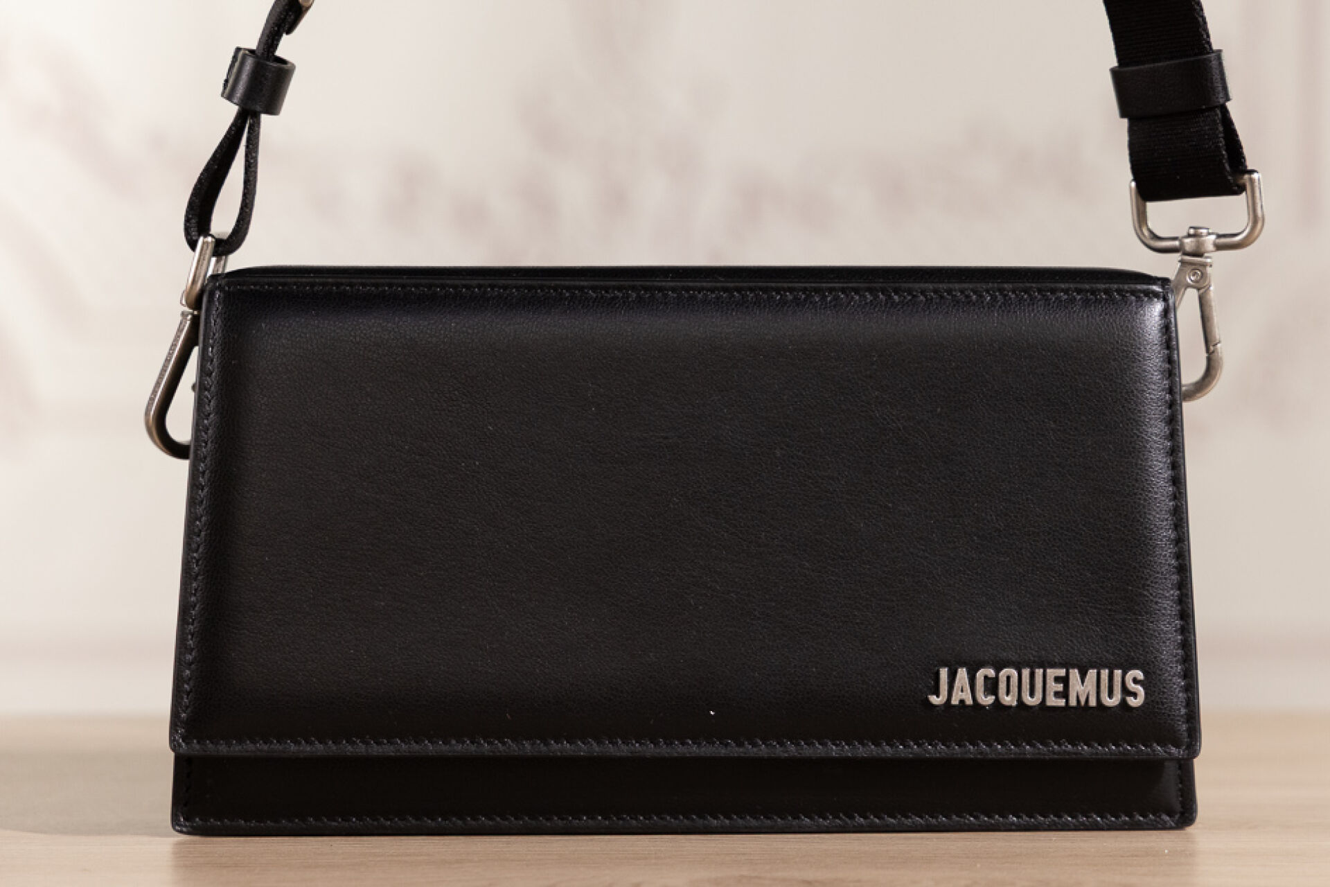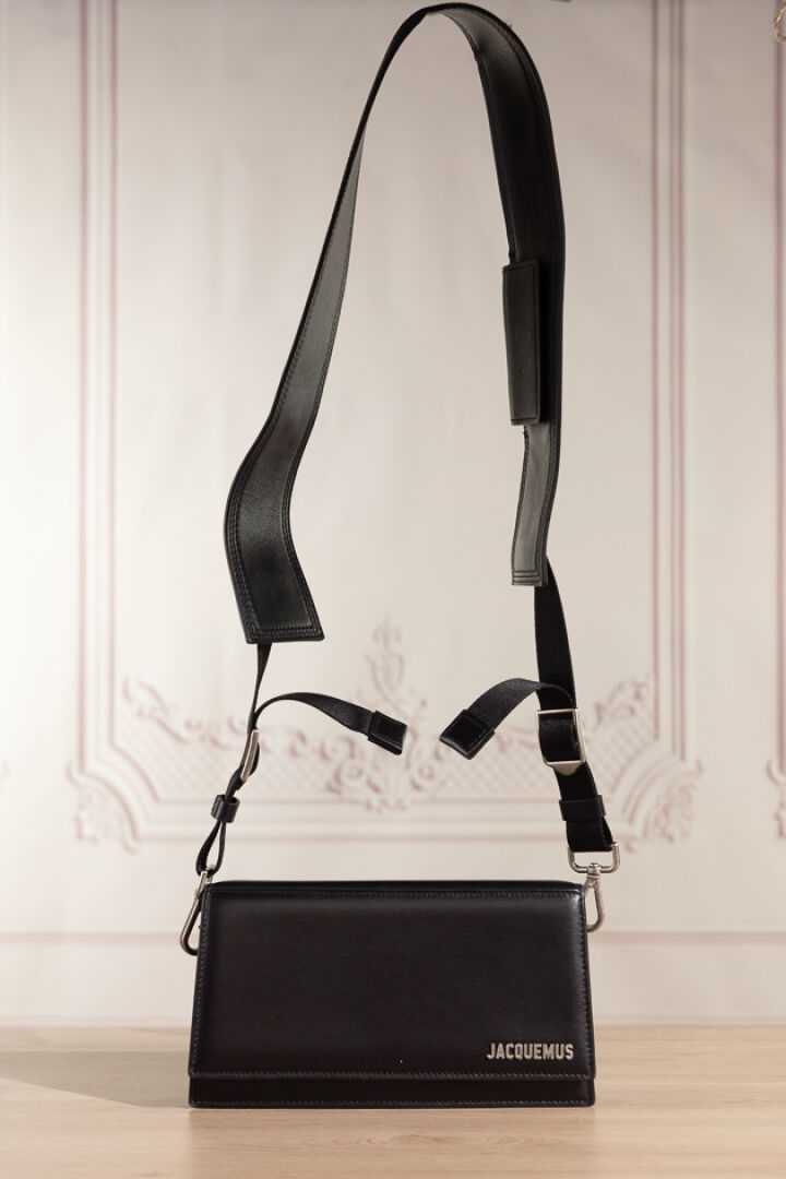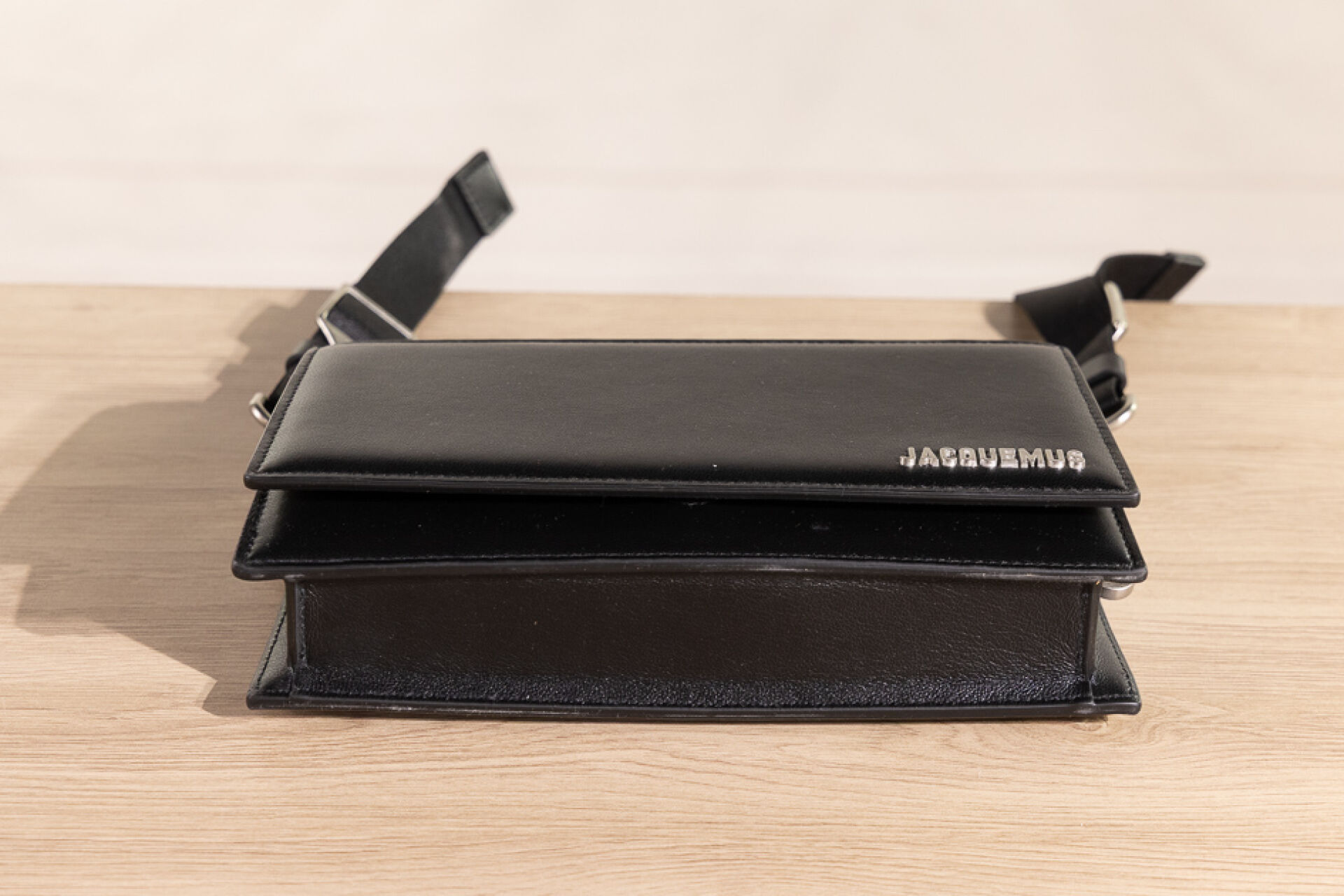 JACQUEMUS - Sac "Bambino" homme en cuir noir, fermoir aimanté sous rabat, doublure en toile beige, large anse bandoulière réglable amovible. Dustbag. Haut. : 13 cm - Long. : 22 cm Non porté