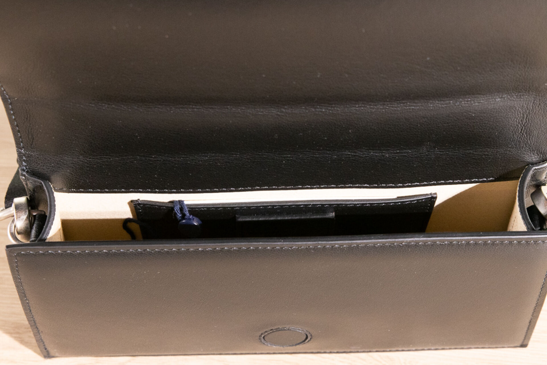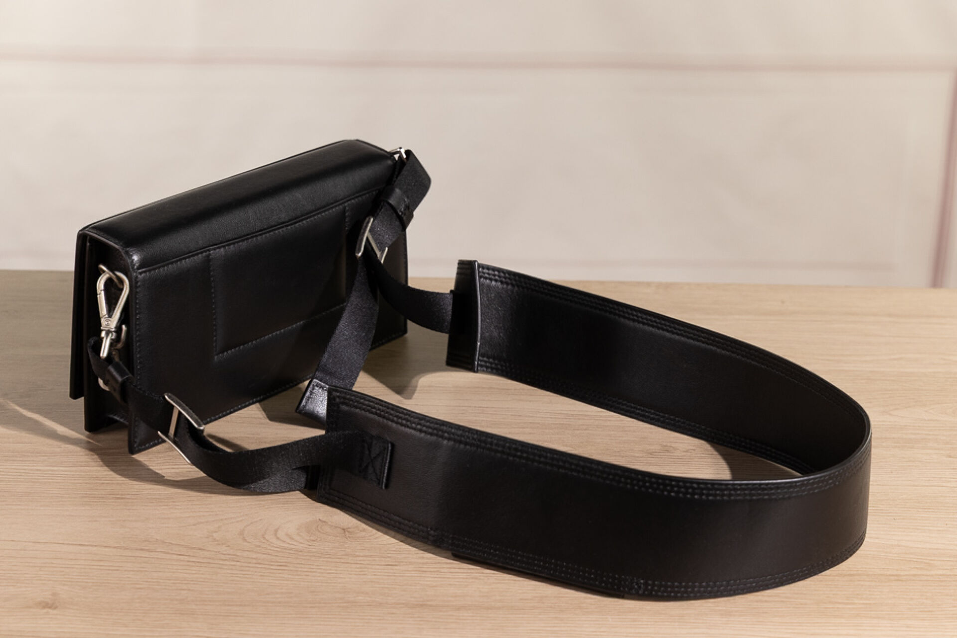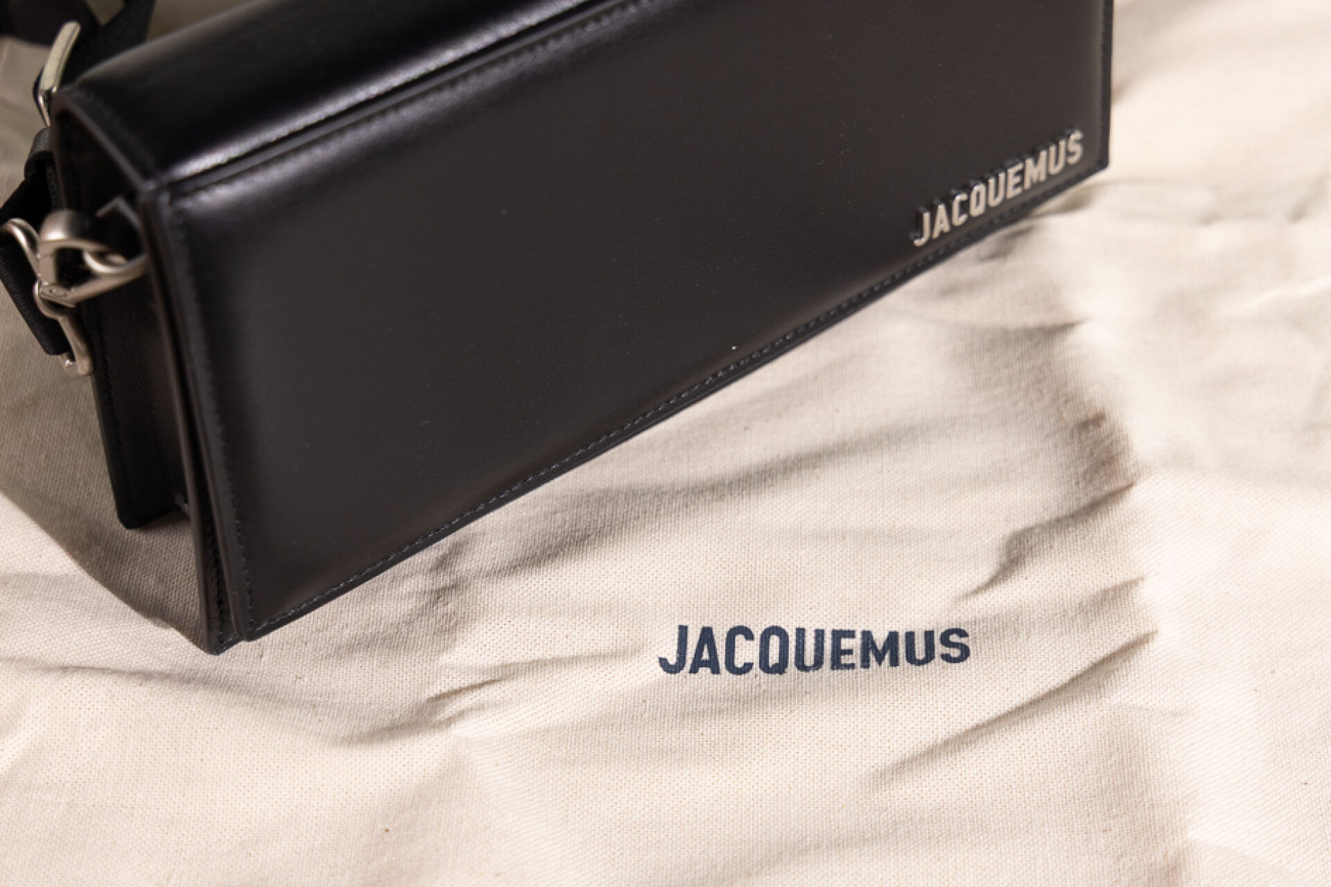 JACQUEMUS - Sac "Bambino" homme en cuir noir, fermoir aimanté sous rabat, doublure en toile beige, large anse bandoulière réglable amovible. Dustbag. Haut. : 13 cm - Long. : 22 cm Non porté