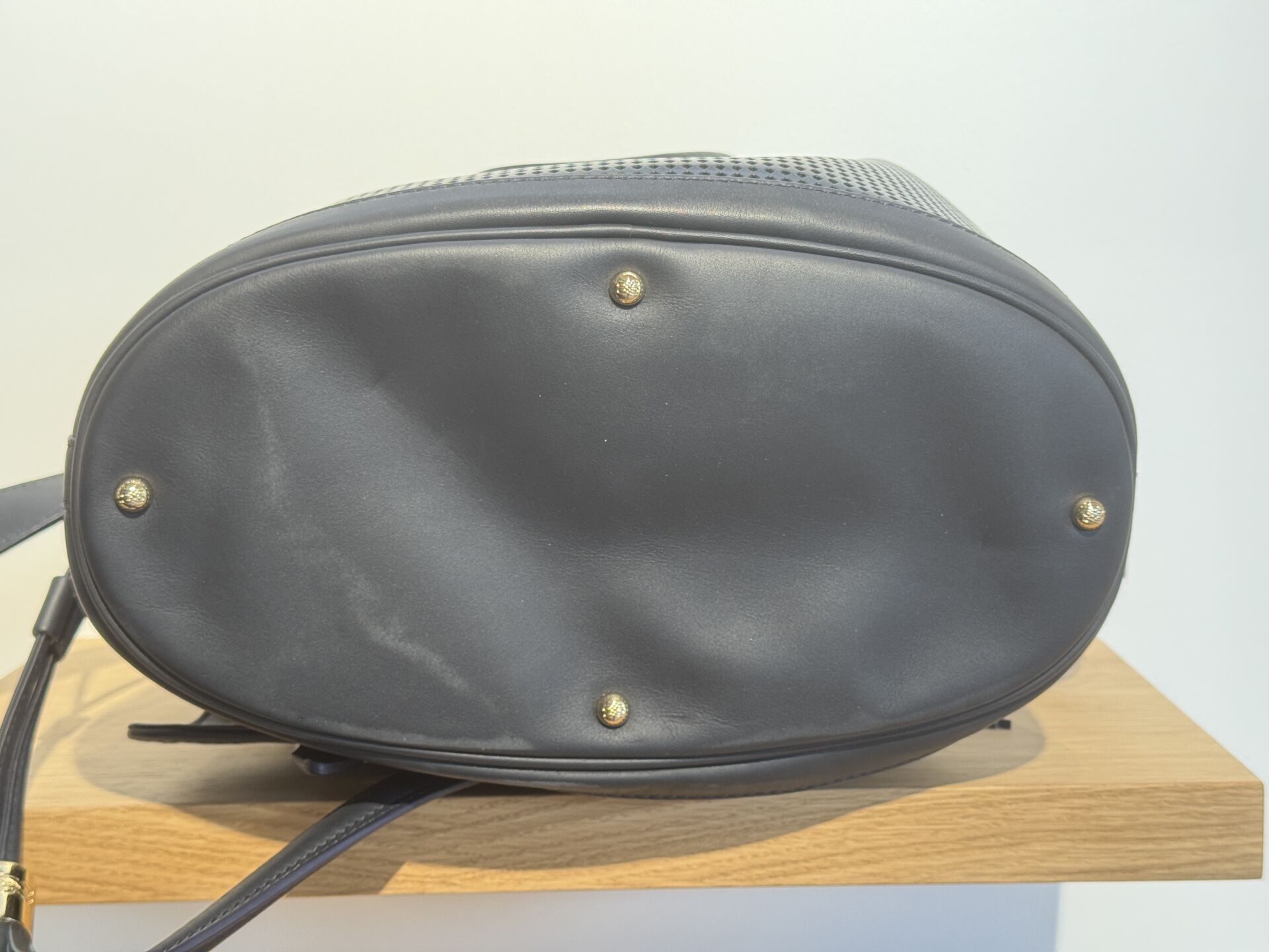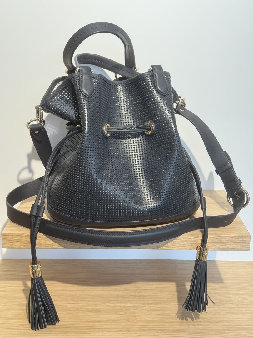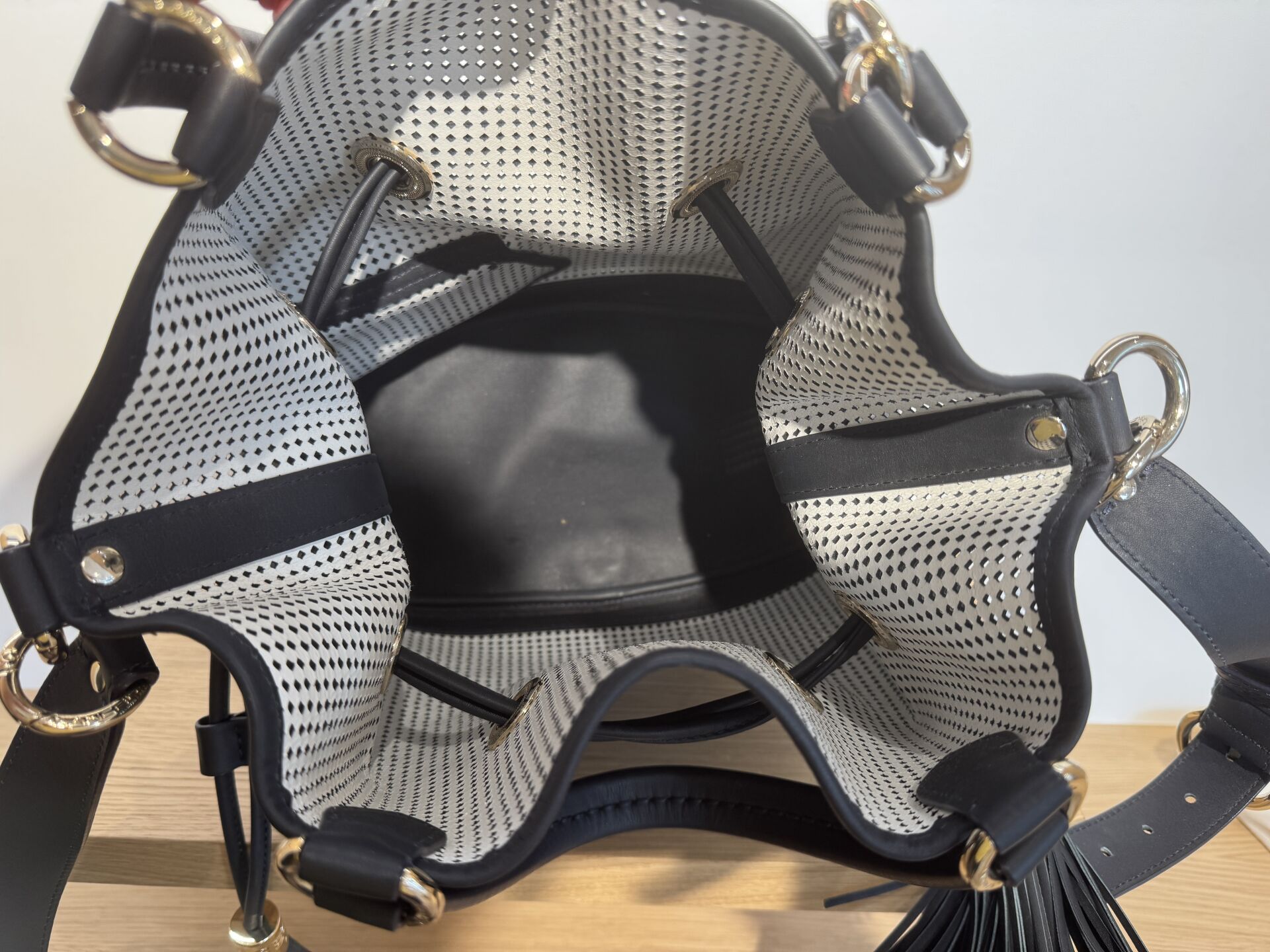 LANCEL - Sac "Premier Flirt" en cuir ajouré bleu marine, intérieur blanc, fermeture coulissée par un double lien, accastillage métal doré, double anses et anse bandoulière, pompons. Long. : 29,5 cm Légères traces au dessous, très bel état