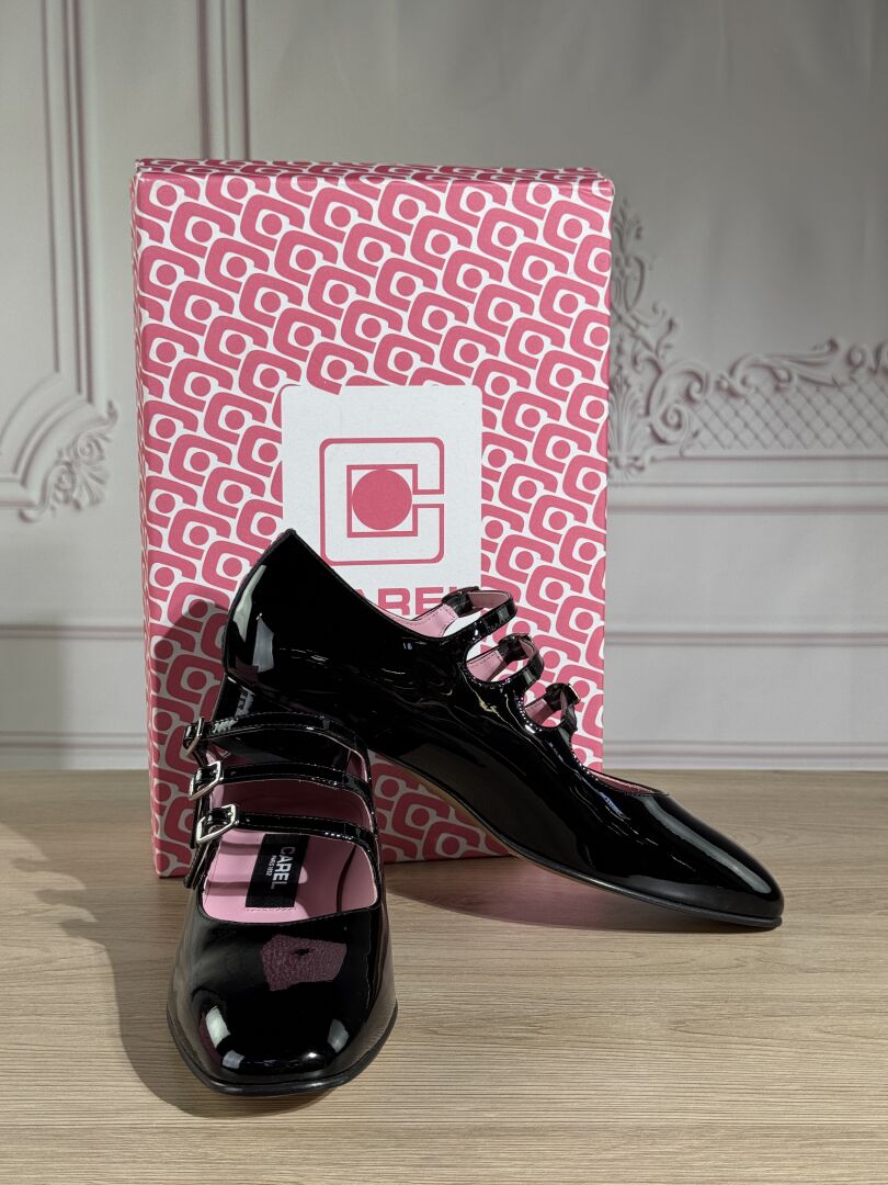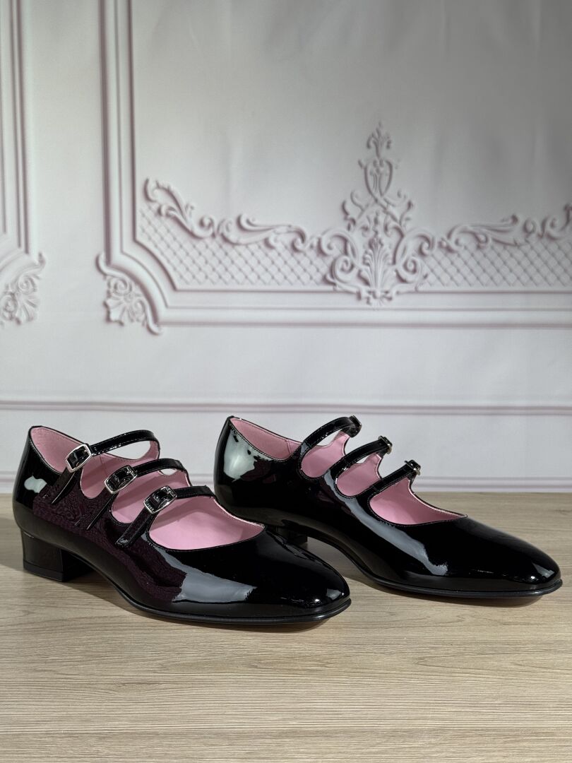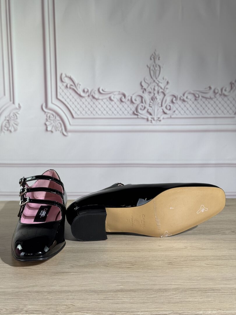 CAREL - Paire de souliers, modèle "Ariana", cuir agneau noir vernis, trois brides, petits talons. Pointure 37 - Haut du talon : 2,5 cm Etat neuf
