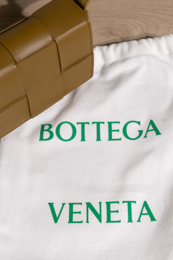 BOTTEGA VENETA - Mini sac "Cassette" en cuir tressé kaki, fermoir aimanté sous rabat, anse réglable. Dustbag. Haut : 9 cm - Long. : 13 cm Non porté