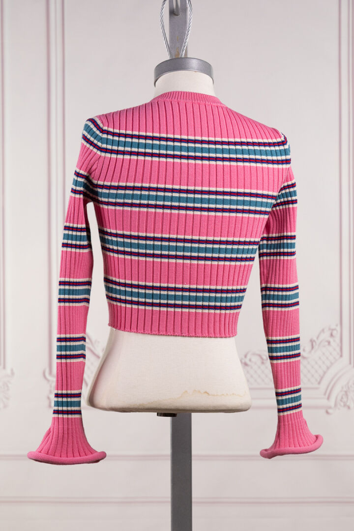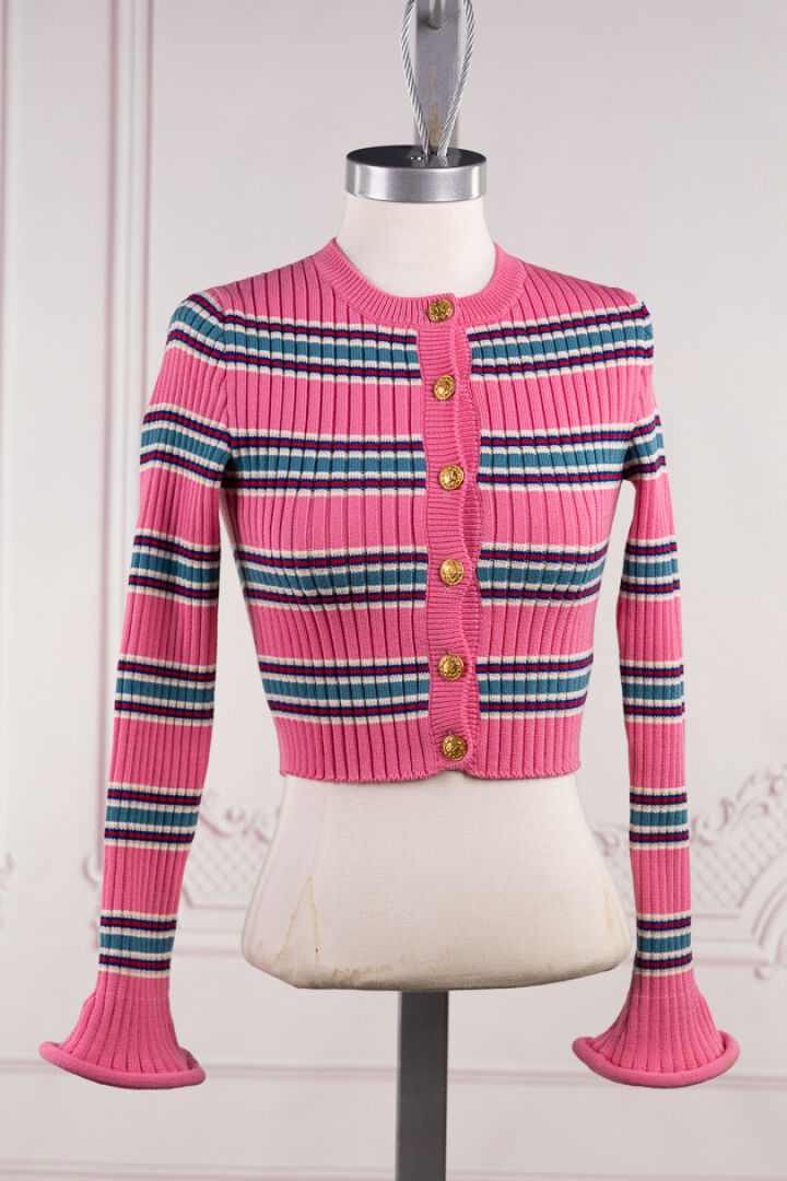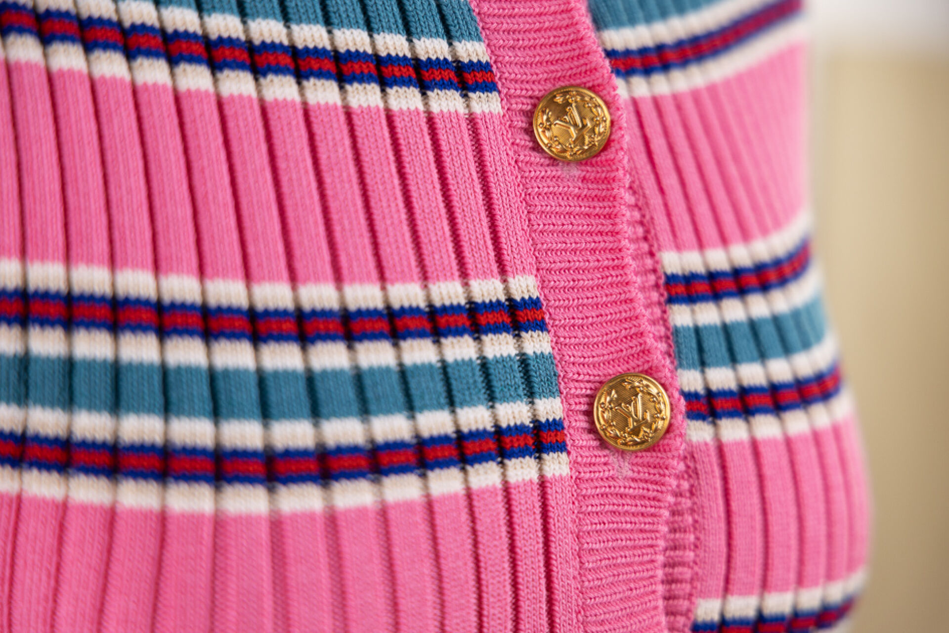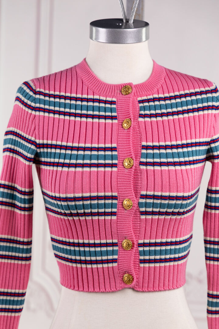 LOUIS VUITTON - Gilet court en maille côtelée rose à rayures vert, beige, bleu et rouge, encolure ronde, simple boutonnage, manches longues à finition évasée. Taille XS Très bon état