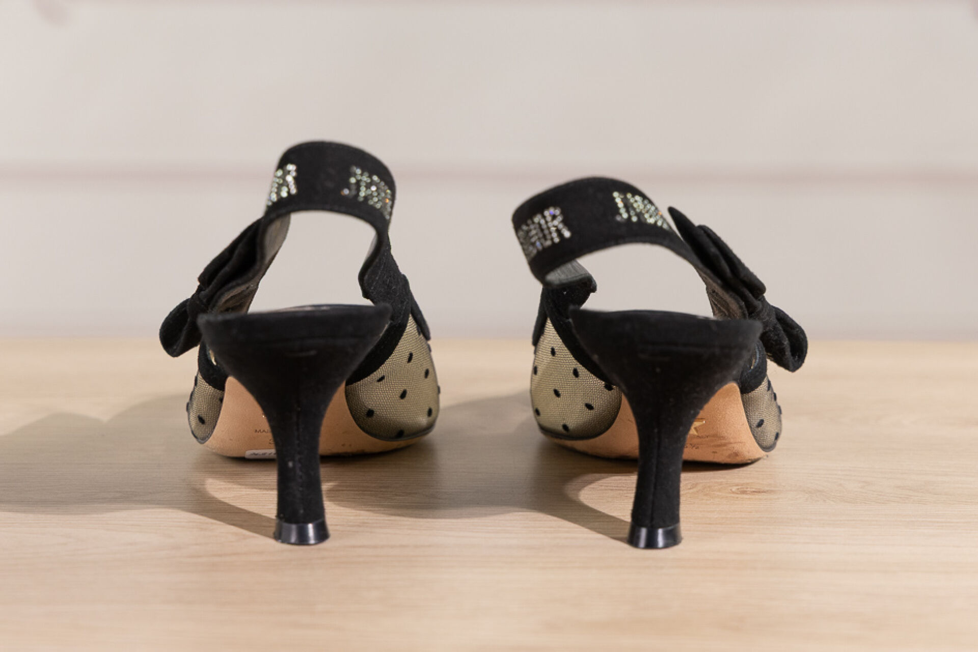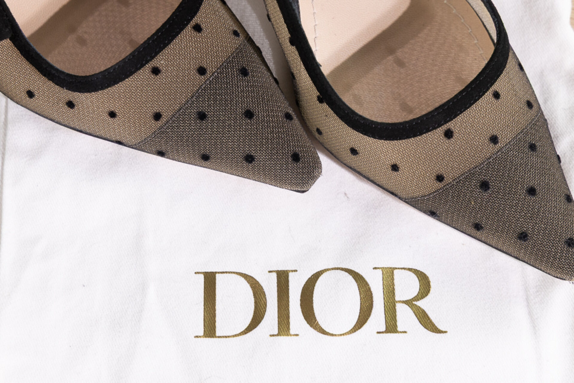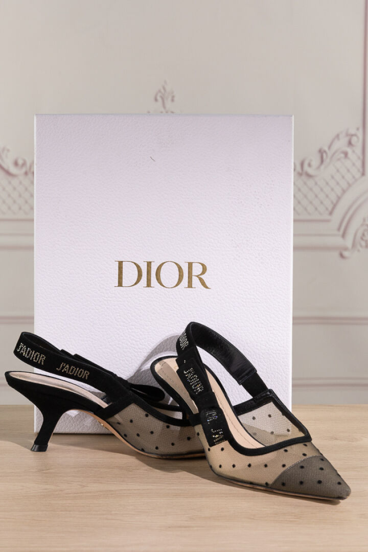 DIOR - Paire d'escarpins ouvert au talon, résille noire à pois en velours. Dans leur boite. Pointure 36,5 - Haut. Du talon : 6 cm Déjà portés, bon état général