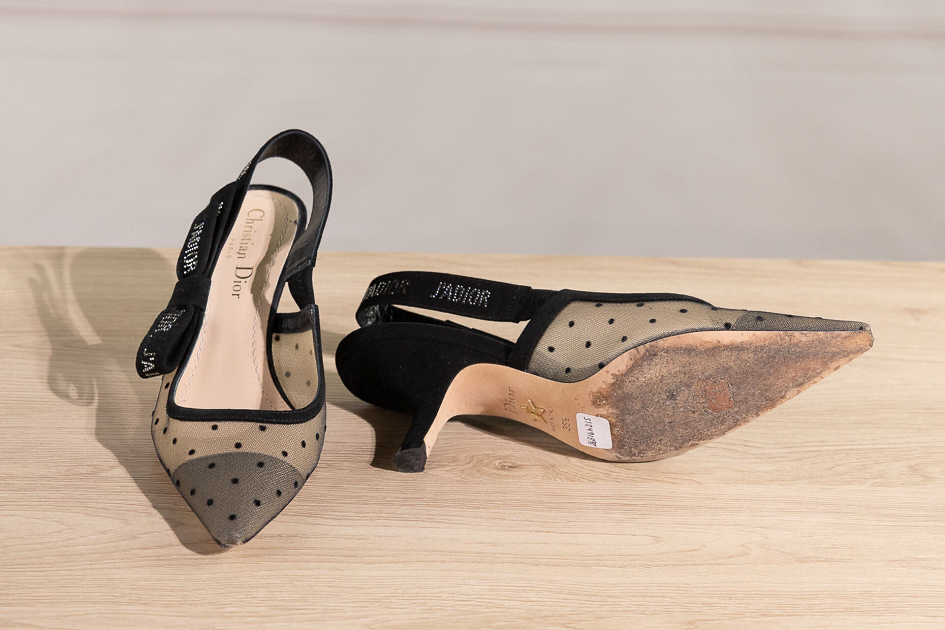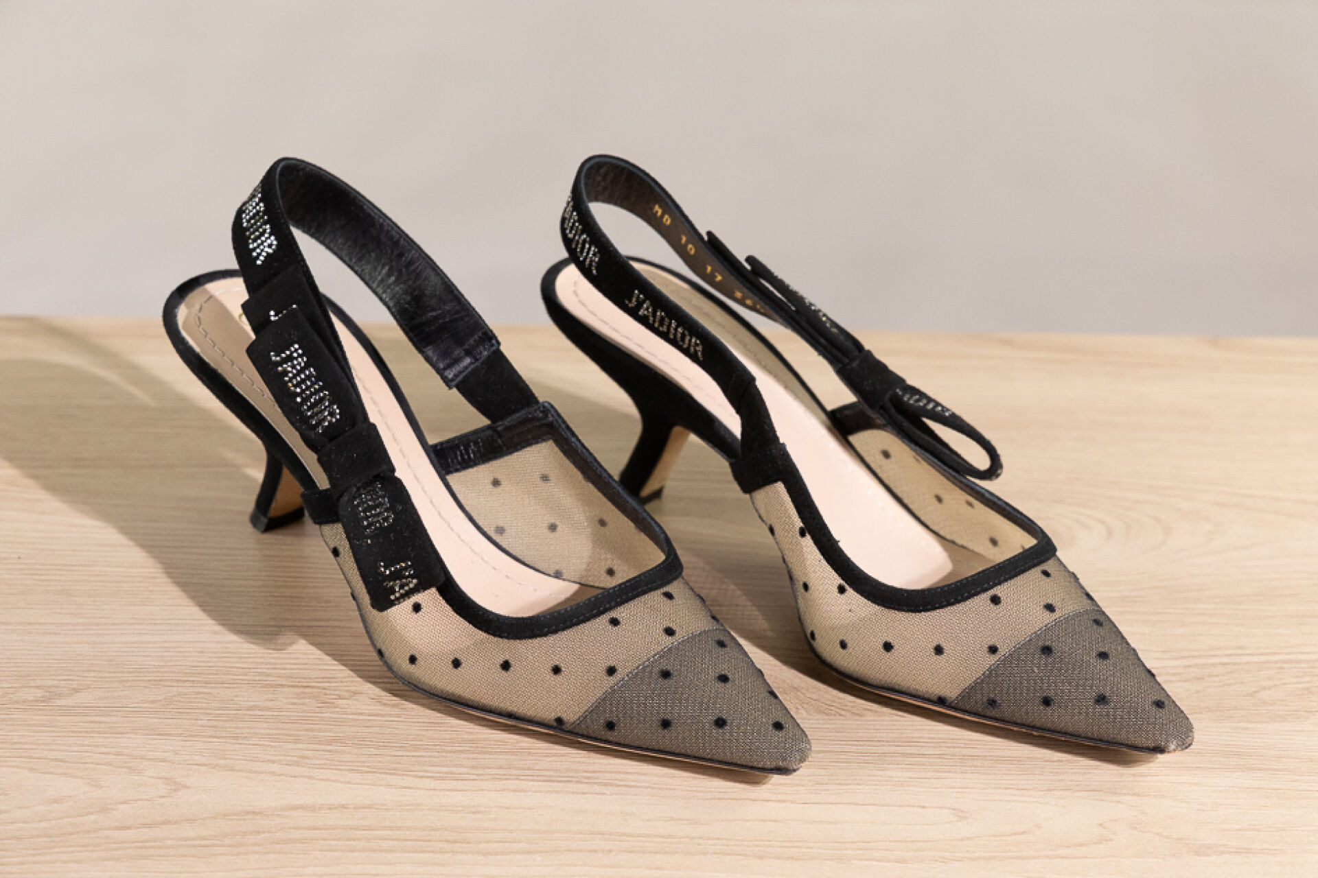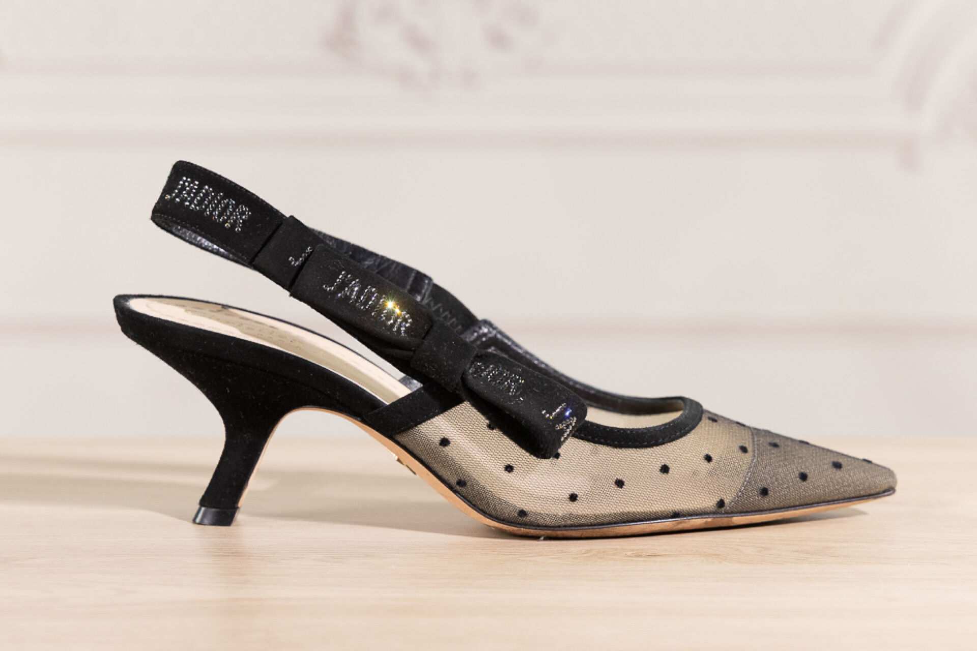DIOR - Paire d'escarpins ouvert au talon, résille noire à pois en velours. Dans leur boite. Pointure 36,5 - Haut. Du talon : 6 cm Déjà portés, bon état général