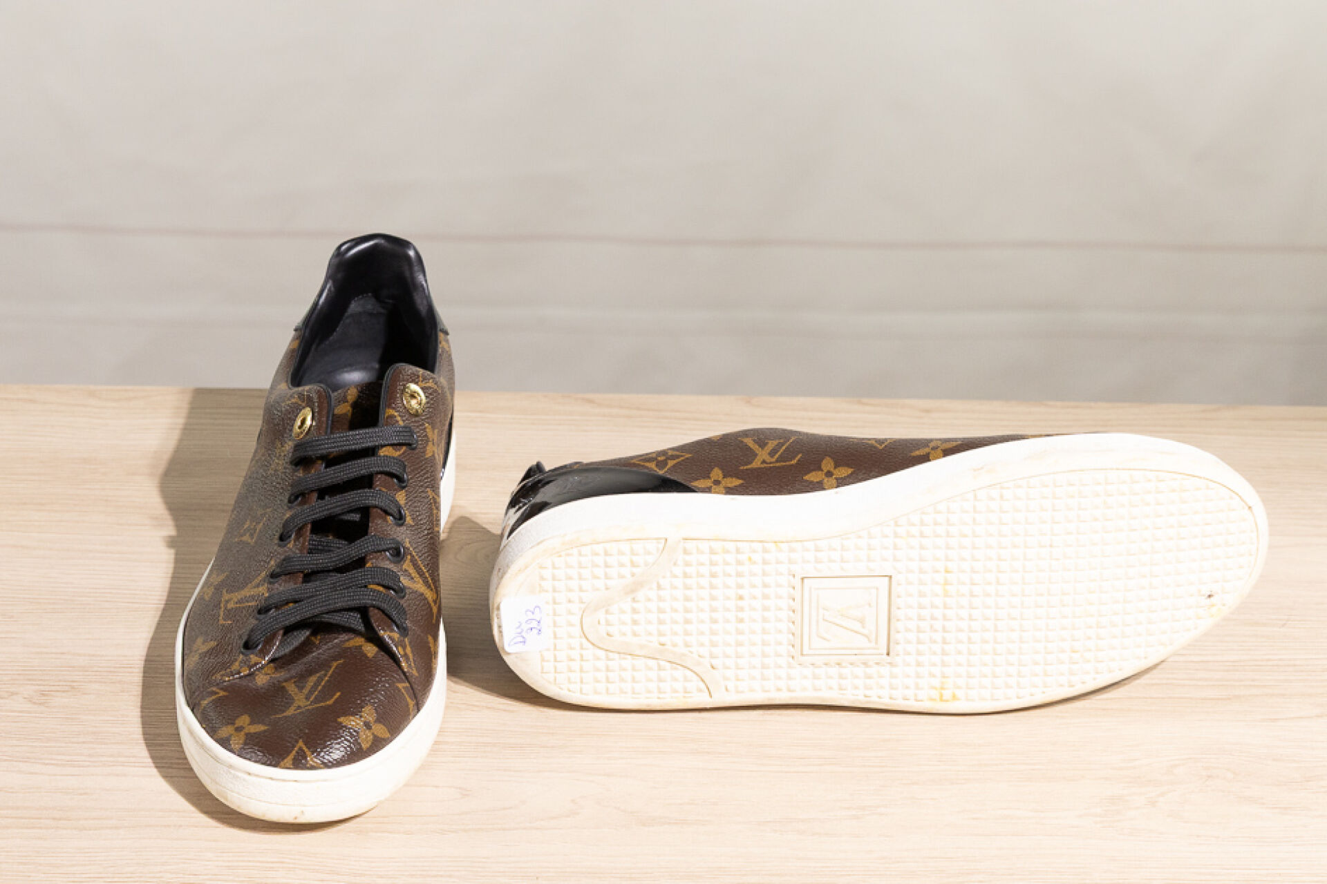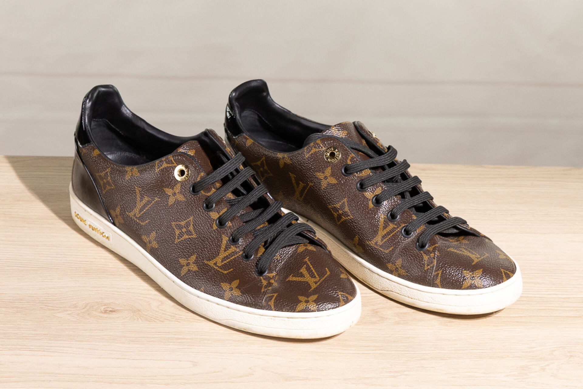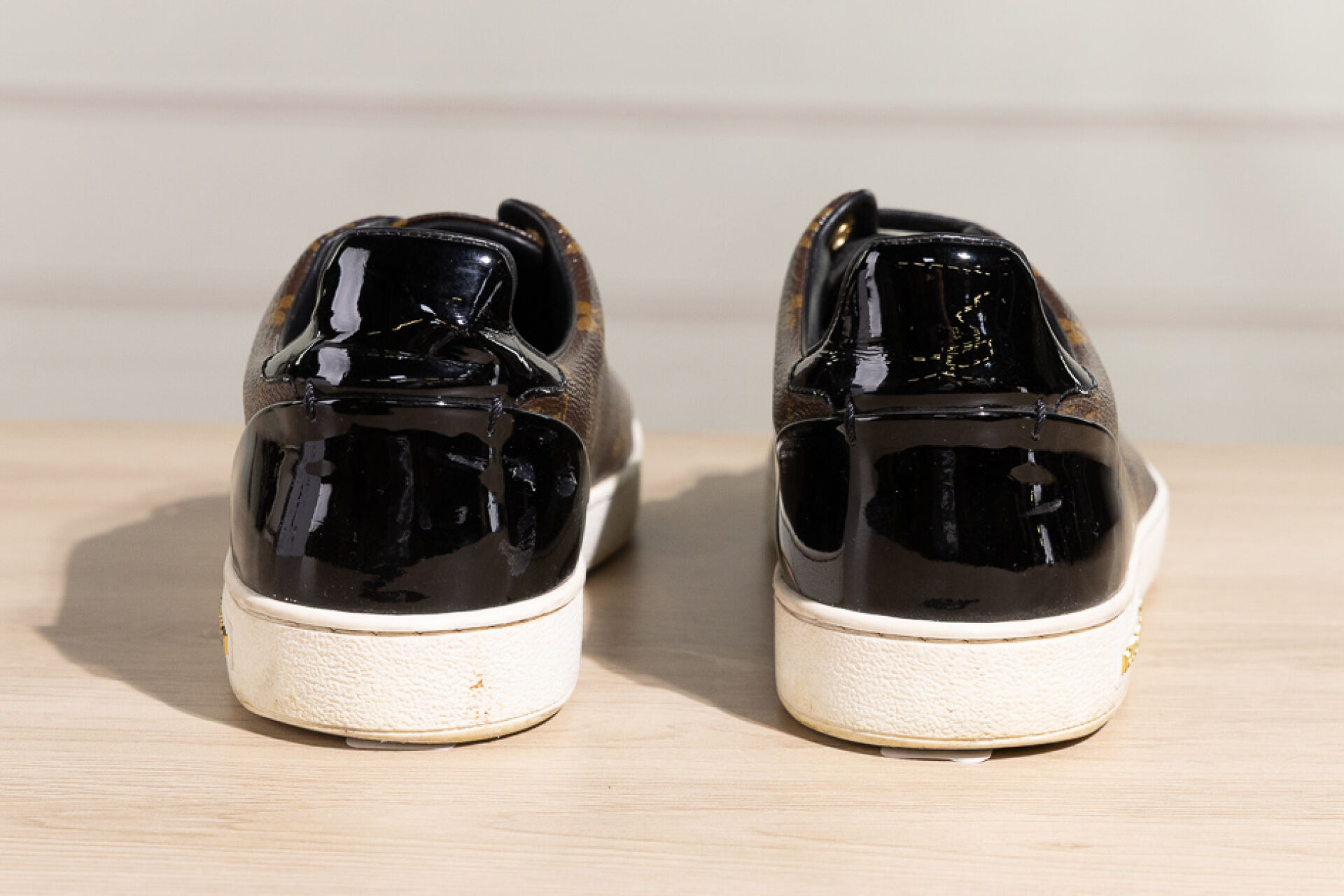 LOUIS VUITTON - Paire de sneakers basses en toile Monogram et cuir vernis au dos, à lacets. Pointure 40 Déjà portées
