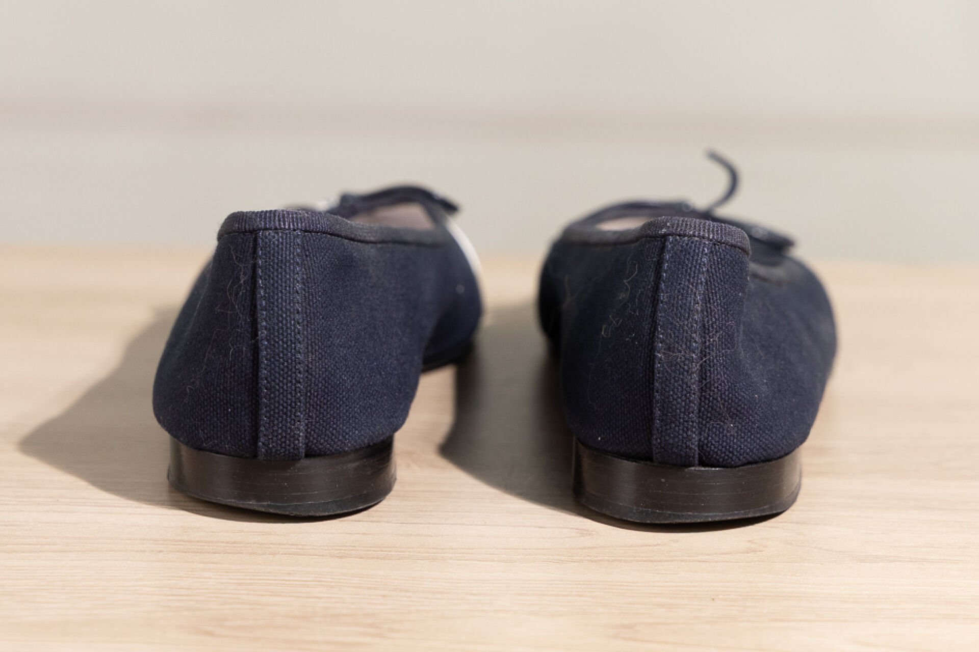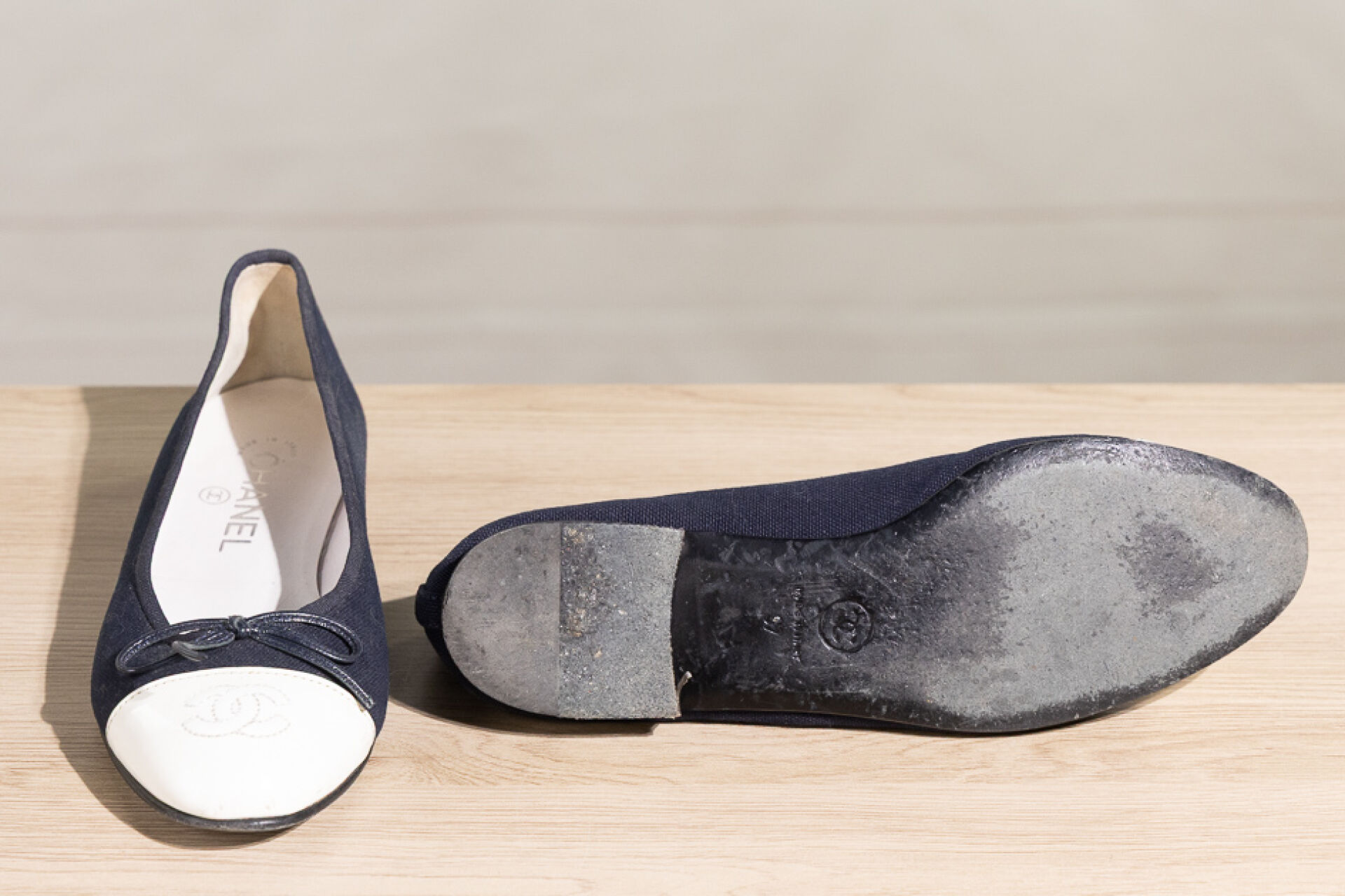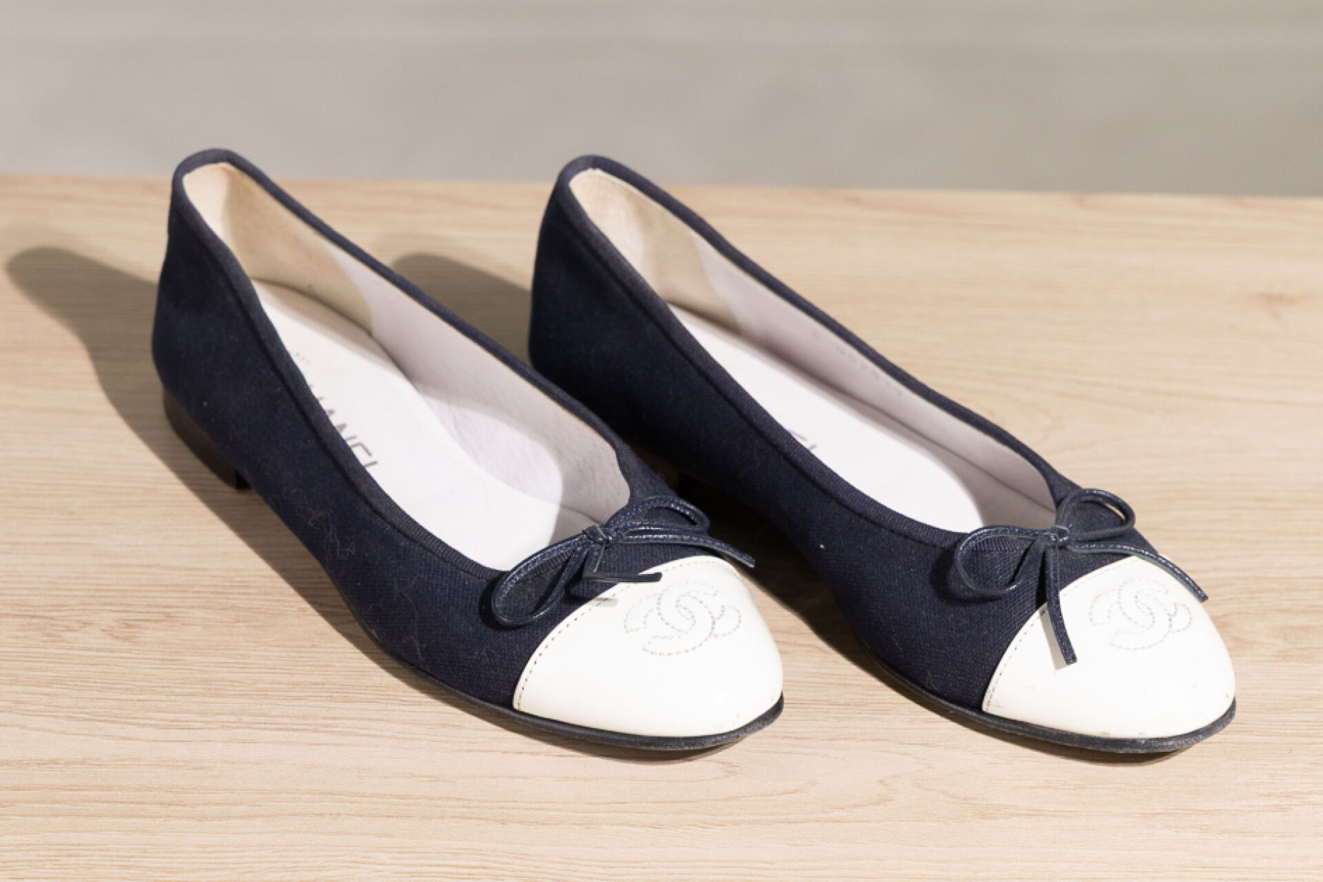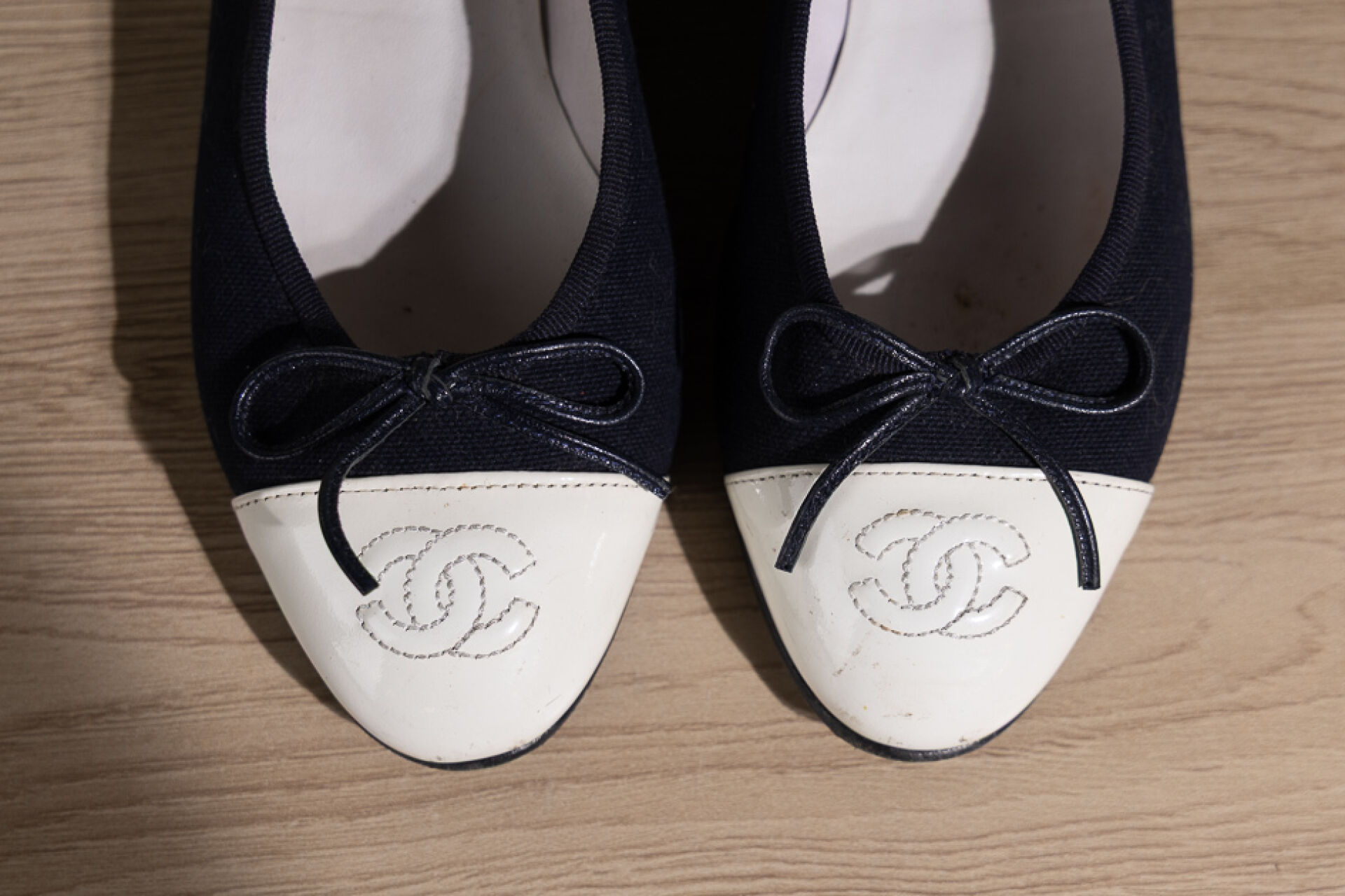 CHANEL - Paire de ballerines en coton marine et bout vernis blanc surpiqué du sigle. Pointure 37 Déjà portées, légères traces
