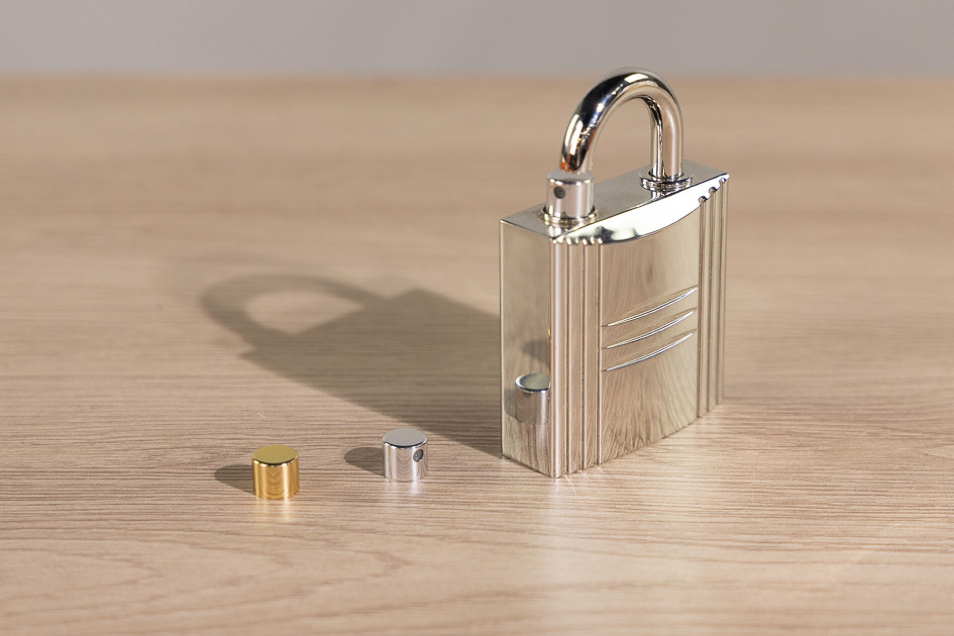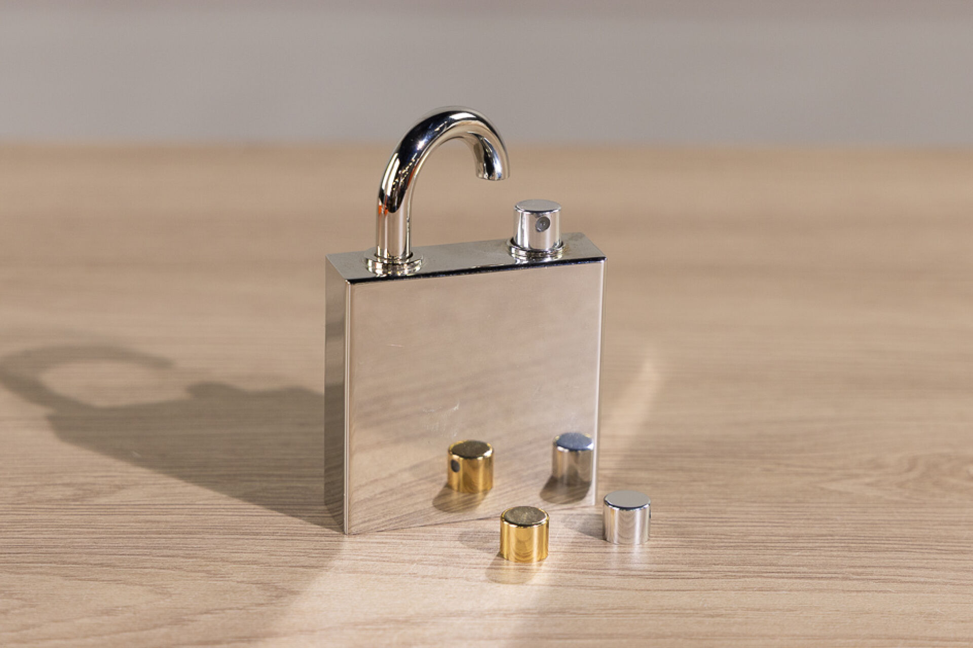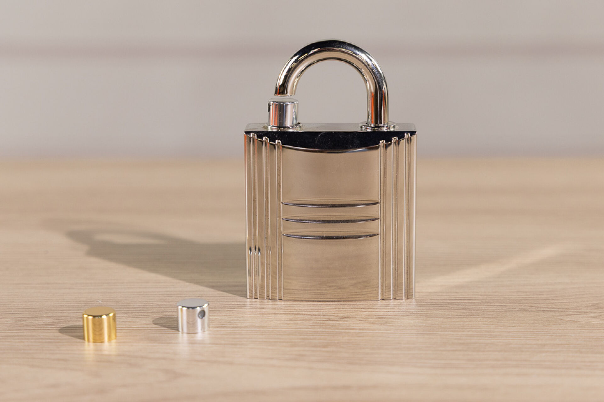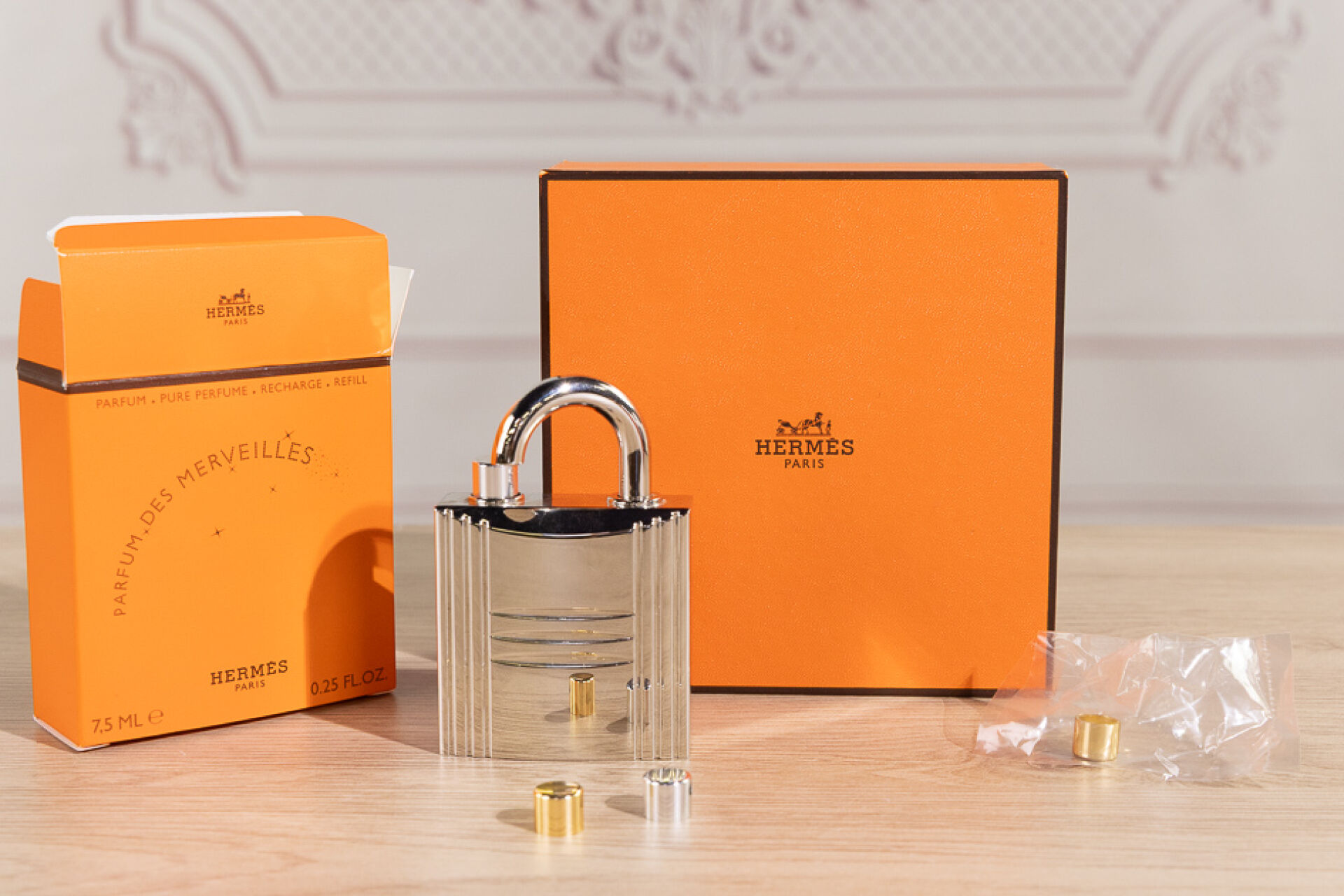 HERMES Paris - Flacon cadenas argenté, avec sa recharge de parfum entamée "Parfum des Merveilles" 7,5 ml.