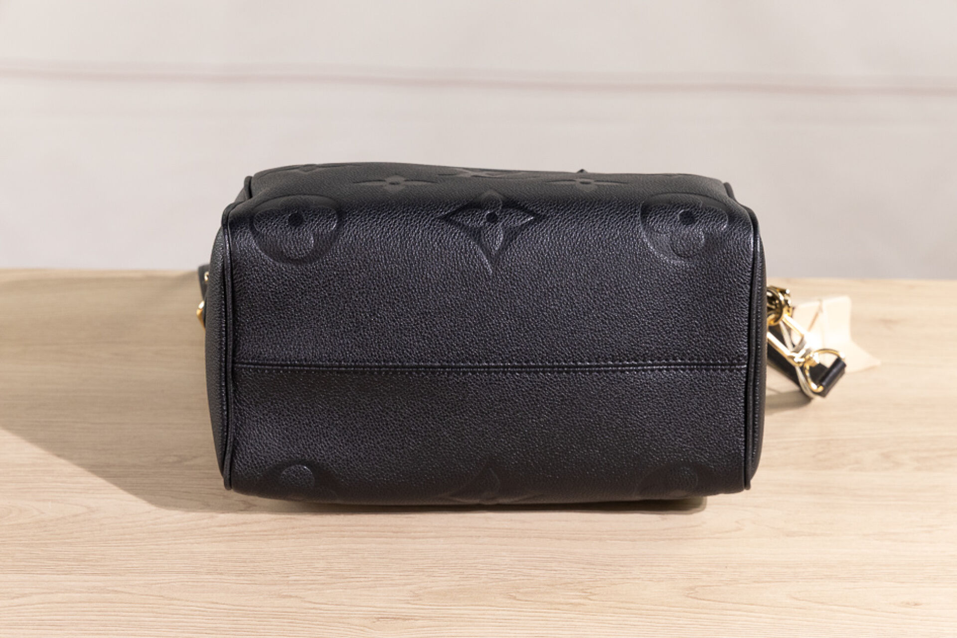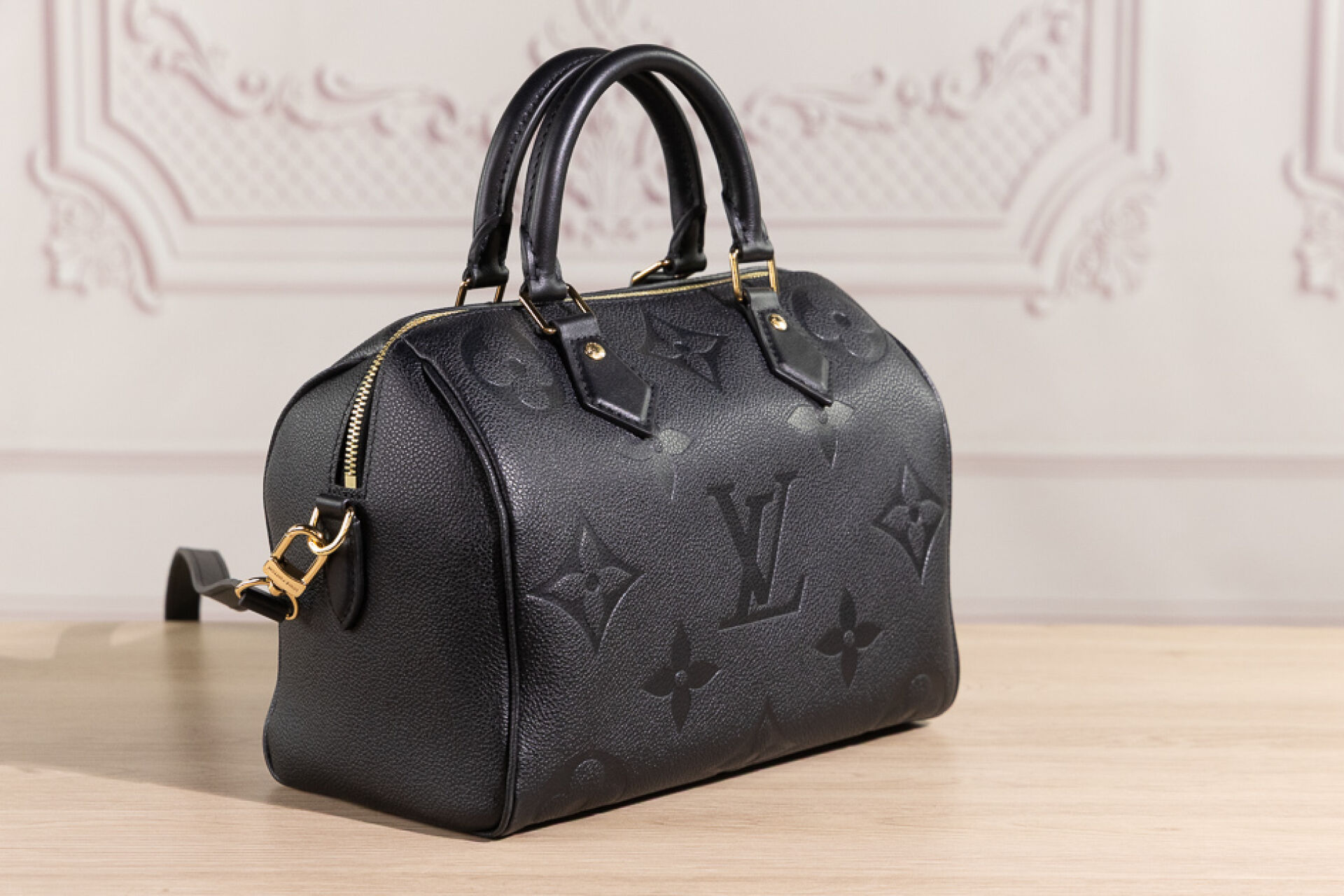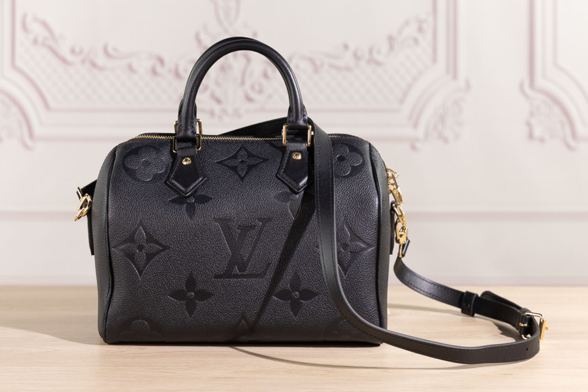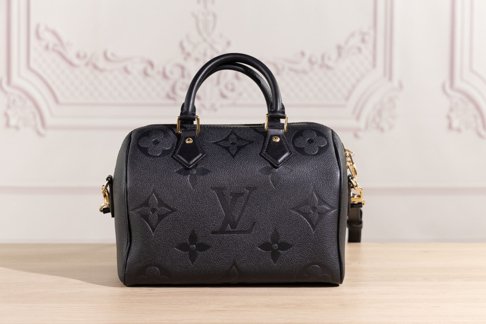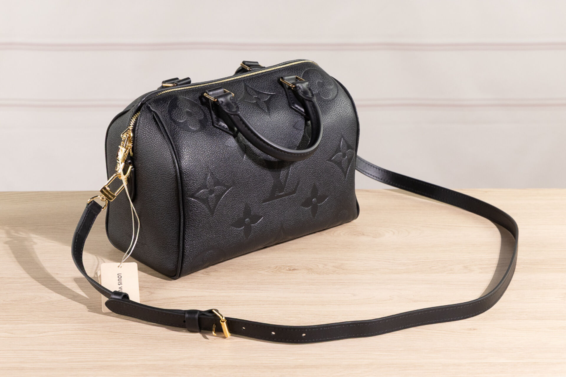 LOUIS VUITTON - Sac "Speedy 25" en cuir noir Monogram, deux anses à main en cuir, fermeture à glissière, accastillage métal doré, anse bandoulière à la couleur, clefs et cadenas. Haut. : 20 cm - Long. : 25 cm Très bon état