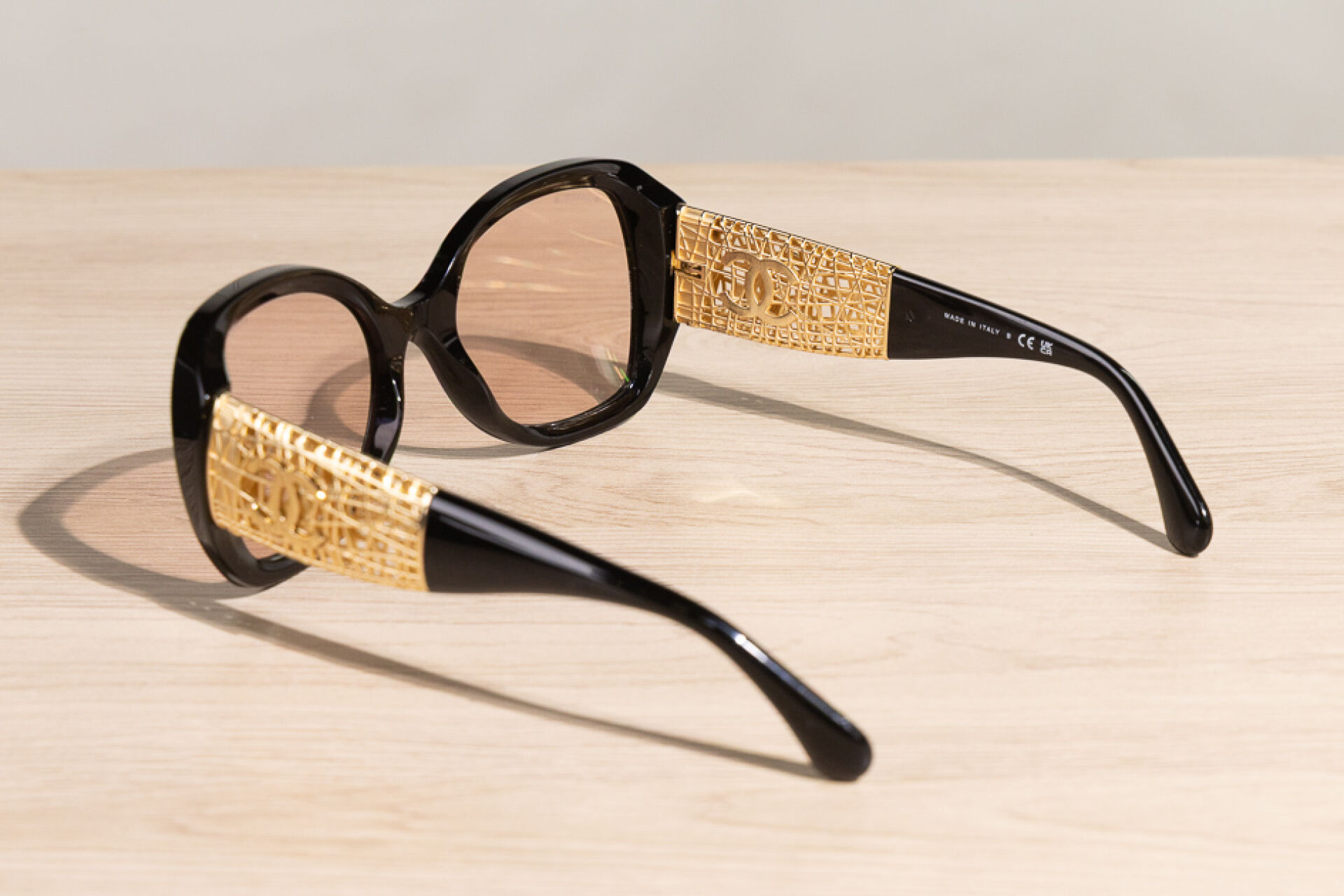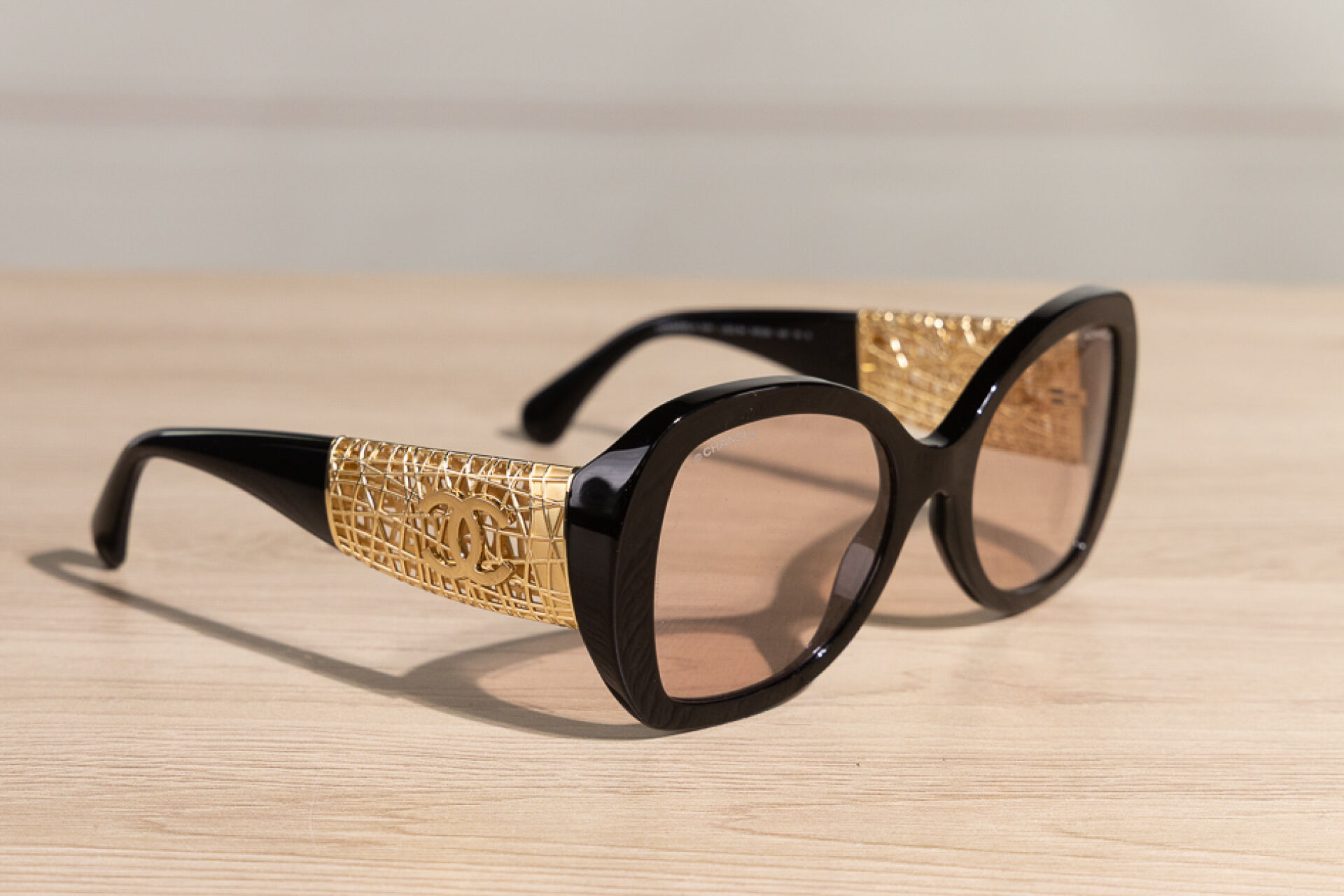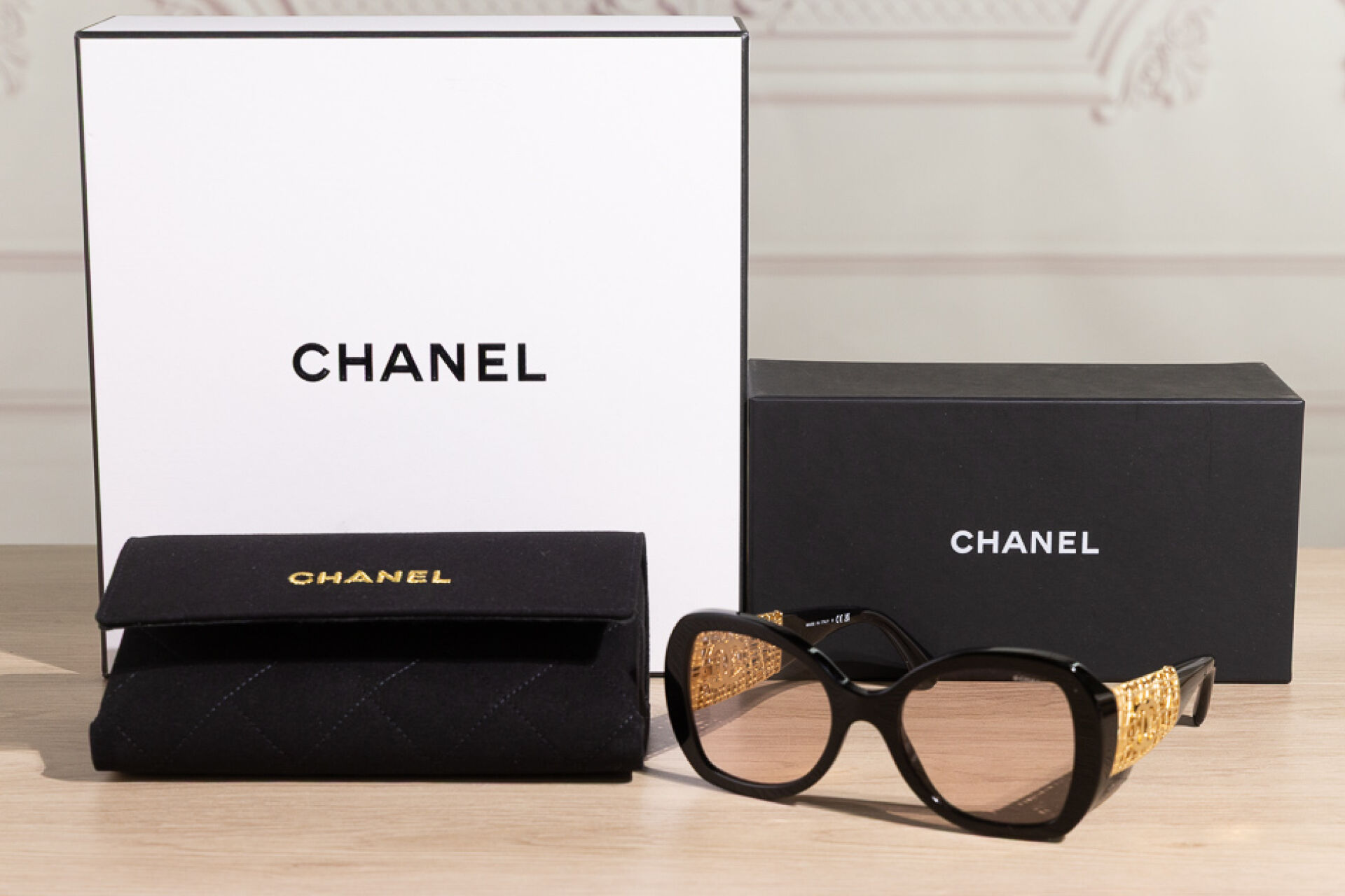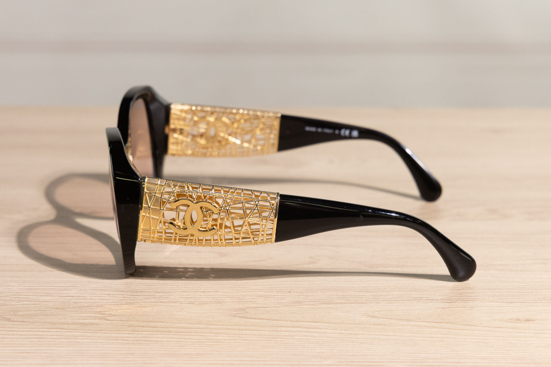 CHANEL - Paire de solaires en acétate noir à verres très légèrement teinté, branches en métal doré grillagé, ajouré et doré. Dans leur étui, boite et boite cadeau. État neuf, non porté