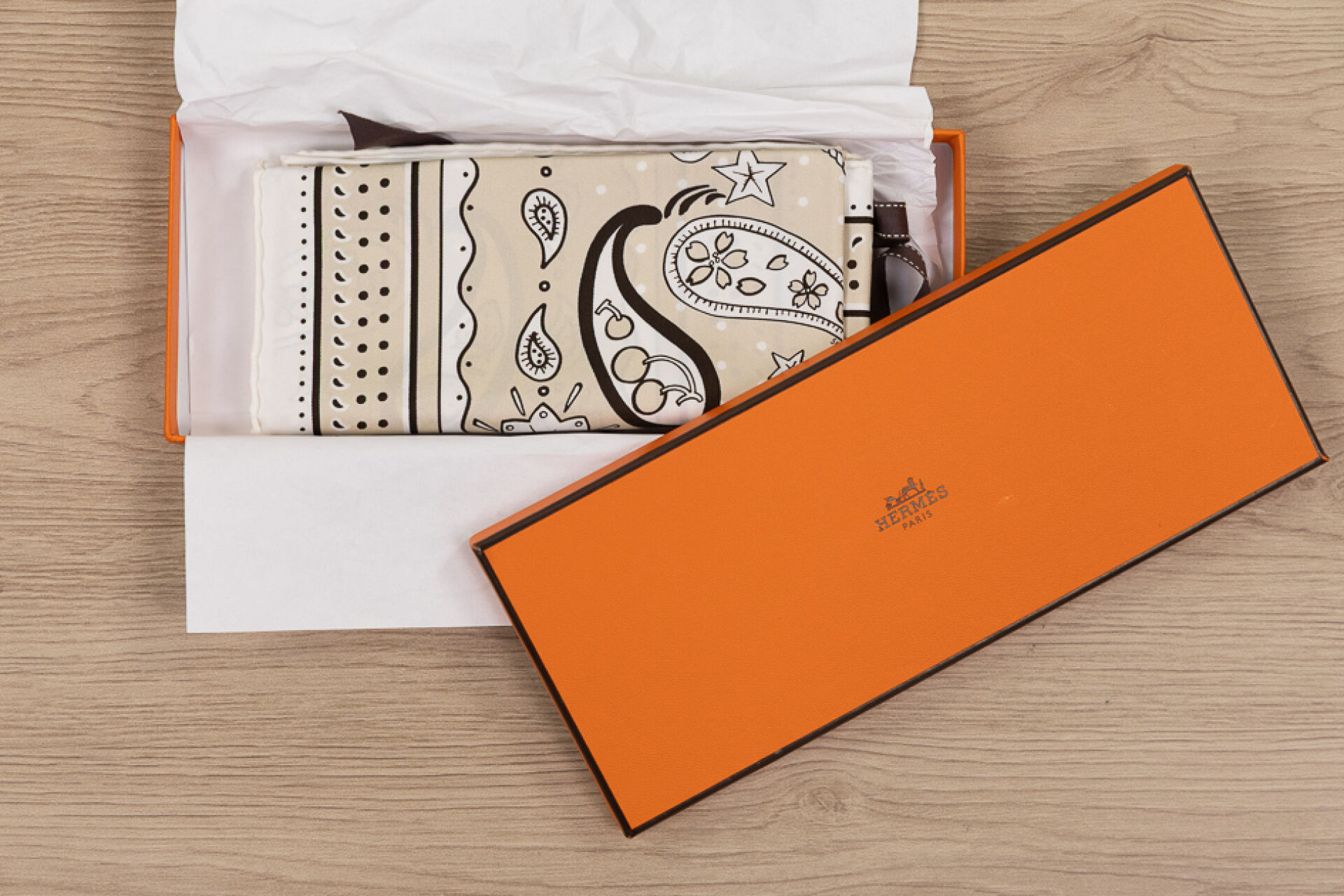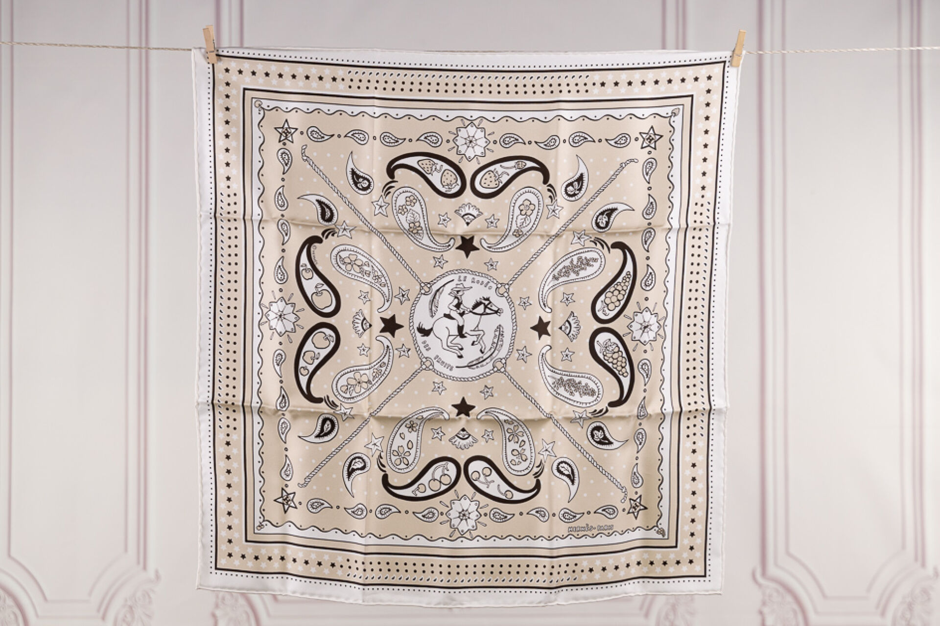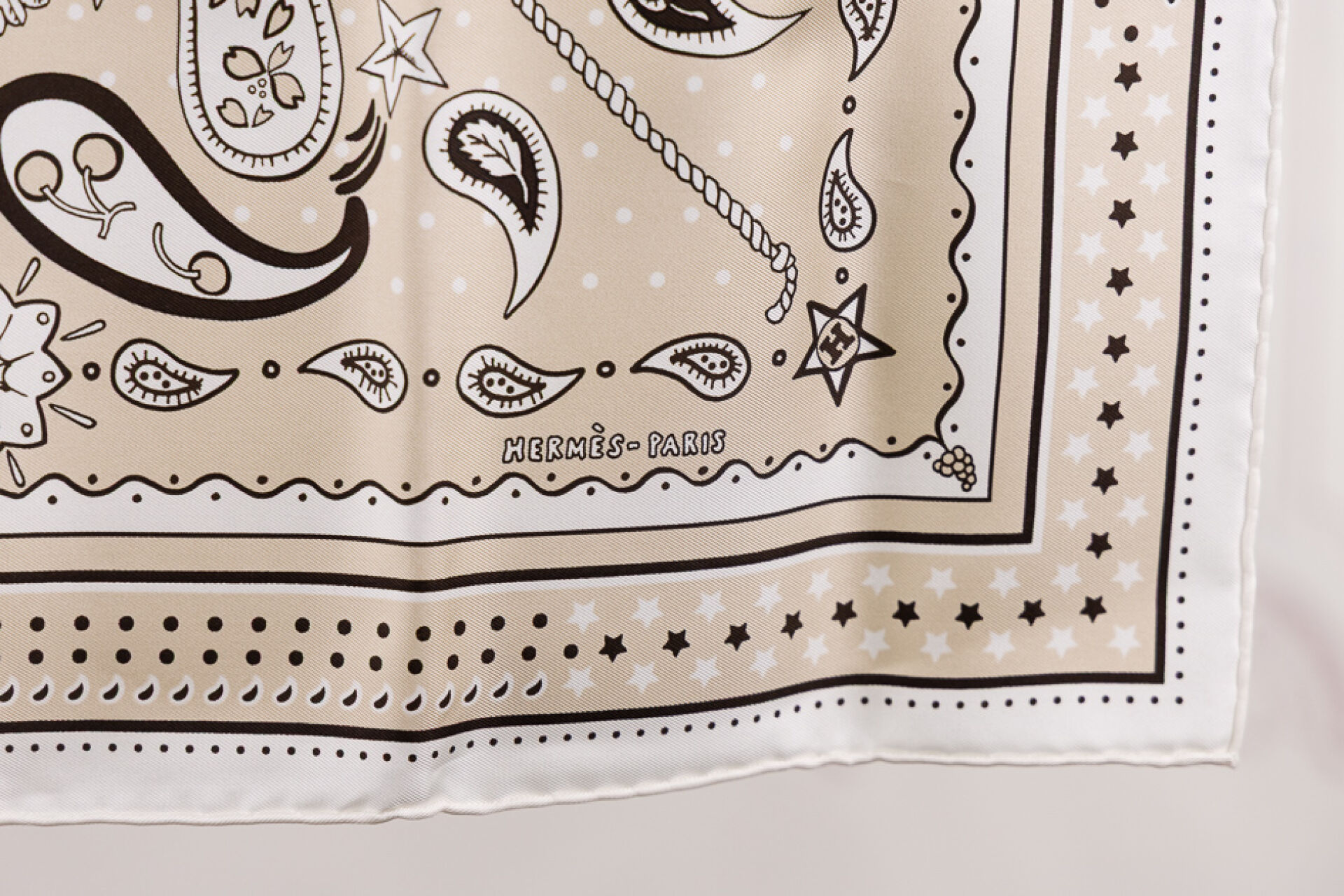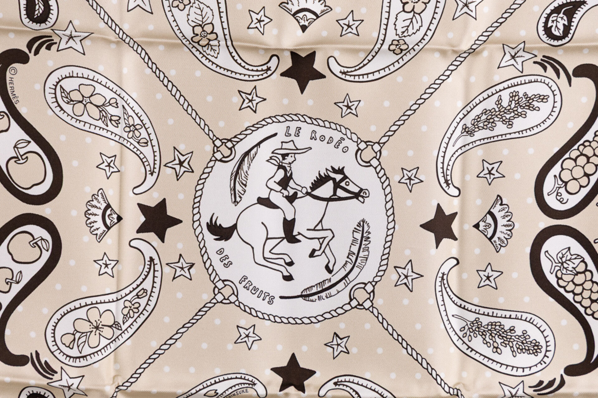 HERMES Paris- Petit carré en twill de soie imprimé titré "Le rodéo des fruits", beige, noir, blanc. Boite. 55 x 55 cm Non porté