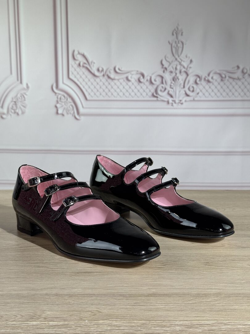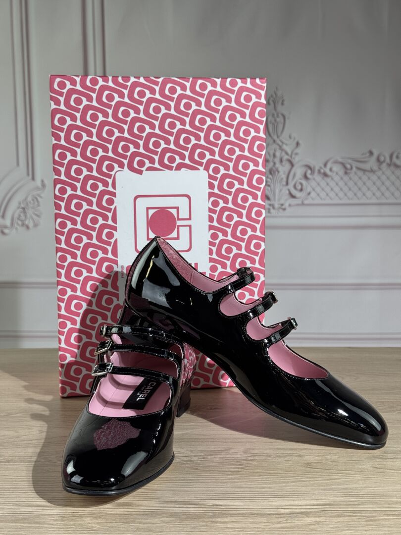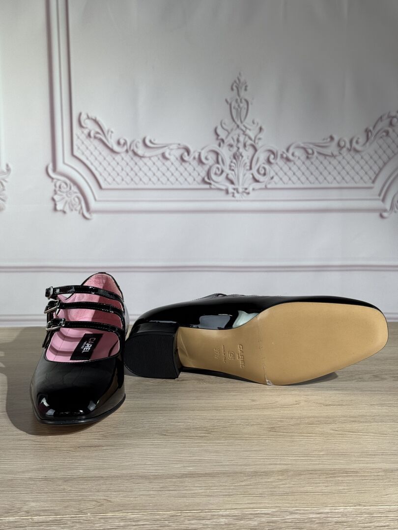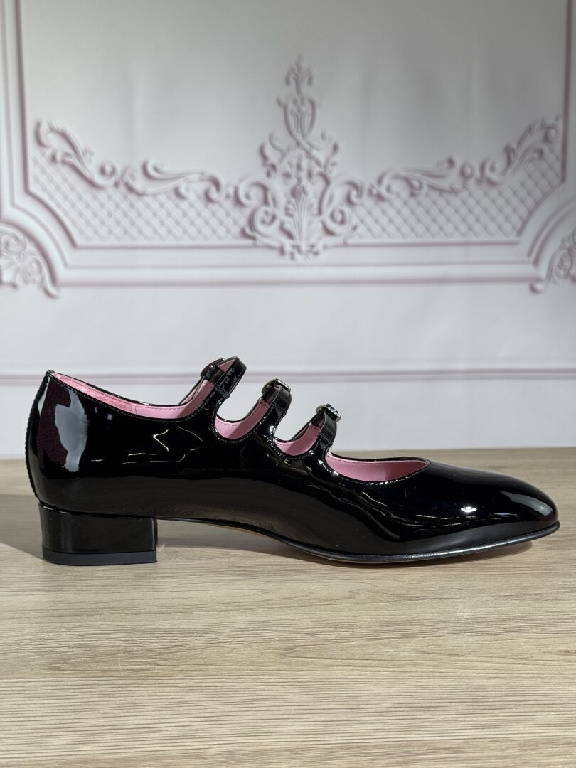 CAREL - Paire de souliers, modèle "Ariana", cuir agneau noir vernis, trois brides, petits talons. Pointure 37,5 - Haut du talon : 2,5 cm Etat neuf