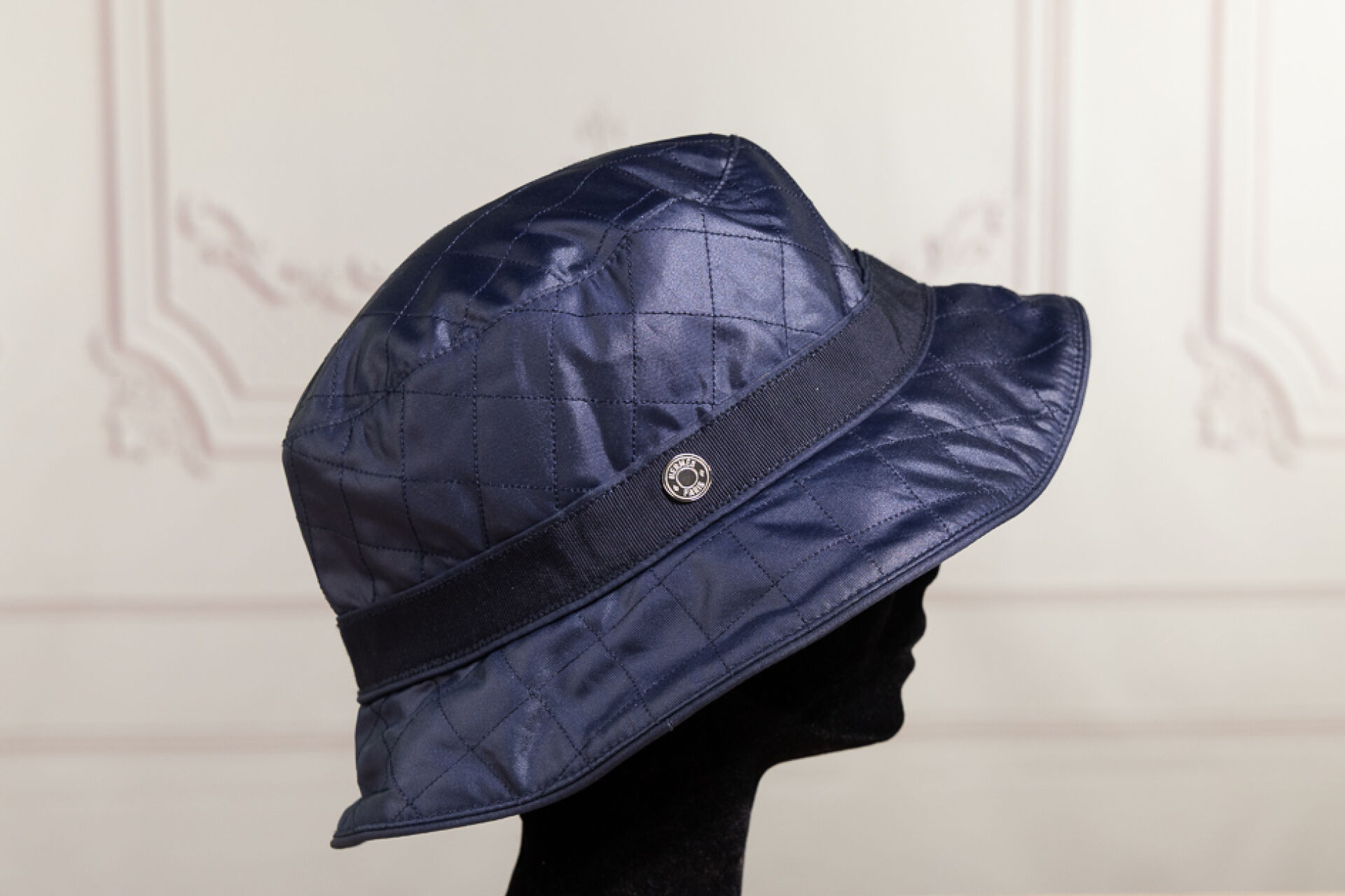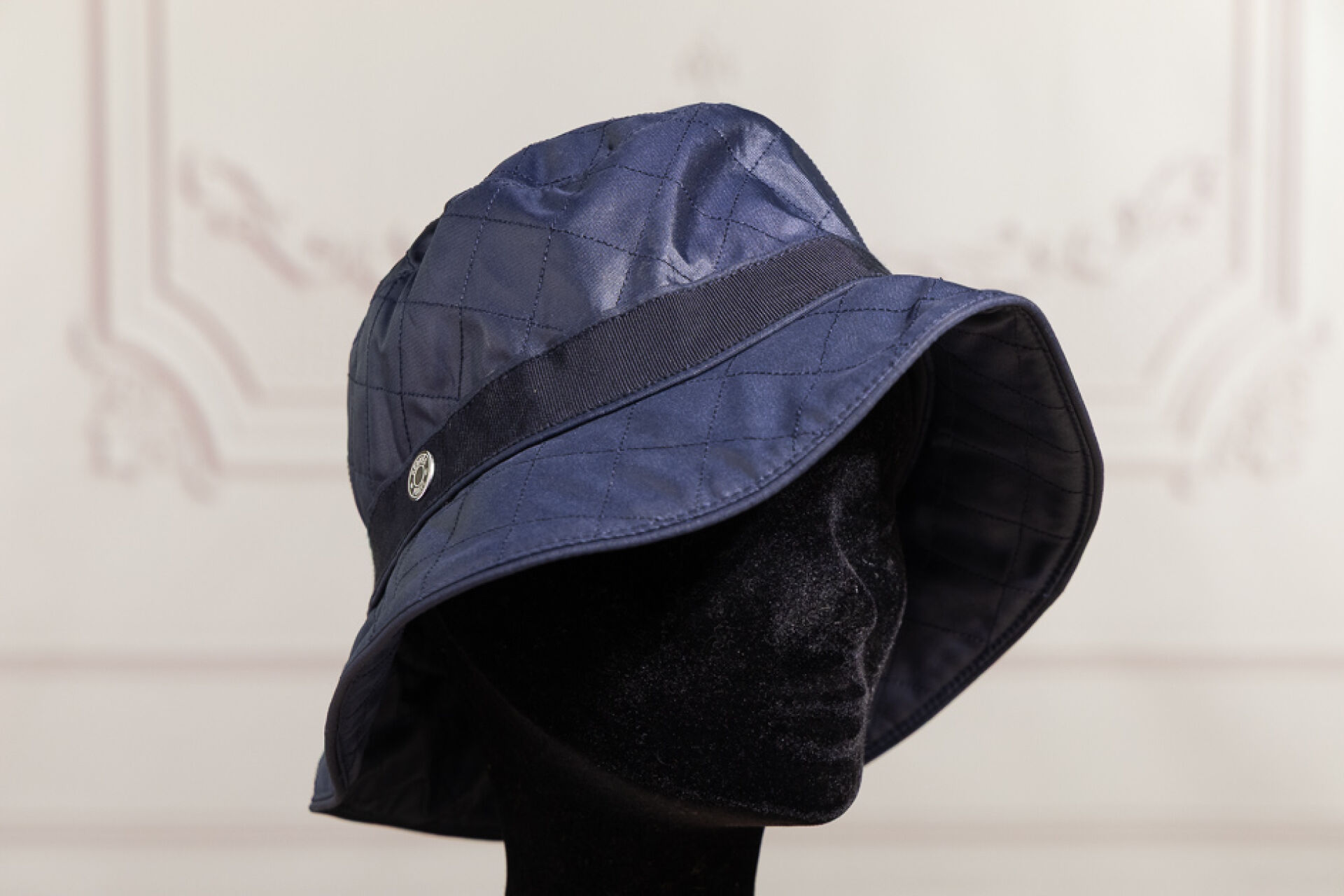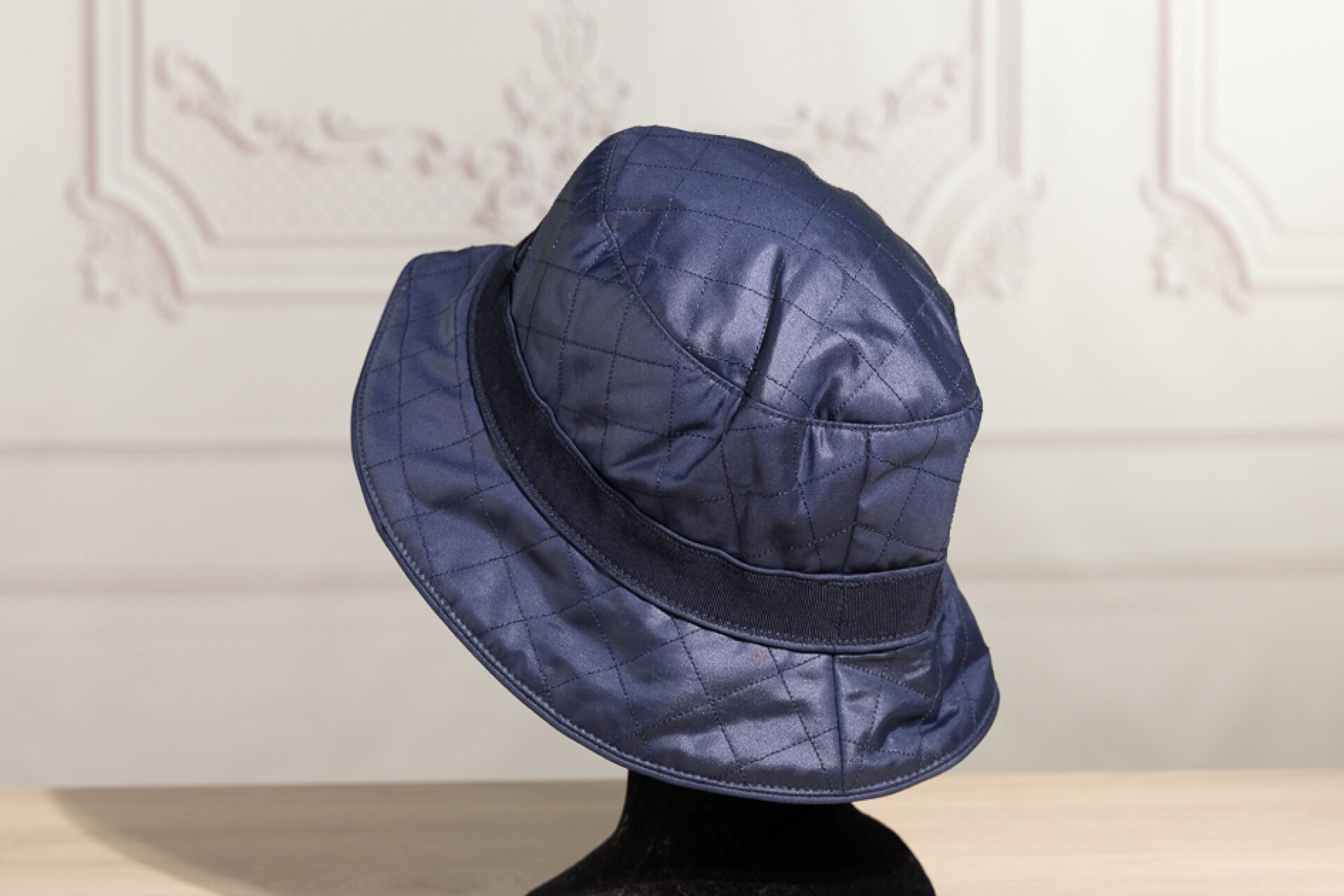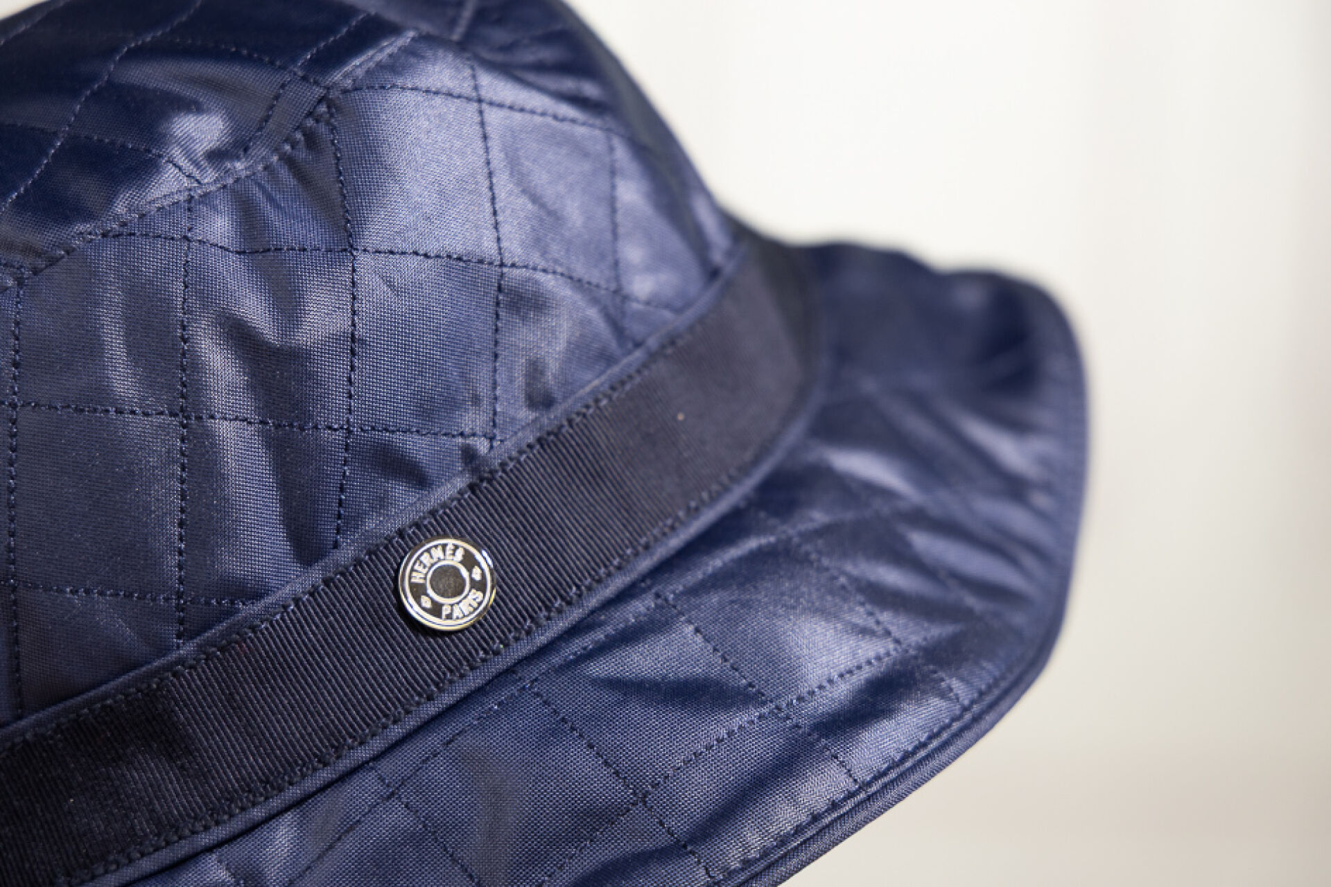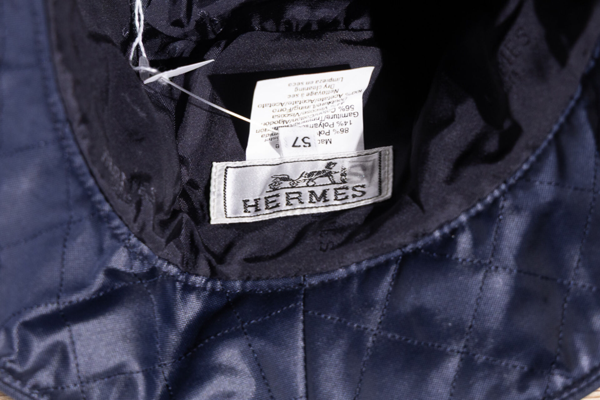 HERMES - Bob en nylon effet matelassé marine, galon en gros grain à la couleur, clou argenté. Tour de tête 57 Très bon état général, toutes petites traces