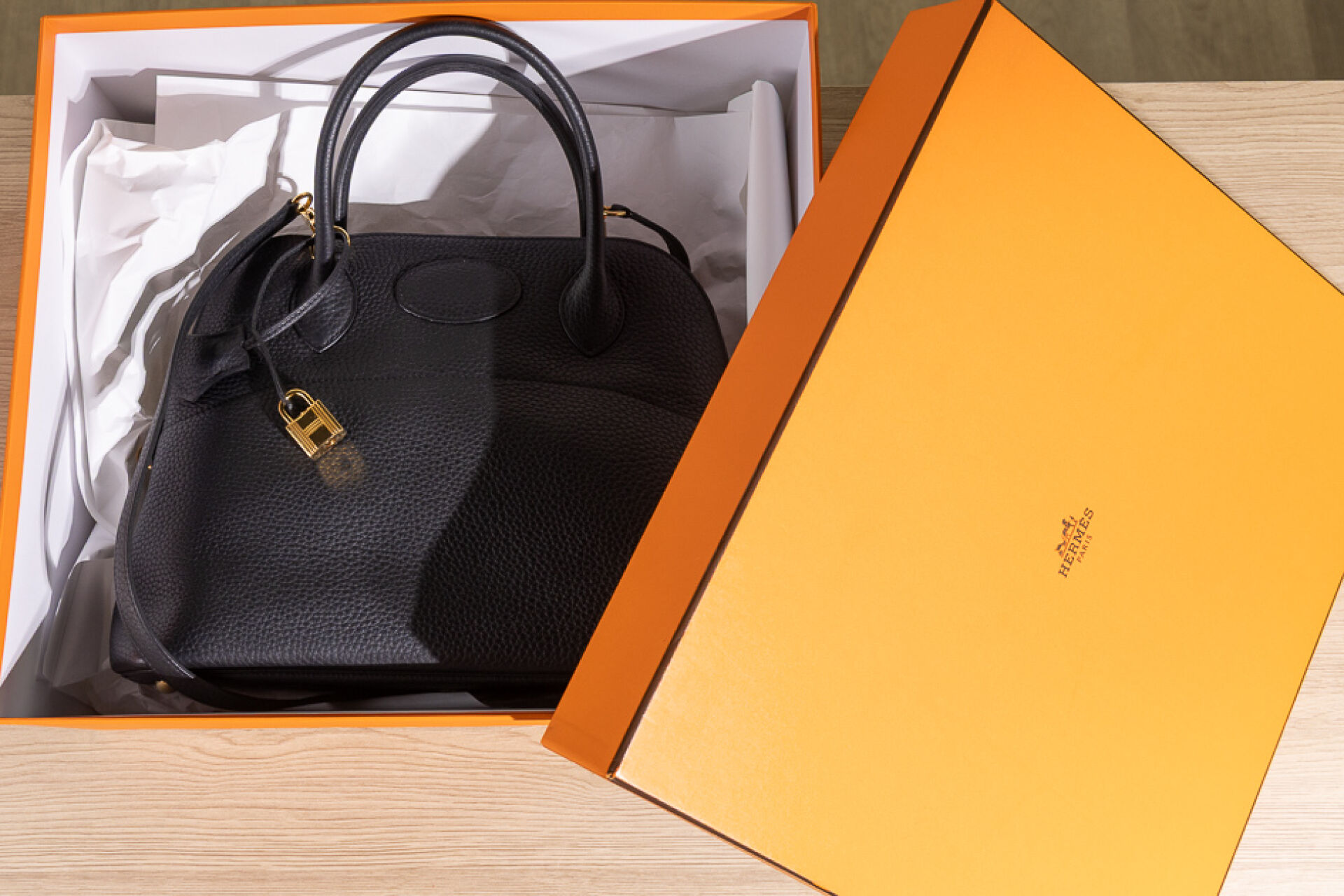 HERMES Paris - Sac "Bolide" PM, veau Epsom noir, fermeture à glissière, bijouterie en métal doré, double poignée, clefs, cadenas, clochette, anse bandoulière amovible. Dans sa boite. Haut. : 22 cm - Long. : 30 cm Très bon état général cependant deux traces de doré dû aux anneaux d'attache de la bandoulière