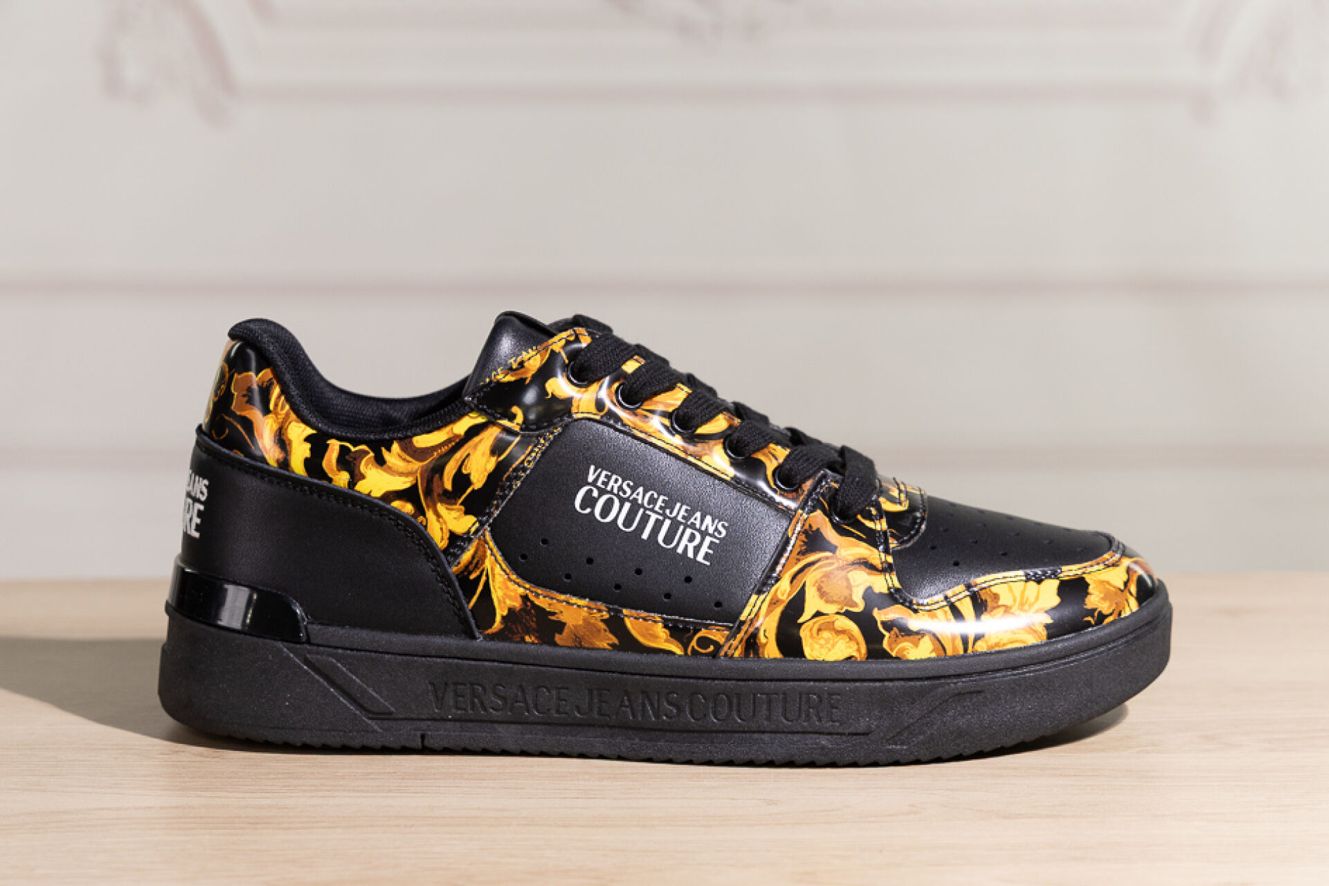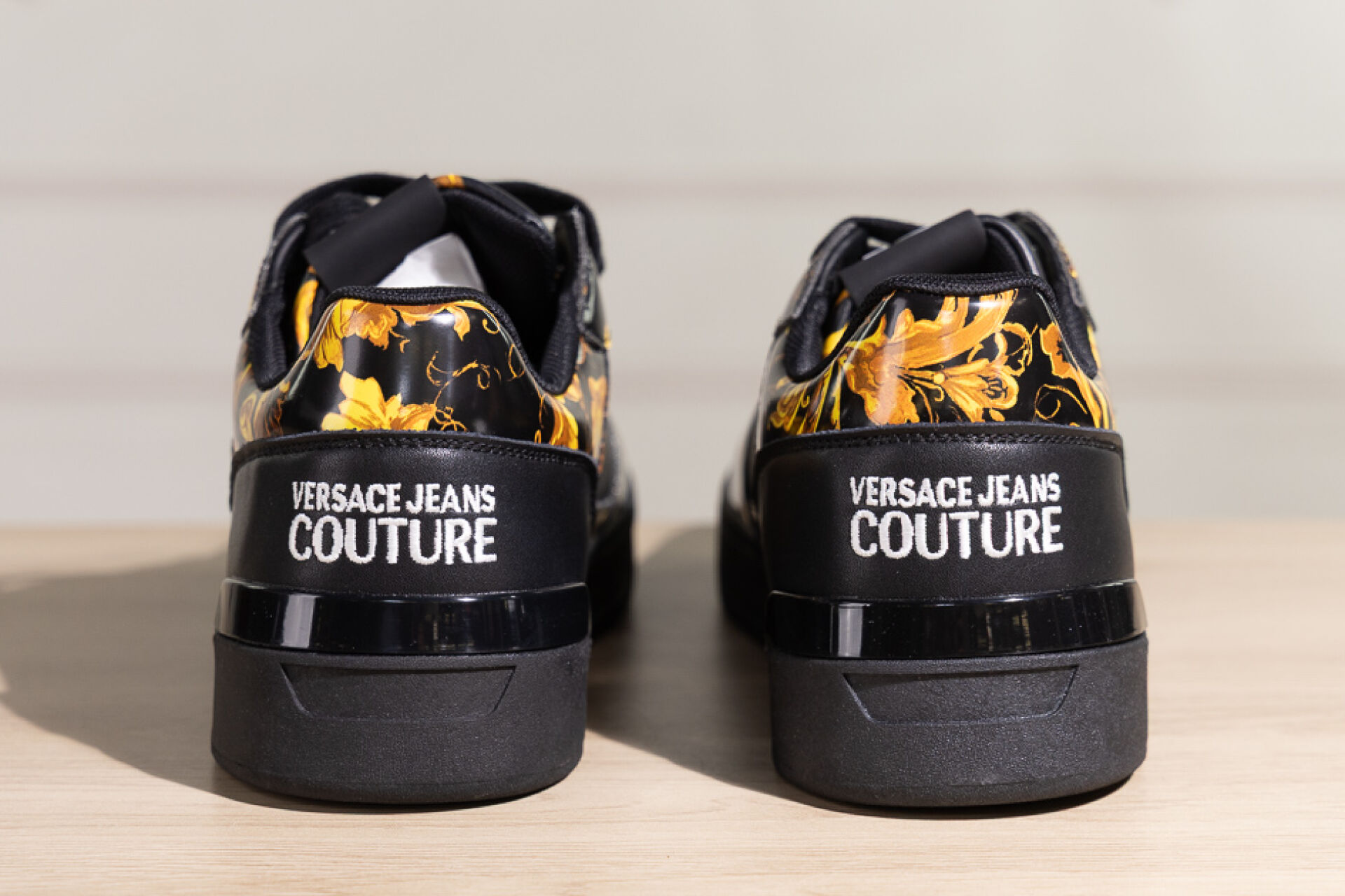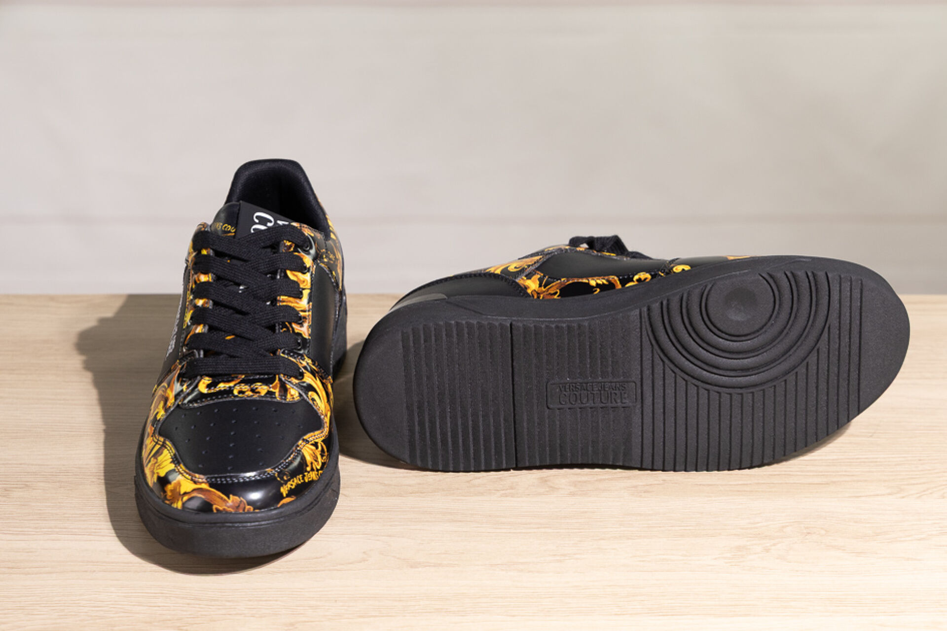 VERSACE JEANS COUTURE - Paire de baskets en cuir noir perforé et motifs baroque dorés, lacets. Housse et boite. Pointure 42 Non portées