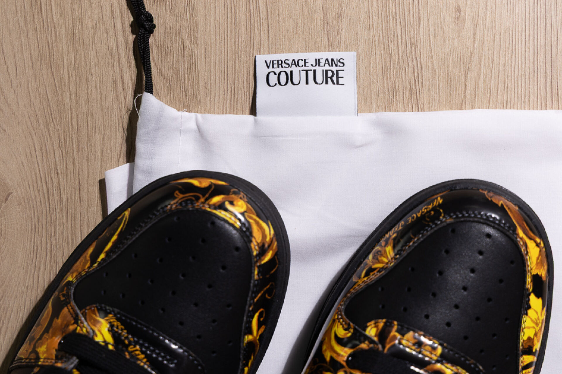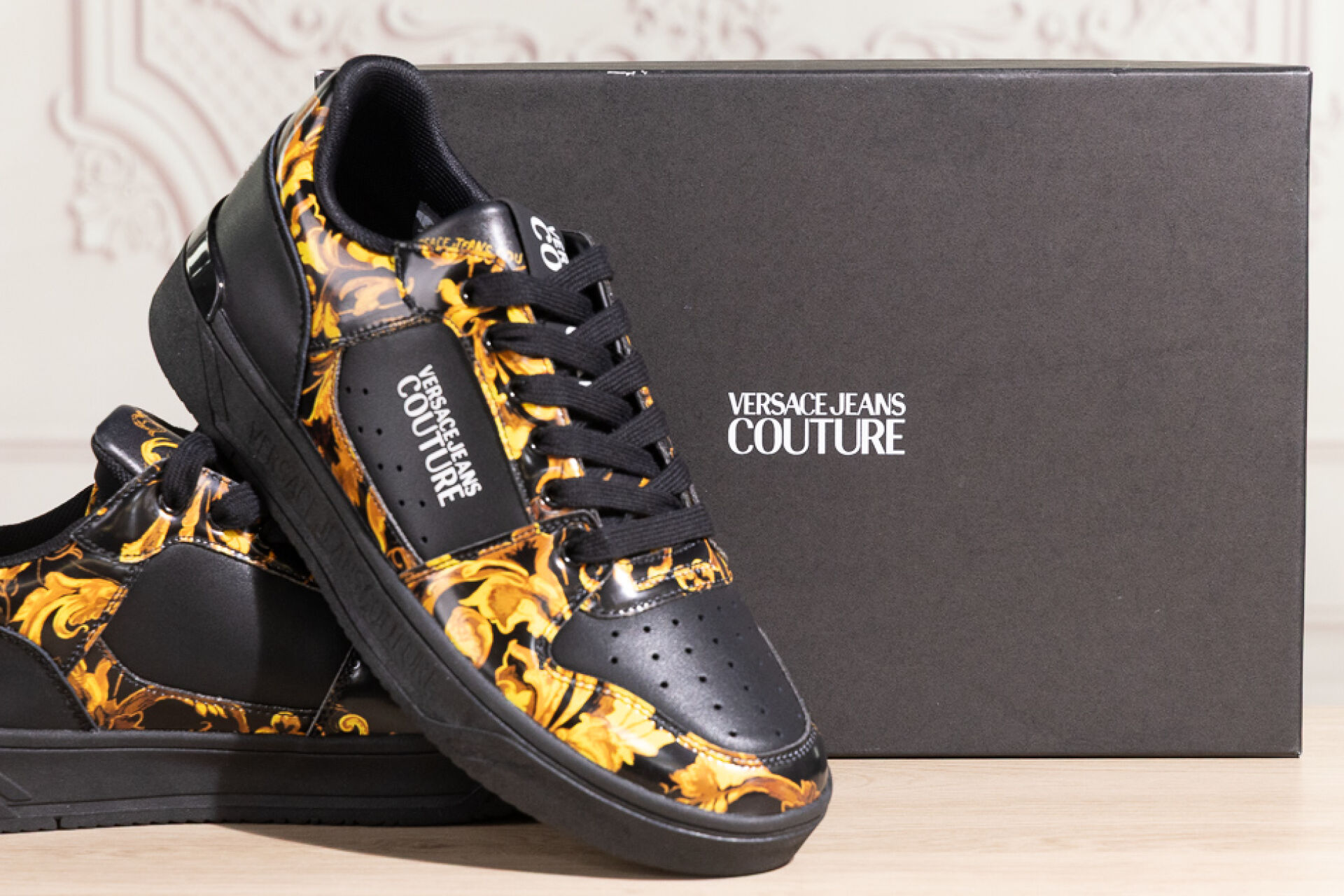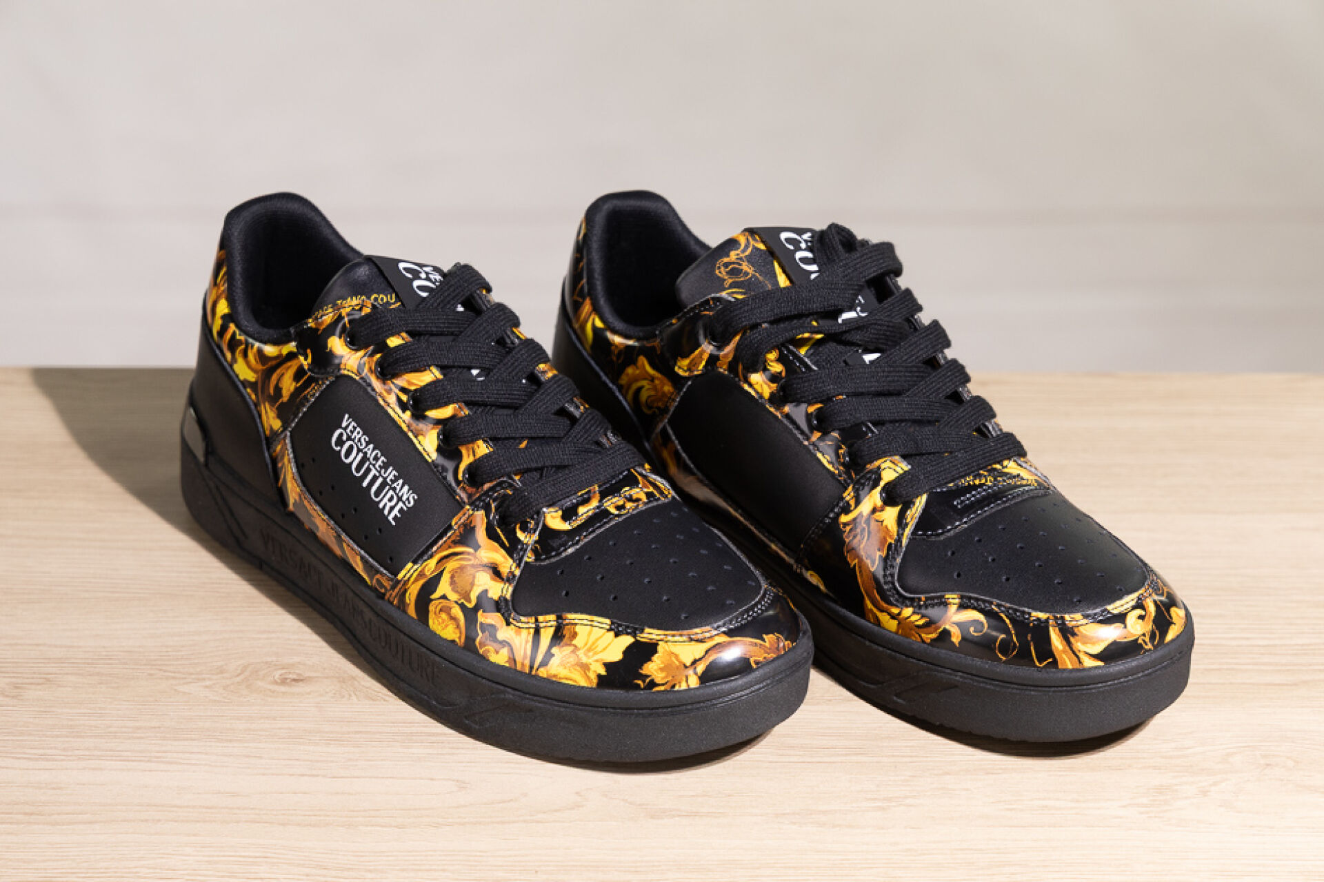 VERSACE JEANS COUTURE - Paire de baskets en cuir noir perforé et motifs baroque dorés, lacets. Housse et boite. Pointure 42 Non portées