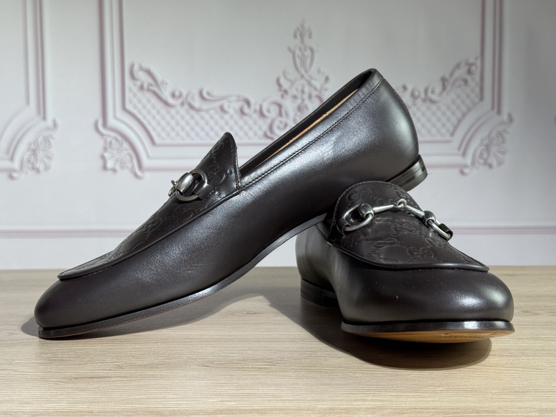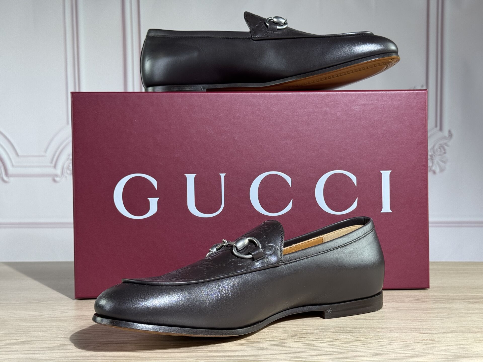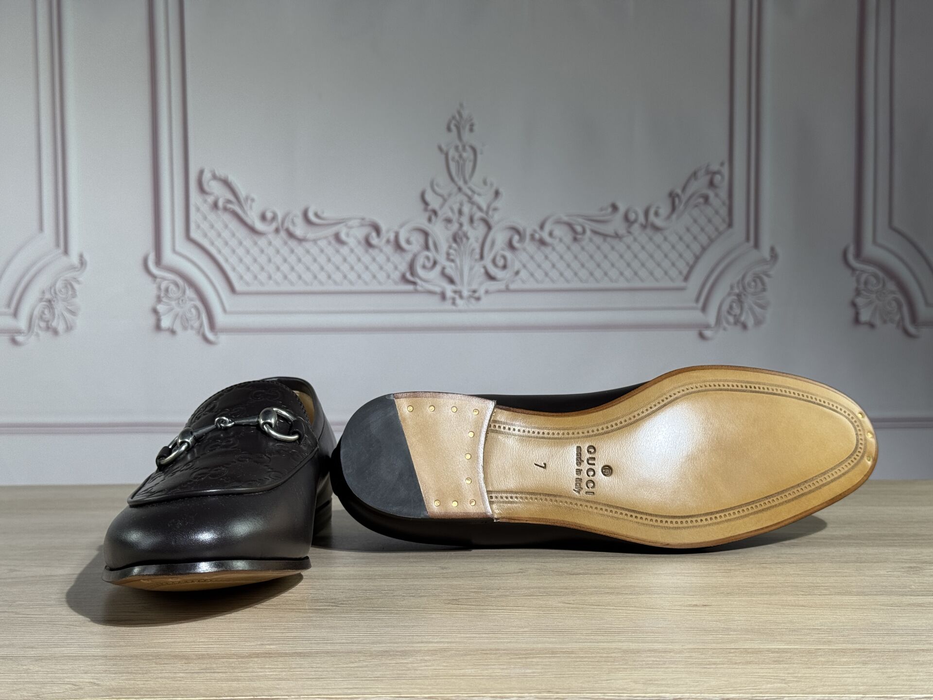 GUCCI - Paire de mocassins en cuir marron, empeigne embossé du signe de la Maison et rehaussé d'une boucle en métal argenté. Dans leur boite. Pointure 7 (soit 41 français environ) Non portés